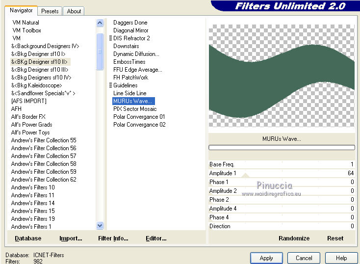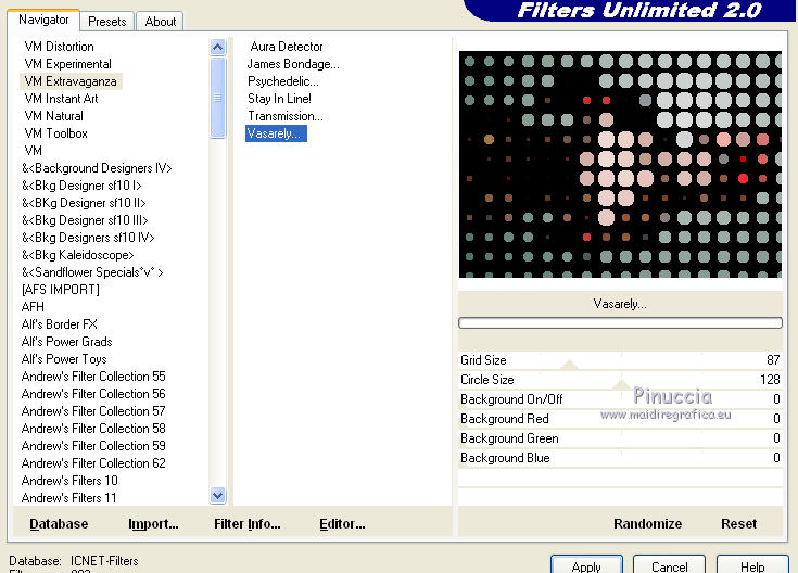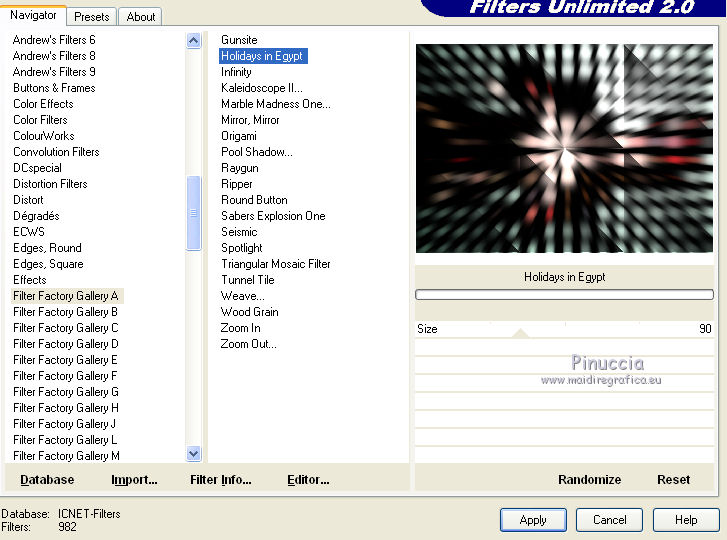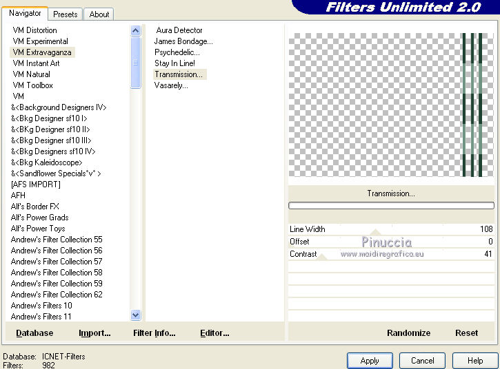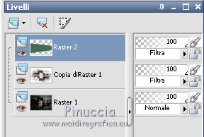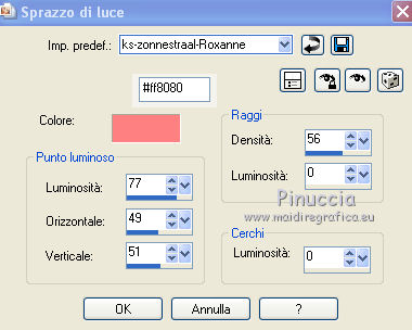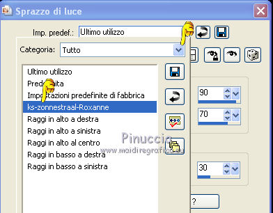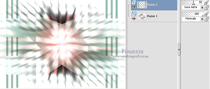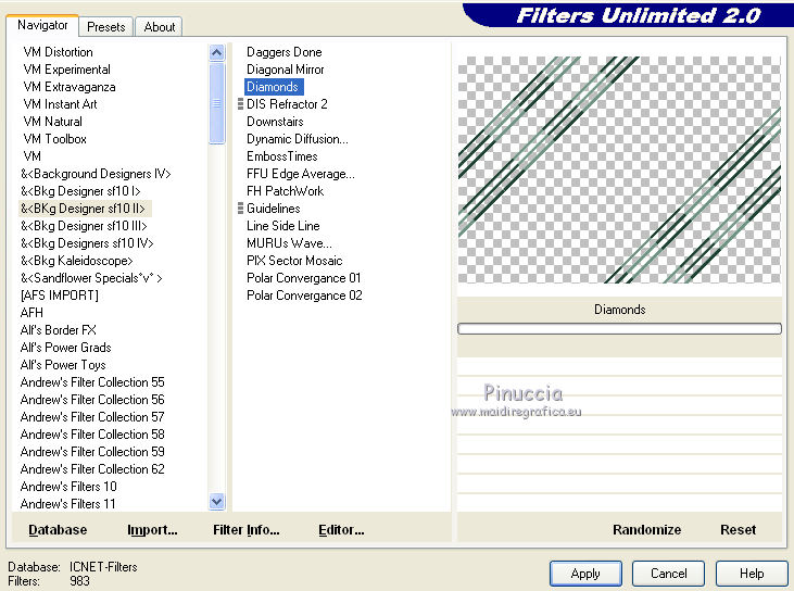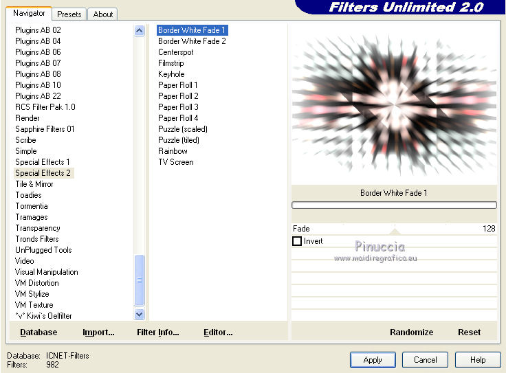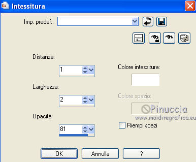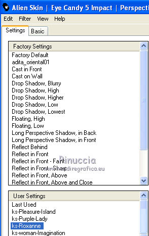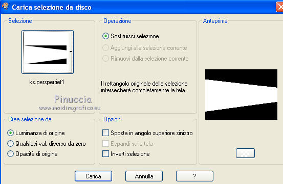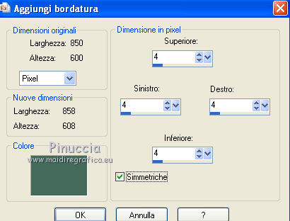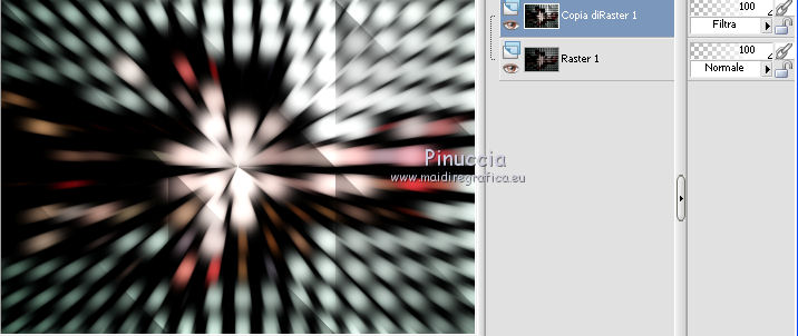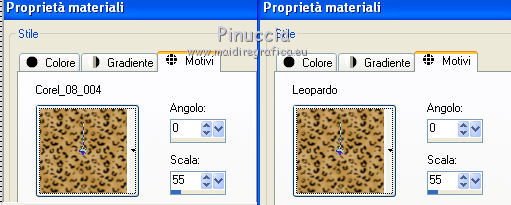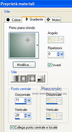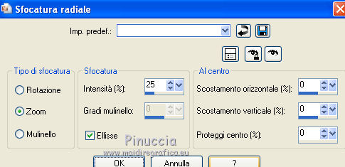 qui puoi trovare qualche risposta ai tuoi dubbi. Se l'argomento che ti interessa non è presente, ti prego di segnalarmelo. Questo tutorial è stato scritto con PSP X2, ma può essere eseguito anche con le altre versioni di PSP. Per tradurlo, ho usato PSP X. Occorrente: Materiale qui Tutto il materiale è di Kitty. Rispetta il lavoro degli autori e mantieni i tubes al loro stato originale. Filtri: in caso di necessità, consulta la sezione filtri qui Alien Skin Eye Candy 5 Impact qui Filters Unlimited 2.0 qui VM Extravaganza qui Filter Factory Gallery A qui Bkg Designers10II (da importare in Filters Unlimited) qui I filtri Factory Gallery per essere usati devono prima essere convertiti. Come fare vedi qui Si usano importandoli in Filters Unlimited (come fare vedi qui) ma possono funzionare anche da soli. Anche i filtri VM si possono usare importandoli in Filters Unlimited. Metti le selezioni ks.perspertief1en e ks-Roxanne nella cartella Selezioni. Metti il preset preset_sunburst_ks-zonnestraal-Roxanne nella cartella Impostazioni predefinite. Metti il preset ks-Roxanne.f1s nella cartella del Filtro (doppio clic sul file e il preset sarà automaticamente installato). Se preferisci, anche in questo caso puoi importarlo direttamente dalla cartella in cui hai scompattato il materiale, quando sarà il momento di usarlo. Vedi la scheda del filtro qui e come importare un preset in Eye Candy qui Il motivo Corel_08_004 è standard nelle versioni superiori di PSP e, nelle versioni precedenti, corrisponde al motivo Leopardo. Se non lo trovi nel tuo PSP metti quello fornito nella cartella Motivi (sulle diverse denominazioni delle cartelle di PSP vedi qui). 1. Apri una nuova immagine 850 x 600 pixels. ![]() Imposta il colore di primo piano con #456a59, e il colore di sfodo con #e0e0e0. Passa il colore di primo piano a Gradiente. ![]() 2. Riempi l'immagine trasparente con il gradiente.Apri il tube kitty-Miss Roxanne.pspimage e vai a Modifica>Copia. non chiuderlo perchè ti servirà ancora Torna al tuo lavoro e vai a Modifica>Incolla come nuovo livello. Immagine>Ruota per gradi - 90 gradi a destra. ![]() Livelli>Unisci>Unisci giù. 3. Effetti>Filters Unlimited 2.0 - VM Extravaganza - Vasarely. ![]() Regola>Sfocatura>Sfocatura radiale. ![]() 4. Livelli>Duplica. Effetti>Plugins>Filters Unlimited - Filter Factory Gallery A - Holidays in Egypt. ![]() Cambia la modalità di miscelatura di questo livello in Filtra. ![]() 5. Livelli>Duplica. Immagine>Rifletti. Immagine>Capovolgi. Livelli>Unisci>Unisci giù. 6. Effetti>Plugins>Filters Unlimited - Special Effects 2 - Border White Fade 1. ![]() Effetti>Effetti di bordo>Aumenta. 7. Livelli>Nuovo livello raster. Selezione>Carica/Salva selezione>Carica selezione da disco. Cerca e carica la selezione ks.perspertief1. ![]() Riporta il colore di primo piano al colore #456a59, e riempi la selezione con il colore di primo piano.Cambia la modalità di miscelatura di questo livello in Filtra. ![]() Selezione>Deseleziona. 8. Effetti>Plugins>Filters Unlimited 2.0 - Bkg Designersf10II - MURUs Wave. ![]() Livelli>Duplica. Immagine>Rifletti. Livelli>Unisci>Unisci giù. Effetti>Effetti di illuminazione>Sprazzo di luce. Apri il menu delle impostazioni: ![]() seleziona il preset Preset_Sunbust_ks-zonnestraal-Roxanne. se hai problemi con i preset, puoi semplicemente impostare i settaggi che vedi nella schermata. ![]() 9. Livelli>Unisci>Unisci giù - 2 volte. Dovresti avere questo. ![]() Livelli>Nuovo livello raster. Selezione>Carica/Salva selezione>Carica selezione da disco. Cerca e carica la selezione ks-Roxanne. ![]() 10. Riempi la selezione con il colore di primo piano #456a59.Selezione>Deseleziona. Effetti>Plugins>Filters Unlimited - VM Extravanza - Transmission. ![]() Livelli>Duplica. Immagine>Rifletti. Livelli>Unisci>Unisci giù. Cambia la modalità di miscelatura di questo livello in Luce netta, e abbassa l'opacità al 55%. ![]() 11. Livelli>Duplica. Effetti>Plugins>Filters Unlimited 2.0 - Bkg Designersf10II - Diamonds. ![]() Livelli>Unisci>Unisci visibile. 12. Apri ks-Roxanne-lijn e vai a Modifica>Copia. Torna al tuo lavoro e vai a Modifica>Incolla come nuovo livello. Effetti>Effetti di bordo>Aumenta. 13. Apri il tube ks-Roxanne tekst e vai a Modifica>Copia. Torna al tuo lavoro e vai a Modifica>Incolla come nuovo livello. Effetti>Effetti di immagine>Scostamento. ![]() 14. Apri ks-lijst-Roxanne. ![]() Modifica>Copia. Torna al tuo lavoro e vai a Modifica>Incolla come nuovo livello. Livelli>Unisci>Unisci visibile. 15. Livelli>Duplica. Immagine>Ridimensiona, all'80%, tutti i livelli non selezionato. 16. Attiva il livello inferiore. Regola>Sfocatura>Sfocatura gaussiana - raggio 10. ![]() 17. Attiva nuovamente il livello superiore. Apri ks-Roxanne-lijst ![]() Modifica>Copia. Torna al tuo lavoro e vai a Modifica>Incolla come nuovo livello. 18. Immagine>Aggiungi bordatura, 4 pixels, simmetriche, con il colore scuro di primo piano. ![]() 19. Seleziona il bordo scuro con la bacchetta magica ![]() Passa il colore di primo piano a Motivi e seleziona il motivo Leopardo o Corel_08_004. ![]() Riempi la selezione con questo motivo.20. Effetti>Effetti di trama>Intessitura. ![]() Selezione>Deseleziona. 21. Attiva nuovamente ks-lijst-Roxanne e vai a Modifica>Copia. Torna al tuo lavoro e vai a Modifica>Incolla come nuovo livello. Cambia la modalità di miscelatura di questo livello in Differenza. ![]() 22. Attiva nuovamente il tube kitty-Miss Roxanne e vai a Modifica>Copia. Torna al tuo lavoro e vai a Modifica>Incolla come nuovo livello. Immagine>Ridimensiona, al 70%, tutti i livelli non selezionato. Sposta il tube a destra.Effetti>Plugins>Alien Skin Eye Candy 5 Impact - Perspective Shadow. Seleziona il preset ks-roxanne e ok. ![]() 22. Aggiungi il tuo nome e/o il tuo watermark su un nuovo livello. Livelli ![]() ![]() ![]() Se hai problemi o dubbi, o trovi un link non funzionante, o anche soltanto per un saluto, scrivimi. 6 Settembre 2011 |