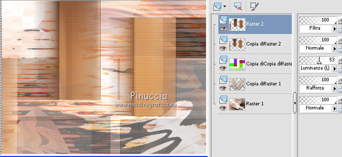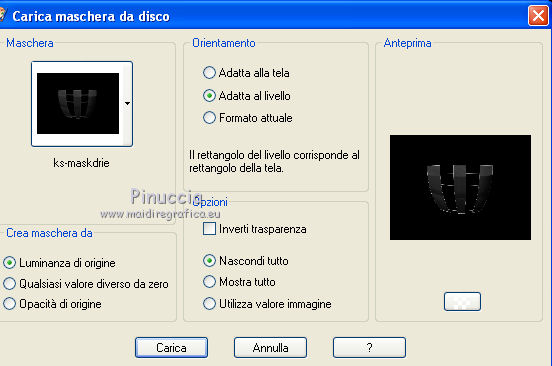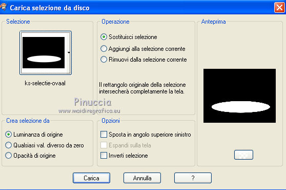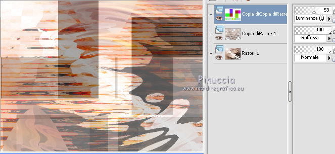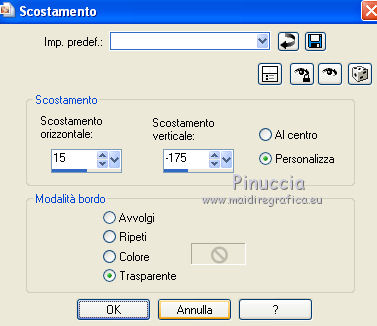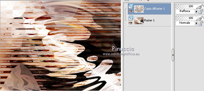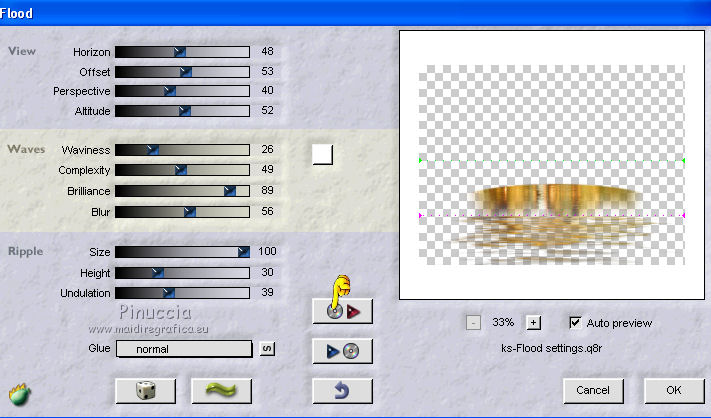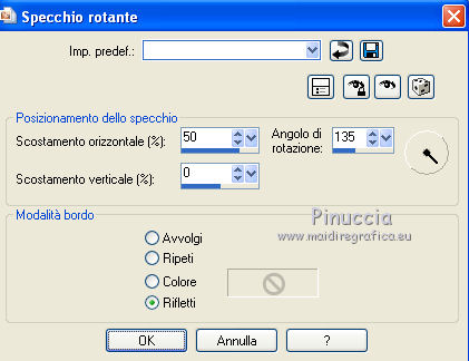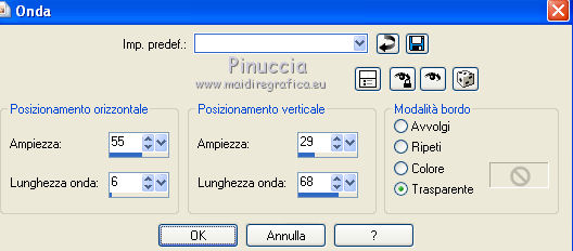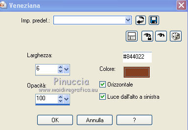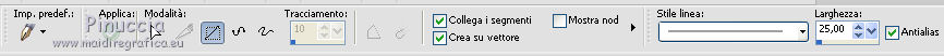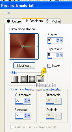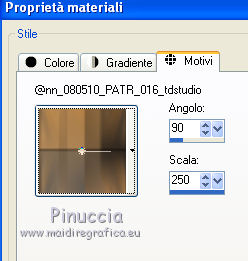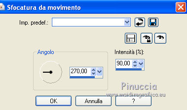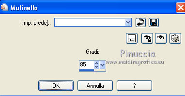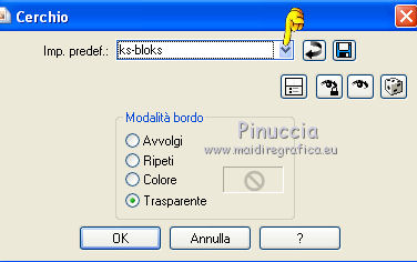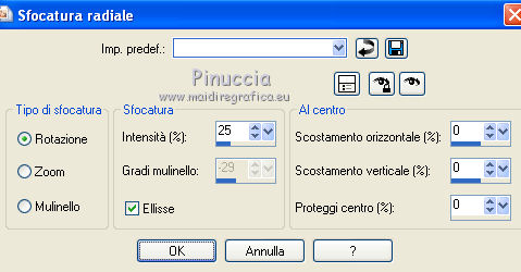 qui puoi trovare qualche risposta ai tuoi dubbi. Se l'argomento che ti interessa non è presente, ti prego di segnalarmelo. Questo tutorial è stato scritto con PSPX2 e tradotto con PSP X, ma può essere eseguito anche con le altre versioni di PSP. Dalla versione X4, il comando Immagine>Rifletti è stato sostituito con Immagine>Capovolgi in orizzontale, e il comando Immagine>Capovolgi con Immagine>Capovolgi in verticale. Nelle versioni X5 e X6, le funzioni sono state migliorate rendendo disponibile il menu Oggetti. Con la nuova versione X7, sono tornati Rifletti>Capovolgi, ma con nuove varianti. Vedi la scheda sull'argomento qui Traduzione francese qui Le vostre versioni quiOccorrente: Materiale qui I tubes usati sono di Kitty Filtri: in caso di necessità, consulta la sezione filtri qui Alien Skin Eye Candy 5 Impact qui Andromeda - Perspective qui FM Tile Tools - Blend Emboss qui Flaming Pear - Flood qui VM Instant Art - Vernissage qui Filters Unlimited 2.0 qui &<Bkg Designer sf10I> (da importare in Unlimited) qui <Bkg Designer sf10III> (da importare in Unlimited) qui I filtri VM Instant Art si possono usare da soli o importati in Filters Unlimited (come fare vedi qui) Se un filtro fornito appare con questa icona ![]() non esitare a cambiare modalità di miscelatura e opacità secondo i colori utilizzati. Nelle ultime versioni di PSP non c'è il gradiente di primo piano/sfondo (Corel_06_029) Puoi usare i gradienti delle versioni precedenti. Trovi qui i gradienti Corel X. * Metti il preset ks-magic-spell Cliccando sul file una o due volte (a seconda delle tue impostazioni), automaticamente il preset si installerà nella cartella corretta. perchè uno o due clic vedi qui * Metti il motivo @nn_080510_patr_016_tdstudio nella cartella Motivi. Se non vuoi appesantire la cartella, aprilo in PSP e minimizzalo. Lo troverai nella lista dei motivi disponibili quando ti servirà. * Metti le selezioni ks-selectie-could-christmas, ks-selectiedriebloks, ks-selectie-ovaal e ks-selectie-ovaal-onder nella cartella Selezioni. * Metti le maschere CrisTaylor_m12 e ks-maskdrie nella cartella Maschere. * Metti il preset circle-ks-bloks nella cartella Impostazioni Predefinite. * Metti il preset ks-flood nella cartella del filtro o lascialo nella cartella in cui hai scompattato il materiale. Apri il resto del materiale in PSP. 1. Apri una nuova immagine trasparente 800 x 600 pixels. ![]() Selezione>Seleziona tutto. Apri l'immagine "BKGGN097x" e vai a Modifica>Copia. Torna al tuo lavoro e vai a Modifica>Incolla nella selezione. Selezione>Deseleziona. 2. Regola>Sfocatura>Sfocatura da movimento. ![]() Regola>Sfocatura>Sfocatura radiale. ![]() 3. Effetti>Plugins>Filters Unlimited 2.0 - Bkg Designer sf10 III - Superchecker3D. ![]() Livelli>Duplica. Effetti>Effetti di distorsione>Onda. ![]() Cambia la modalità di miscelatura di questo livello in Rafforza. ![]() 4. Livelli>Duplica. Effetti>Plugins>VM Instant Art - Vernissage. ![]() Cambia la modalità di miscelatura di questo livello in Luminanza (esistente), e abbassa l'opacità al 53%. ![]() Effetti>Effetti di bordo>Aumenta. 5. Livelli>Nuovo livello raster. Selezione>Carica/Salva selezione>Carica selezione da disco. Cerca e carica la selezione ks-selectiedriebloks. ![]() Passa il colore di primo piano a Motivi e seleziona il motivo @nn_080510_PATR_016_tdstudio con i seguenti settaggi. ![]() Riempi la selezione con questo motivo.6. Effetti>Effetti di trama>Veneziana. ![]() Selezione>Deseleziona. Livelli>Duplica. Effetti>Effetti di distorsione>Vento - da destra, intensità 100. ![]() Livelli>Disponi>Sposta giù. 7. Attiva nuovamente il livello superiore. Cambia la modalità di miscelatura di questo livello in Filtra. ![]() Livelli>Duplica. Effetti>Effetti di distorsione>Vento - da sinistra, intensità 100. ![]() Assicurati di essere posizionato sul livello superiore. Livelli>Unisci>Unisci giù - 2 volte. Effetti>Effetti geometrici>Cerchio. Apri il menu delle impostazioni, seleziona il preset ks-bloks e ok. ![]() 9. Livelli>Duplica. Immagine>Rifletti. Livelli>Unisci>Unisci giù. Dovresti avere questo. ![]() Effetti>Plugins>Filters Unlimited - Bkg Designer sf10 III - 4Way Average. ![]() 10. Livelli>Nuovo livello raster. Selezione>Carica/Salva selezione>Carica selezione da disco. Cerca e carica la selezione ks-selectie-could-christmas. ![]() Apri il tube ks-landschap bird e vai a Modifica>Copia. Torna al tuo lavoro e vai a Modifica>Incolla nella selezione. Selezione>Deseleziona. Livelli>Disponi>Sposta giù. 11. Attiva nuovamente il livello superiore. Imposta il colore di primo piano con il colore bianco. Attiva lo strumento Penna - larghezza 25:![]() 12. Traccia una linea retta come nell'esempio. Per avere una linea perfettamente diritta, tieni premuto il tasto della maiuscola. ![]() Livelli>Converti in livello raster. ![]() Effetti>Effetti di distorsione>Mulinello. ![]() Livelli>Duplica. Immagine>Capovolgi. Livelli>Unisci>Unisci giù. Cambia la modalità di miscelatura di questo livello in Sovrapponi. ![]() Livelli>Disponi>Sposta giù. Attiva il livello superiore. 13. Livelli>Nuovo livello raster. Imposta il colore di primo piano con #9a543b, e il colore di sfondo con #5e1710. Passa il colore di primo piano a Gradiente radiale. ![]() 14. Riempi il livello con il gradiente.Livelli>Carica/Salva maschera>Carica maschera da disco. Cerca e carica la maschera Cris Taylor_m12. ![]() Livelli>Unisci>Unisci gruppo. Livelli>Disponi>Sposta giù - 2 volte. Cambia la modalità di miscelatura di questo livello in Moltiplica, e abbassa l'opacità al 76%. ![]() 15. Regola>Sfocatura>Sfocatura da movimento. ![]() Livelli>Unisci>Unisci visibile. Livelli>Nuovo livello raster. Riempi con il gradiente del punto 13.Livelli>Carica/Salva maschera>Carica maschera da disco. Cerca e carica la maschera ks-maskdrie. ![]() Livelli>Unisci>Unisci gruppo. 16. Cambia la modalità di miscelatura di questo livello in Moltiplica. ![]() Effetti>Effetti di immagine>Scostamento. ![]() 17. Apri il tube rw-cityl