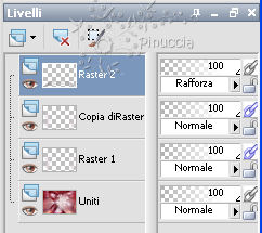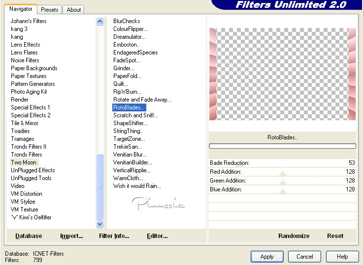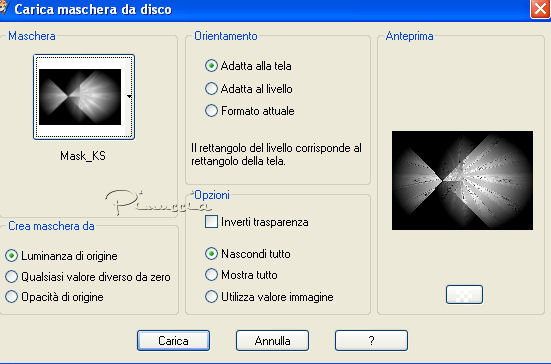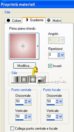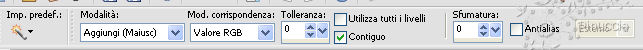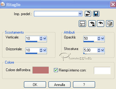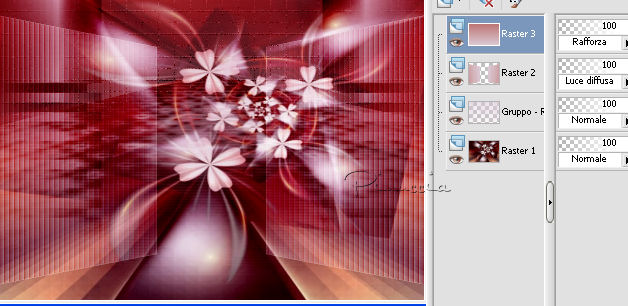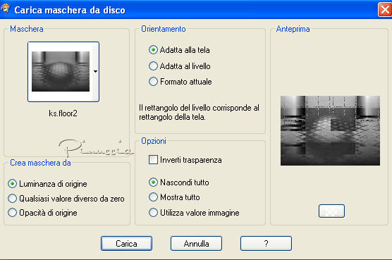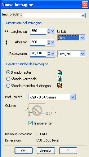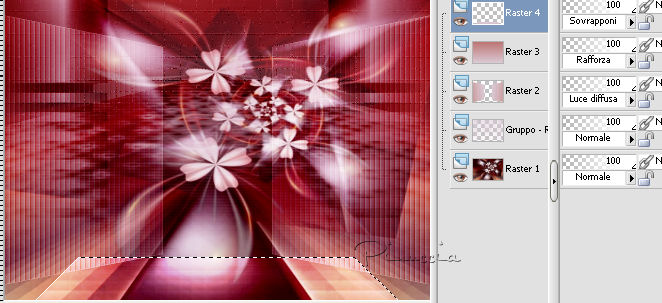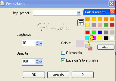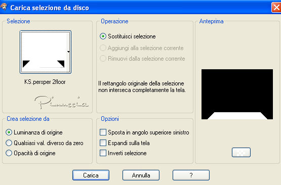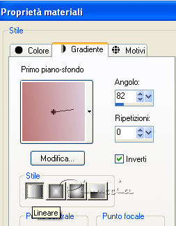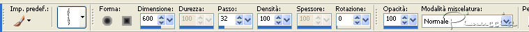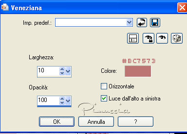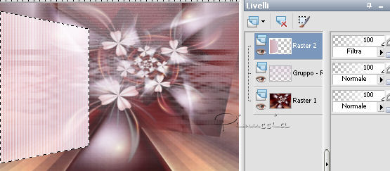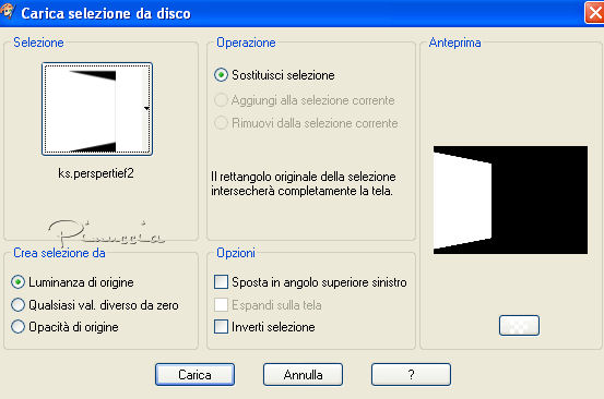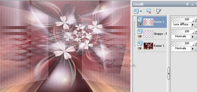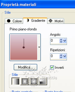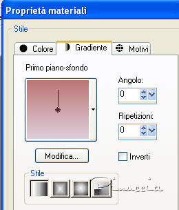 qui puoi trovare qualche risposta ai tuoi dubbi. Se l'argomento che ti interessa non è presente, ti prego di segnalarmelo. Questo tutorial è stato scritto con PSP X2, ma può essere eseguito anche con le altre versioni di PSP. Per tradurlo, ho usato PSP X. Occorrente: Materiale qui Rispetta il lavoro degli autori e mantieni i tubes al loro stato originale. Filtri: Alien Skin Eye Candy 5 Impact qui Filters Unlimited 2.0 qui Two Moon qui I filtri Two Moon si possono usare sia da soli, che importandoli in Filters Unlimited Metti le selezioni ks.perspectief2 e ks.persper_2floor nella cartella Selezioni. Metti le maschere Mask_KS e ks.floor2 nella cartella Maschere, Metti i preset KS.flower1 e ks.magic-spell nella cartella del filtro Alien Skin Eye Candy 5 Impact>Settings>Shadow. Se preferisci, puoi importarli, quando ti serviranno, direttamente dalla cartella in cui hai scompattato il materiale. Vedi la scheda del filtro qui e come importare un preset in Eye Candy qui Metti i pennelli DreamBrushes3_12, floral.vertical2 e bsilvia_gbg_foliage01_9_v7_2 nella cartella Pennelli. Se hai problemi con i pennelli vedi alcuni appunti qui 1. Apri una nuova immagine trasparente 850 x 600 pixels. ![]() Selezione>Seleziona tutto. 2. Apri l'immagine "Memories" e vai a Modifica>Copia. Torna al tuo lavoro e vai a Modifica>Incolla nella selezione. Selezione>Deseleziona. 3. Livelli>Nuovo livello raster. Imposta il colore di primo piano con #ddceda, e riempi il livello con questo colore.4. Livelli>Carica/Salva maschera>Carica maschera da disco. Cerca e carica la maschera ks.floor2. ![]() Livelli>Unisci>Unisci gruppo. 5. Selezione>Carica/Salva selezione>Carica selezione da disco. Cerca e carica la selezione ks.perspectief2. ![]() Il colore di primo piano è impostato con #ddceda. Imposta il colore di sfondo con #bc7573. Passa il colore di primo piano a Gradiente. ![]() Livelli>Nuovo livello raster. Riempi la selezione con il gradiente.7. Effetti>Effetti di trama>Veneziana, con il colore di primo piano. ![]() Cambia la modalità di miscelatura di questo livello in Filtra. ![]() Effetti>Effetti di bordo>Aumenta. 8. Selezione>Deseleziona. Livelli>Duplica. Immagine>Rifletti. Livelli>Unisci>Unisci giù. Cambia la modalità di miscelatura di questo livello in Luce diffusa. ![]() 9. Livelli>Nuovo livello raster. Cambia i settaggi del gradiente. ![]() Riempi il nuovo livello con questo gradiente.Cambia la modalità di miscelatura di questo livello in Rafforza. ![]() 10. Livelli>Nuovo livello raster. Selezione>Carica/Salva selezione>Carica selezione da disco. Cerca e carica la selezione ks.persper_2floor. ![]() Cambia i settaggi del gradiente selezionando Inverti. ![]() Riempi la selezione con questo gradiente.Effetti>Effetti di trama>Veneziana. ![]() Cambia la modalità di miscelatura di questo livello in Sovrapponi. ![]() Selezione>Deseleziona. 11. Imposta il colore di primo piano con #bc7573, e il colore di sfondo con il bianco. Passa il colore di primo piano a Gradiente. ![]() 12. Livelli>Nuovo livello raster. Riempi il nuovo livello con il gradiente.Livelli>Carica/Salva maschera>Carica maschera da disco. Cerca e carica la maschera mask_ks. ![]() Livelli>Unisci>Unisci gruppo. Effetti>Effetti 3D>Ritaglio, con il colore #bc7573. ![]() 13. Livelli>Unisci>Unisci tutto. Livelli>Nuovo livello raster. Imposta nuovamente il colore di primo piano con #ddceda. Attiva lo strumento pennello ![]() cerca e seleziona il pennello floral verticaal 2, e applicalo due volte a sinistra cliccando con il tasto sinistro del mouse per usare il colore di primo piano. ![]() 14. Livelli>Duplica. Immagine>Rifletti. Immagine>Ridimensiona, all'80%, tutti i livelli non selezionato. 15. Sposta questo pennello in basso a destra.![]() Livelli>Unisci>Unisci giù. Livelli>Duplica. se il tuo PSP non supporta pennelli superiori a 500 pixels, apri il pennello in PSP. Immagine>Ridimensiona - a 500 pixels (in questo caso 500 pixels di altezza). File>Esporta>Pennello personalizzato, assegna un nome al pennello e ok. 16. Livelli>Nuovo livello raster. Cerca e seleziona il pennello dreambruche3 e applicalo cliccando una volta in basso a sinistra, sempre con il tasto sinistro del mouse per usare il colore di primo piano. ![]() Livelli>Duplica. Immagine>Rifletti. Livelli>Unisci>Unisci giù. anche questo pennello supera i 500 pixels (questa volta in larghezza). Se il tuo PSP non supporta pennelli superiori a 500 pixels, usa il procedimento indicato al punto precedente. Effetti>Plugins>Alien Skin Eye Candy 5 Impact - Perspective Shadow: seleziona il preset ks.flower1 e ok. ![]() Cambia la modalità di miscelatura di questo livello in Rafforza. ![]() Livelli>Disponi>Sposta giù. Livelli>Unisci>Unisci tutto. 19. Apri il tube kittys-rosedresslady e vai a Modifica>Copia. Torna al tuo lavoro e vai a Modifica>Incolla come nuovo livello. Immagine>Ridimensiona, al 70%, tutti i livelli non selezionato. Spostalo in basso al centro, come nel mio esempio.20. Effetti>Plugins>Alien Skin Eye Candy 5 Impact - Perspective Shadow seleziona il preset ks.magic-spell e ok. ![]() Immagine>Aggiungi bordatura, simmetriche non selezionato, con il colore di primo piano. ![]() 22. Seleziona il bordo rosa con la bacchetta magica ![]() ![]() Livelli>Nuovo livello raster. Il colore di primo è impostato con #ddceda. Imposta nuovamente il colore di sfondo con #bc7573. Passa il colore di primo piano a Gradiente, come al punto 9, inverti selezionato. ![]() Riempi il nuovo livello con questo gradiente.23. Effetti>Effetti di trama>Veneziana, con il colore di sfondo #bc7573. ![]() Selezione>Deseleziona. 24. Effetti>Plugins>Two Moon - RotoBlades. ![]() Effetti>Effetti di bordo>Erodi. 25. Livelli>Nuovo livello raster. Imposta il colore di primo piano con #a53a49. Attiva lo strumento Pennello ![]() cerca e seleziona il pennello bsilvia_gbg_foliage 01. ![]() Applica il pennello a sinistra, cliccando due volte con il tasto sinistro del mouse per usare il colore di primo piano. anche questo pennello supe