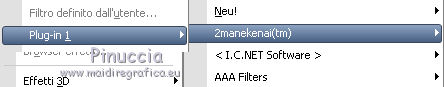 qui puoi trovare qualche risposta ai tuoi dubbi. Se l'argomento che ti interessa non è presente, ti prego di segnalarmelo. Questo tutorial è stato scritto con PSP X2, ma può essere eseguito anche con le altre versioni di PSP. Per tradurlo, ho usato PSP X. Occorrente: Materiale qui Rispetta il lavoro degli autori e mantieni i tubes al loro stato originale. Filtri: in caso di necessità, consulta la sezione filtri qui Italian Editors - Effetto Fantasma qui Mezzoforce-ice qui 1. Apri una nuova immagine trasparente 650 x 500 pixels. Imposta il colore di primo piano con il colore #b5c2ca, e riempi l'immagine trasparente con questo colore.Livelli>Nuovo livello raster. Selezione>Seleziona tutto. 2. Apri l'immagine "aqua_002". Immagine>Rifletti. Immagine>Copia. Torna al tuo lavoro e vai a Modifica>Incolla nella selezione. Selezione>Deseleziona. Premi il tasto D per attivare lo strumento Puntatore e tira l'immagine un po' a sinistra.![]() 3. Effetti>Plugins>2manekenai(tm) - Mezzoforce-Ice. la denominazione del filtro lo colloca in cima alla lista, prima della lettera A ![]() ![]() Abbassa l'opacità di questo livello al 63%. Regola>Messa a fuoco>Accentua messa a fuoco. 4. Apri il tube MC1240 e vai a Modifica>Copia. Torna al tuo lavoro e vai a Modifica>Incolla come nuovo livello. Immagine>Rifletti. Immagine>Ridimensiona, al 90%, tutti i livelli non selezionato. Sposta il tube a destra.Abbassa l'opacità di questo livello all'83%. Regola>Messa a fuoco>Metti a fuoco. 5. Apri il tube "Music" e vai a Modifica>Copia. Torna al tuo lavoro e vai a Modifica>Incolla come nuovo livello. Immagine>Ridimensiona, all'80%, tutti i livelli non selezionato. Spostalo in basso a sinistra.Cambia la modalità di miscelatura di questo livello in Luminanza (esistente), e abbassa l'opacità di questo livello al 50%. Livelli>Unisci>Unisci tutto. Duplica l'immagine usando la combinazione di tasti maiuscola+D. Su questa copia: Livelli>Innalza livello di sfondo. 6. Effetti>Plugins>Italian Editors - Effetto Fantasma. ![]() Regola>Messa a fuoco>Maschera di contrasto. ![]() 7. Livelli>Nuovo livello raster. Attiva lo strumento Pennello ![]() cerca e seleziona il pennello "Ann", dimensione 700. Imposta il colore di primo piano con #494c60, e applica il pennello con questo colore. Se il tuo PSP non supporta pennelli superiori a 500 pixels, apri il pennello in PSP. Immagine>Ridimensiona, a 500 pixels di larghezza. File>Esporta>Pennello personalizzato, assegna un nome al pennello e ok. Una volta applicato il pennello, premi il tasto D e "tira" il pennello fino a riempire tutta l'area della tela. Livelli>Unisci>Unisci tutto. 8. Attiva il livello originale. Immagine>Ridimensiona, all'80%, tutti i livelli selezionato. Modifica>Copia. Torna alla seconda immagine con il pennello e vai a Modifica>Incolla come nuovo livello. 9. Effetti>Effetti 3D>Sfalsa ombra. ![]() Ripeti l'Effetto Sfalsa ombra, cambiando verticale e orizzontale con -3. 10. Apri il file di testo "tekst" e vai a Modifica>Copia. Torna al tuo lavoro e vai a Modifica>Incolla come nuovo livello. Spostalo in basso a sinistra.Effetti>Effetti 3D>sfalsa ombra, con i settaggi precedenti, senza ripetizione. Aggiungi il tuo nome e/o il tuo watermark su un nuovo livello. 11. Livelli>Unisci>Unisci tutto e salva in formato jpg.