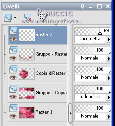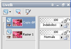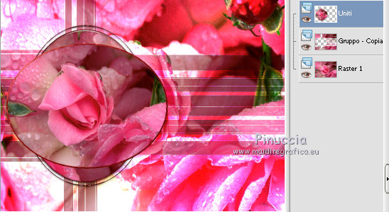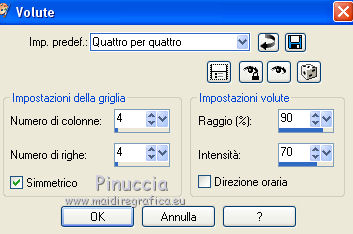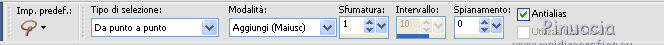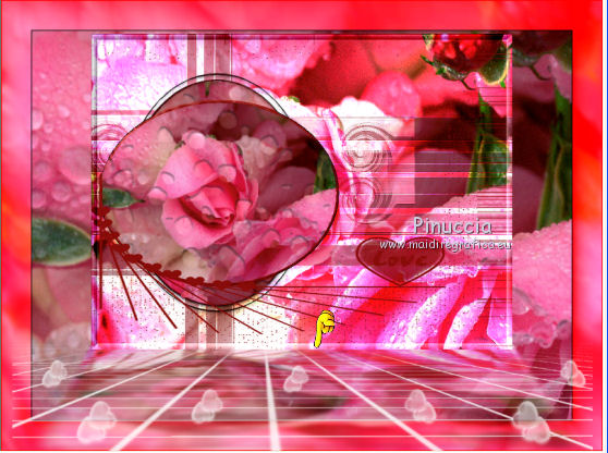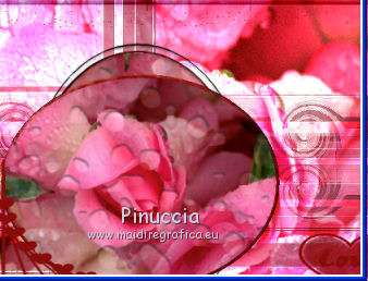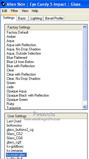 qui puoi trovare qualche risposta ai tuoi dubbi. Se l'argomento che ti interessa non è presente, ti prego di segnalarmelo. Questo tutorial è stato scritto con PSPX2 e tradotto con PSPX, ma può essere eseguito anche con le altre versioni di PSP. Dalla versione X4, il comando Immagine>Rifletti è stato sostituito con Immagine>Capovolgi in orizzontale, e il comando Immagine>Capovolgi con Immagine>Capovolgi in verticale. Nelle versioni X5 e X6, le funzioni sono state migliorate rendendo disponibile il menu Oggetti. Con la nuova versione X7, sono tornati Rifletti>Capovolgi, ma con nuove varianti. Vedi la scheda sull'argomento qui traduzione in francese quiOccorrente: Materiale qui Tutto il materiale è di Kitty Filtri: in caso di necessità, consulta la sezione filtri qui Alien Skin Eye Candy 5 Impact - Glass, Perspective Shadow qui AAA Frames - Foto Frame qui Filters Unlimited 2.0 qui Alien Skin Eye Candy 5 Nature - Water Drops qui Metti le maschere 1112npv e sg_valentine12 nella cartella Maschere. Metti la selezione ks-selectie-cirkel nella cartella Selezioni. Metti i pennelli ks-floor-roses02 e ks-randCC con i rispettivi script BrushTip-ks-floor-roses02 e BrushTip-ks-randCC nella cartella Pennelli (vedi gli appunti sui pennelli qui Metti i preset ks-roses-glas e ks-roses-perspertief nelle cartelle del filtro Alien Skin Eye Candy Impact 5>Settings>Glass/Shadow. Se preferisci puoi importarli direttamente dalla cartella in cui hai scompattato il materiale. Vedi la scheda del filtro qui e come importare un preset in Eye Candy qui Apri il resto del materiale in PSP. 1. Apri una nuova immagine trasparente 800 x 600 pixels. ![]() Selezione>Seleziona tutto. Apri l'immagine in jpg "roses" e vai a Modifica>Copia. Torna al tuo lavoro e vai a Modifica>Incolla nella selezione. Selezione>Deseleziona. 2. Livelli>Duplica. Cambia la modalità di miscelatura di questo livello in Indebolisci. ![]() Livelli>Carica/Salva maschera>Carica maschera da disco. Cerca e carica la maschera 1112npv. ![]() Livelli>Unisci>Unisci gruppo. Effetti>Effetti di bordo>Aumenta. 3. Livelli>Nuovo livello raster. Selezione>Carica/Salva selezione>Carica selezione da disco. Cerca e carica la selezione ks-selectie-cirkel. ![]() Modifica>Incolla nella selezione (l'immagine roses è ancora in memoria). Mantieni selezionato. 4. Livelli>Nuovo livello raster. Imposta il colore di primo piano con #880d0a, e riempi la selezione con questo colore.Selezione>Modifica>Contrai - 4 pixels. ![]() Premi sulla tastiera il tasto CANC. Selezione>Deseleziona. 5. Effetti>Effetti 3D>Smusso a incasso. ![]() Livelli>Duplica. Immagine>Ruota per gradi - 90 gradi a destra. ![]() 6. Apri il tube ks-roses e vai a Modifica>Copia. Torna al tuo lavoro e vai a Modifica>Incolla come nuovo livello e non spostarlo. Effetti>Effetti di immagine>Scostamento. ![]() Livelli>Unisci>Unisci giù. 7. Effetti>Plugins>Alien Skin Eye Candy 5 Impact - Glass. Seleziona il preset ks-roses-glass e ok. ![]() Livelli>Disponi>Sposta giù - 2 volte. Attiva il livello superiore. Livelli>Unisci>Unisci giù - 2 volte. E dovresti avere questo. ![]() 8. Effetti>Plugins>Alien Skin Eye Candy 5 Nature - Water Drops. Seleziona il preset Medium Clear, Strong Refraction e ok. ![]() Effetti>Effetti di bordo>Erodi. 9. Livelli>Nuovo livello raster. Riempi con il colore di primo piano #880d0a.Livelli>Carica/Salva maschera>Carica maschera da disco. Cerca e carica la maschera sg_valentine12. ![]() Livelli>Unisci>Unisci gruppo. 10. Effetti>Effetti di immagine>Scostamento. ![]() Attiva lo strumento Selezione a mano libera da punto a punto.![]() Traccia una selezione come nell'esempio (devi selezionare la cornice superiore della maschera). ![]() Premi sulla tastiera il tasto CANC. Selezione>Deseleziona. 11. Imposta il colore di primo piano con il colore bianco. Livelli>Nuovo livello raster. Attiva lo strumento Pennello ![]() cerca e seleziona il pennello ks-randCC e imposta la rotazione a 90. ![]() Applica il pennello una volta a destra, cliccando con il tasto sinistro del mouse per usare il colore bianco di primo piano. ![]() Livelli>Duplica, e spostalo un po' più in basso.Livelli>Duplica, e spostalo un po' più in basso.![]() 12. Livelli>Unisci>unisci giù - 2 volte. Cambia la modalità di miscelatura di questo livello in Luce netta, e abbassa l'opacità al 69%. ![]() Effetti>Effetti di distorsione>Vento - da sinistra, intensità 100. ![]() 13. Effetti>Effetti di distorsione>Volute. ![]() Livelli>Duplica. Immagine>Capovolgi. Posiziona le immagini una contro l'altra, come nell'esempio.![]() Livelli>Unisci>Unisci giù. Cambia la modalità di miscelatura di questo livello in Sovrapponi. ![]() Effetti>Effetti di bordo>Aumenta. Sposta l'immagine un po' più a sinistra.![]() Livelli>Duplica. Immagine>Rifletti. Livelli>Disponi>Sposta giù - 3 volte. ![]() 14. Livelli>Unisci>Unisci visibile. Effetti>Plugins>Filters Unlimited - Buttons & Frames - 3D Glass Frame 3. ![]() Immagine>Ridimensiona, al 70%, tutti i livelli selezionato. Metti da parte l'immagine per il momento. *** 15. Inserisco il punto 15 per dovere di cronaca (e se utilizzi un'altra immagine), perchè confrontando il risultato con il tutorial originale ho realizzato che l'immagine ks-roses non è quella che avrebbe dovuto essere usata. Apri una nuova immagine trasparente 800 x 600 pixels. Selezione>Seleziona tutto. Apri l'immagine ks-roses e vai a Modifica>Copia. Torna all'immagine trasparente e vai a Modifica>Incolla nella selezione. Selezione>Deseleziona. Effetti>Plugins>AAA Frame - Foto Frame. ![]() Per ottenere il risultato del tutorial, ho apportato delle varianti, ottenendo un'immagine di sfondo simile a quella del tutorial originale. La trovi nel materiale con il nome "sfondo fotoframe". *** Apri l'immagine "sfondo fotoframe" e vai a Modifica>Copia. Attiva il lavoro che hai minimizzato prima e vai a Modifica>Incolla come nuovo livello. Effetti>Effetti di immagine>Scostamento. ![]() 16. Effetti>Plugins>Alien Skin Eye Candy 5 Impact - Perspecti