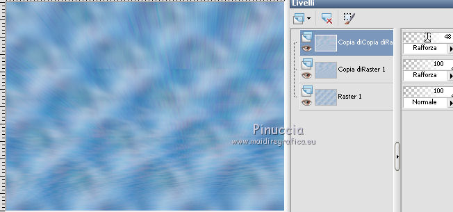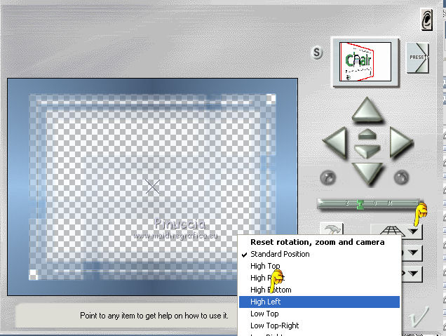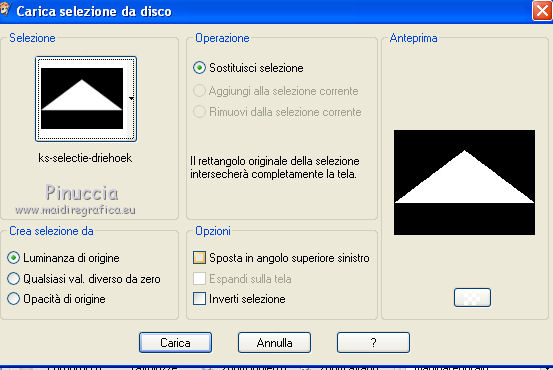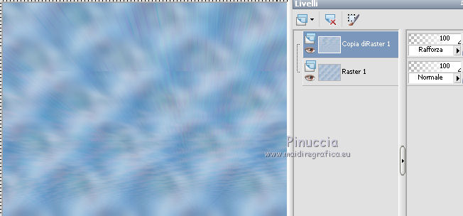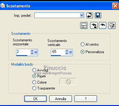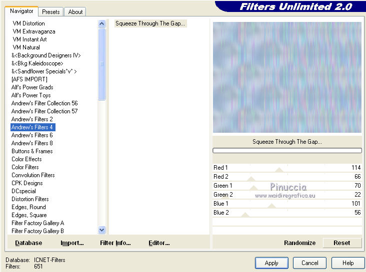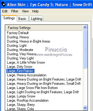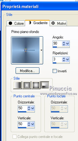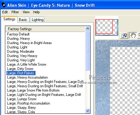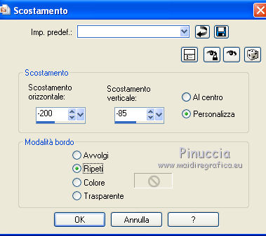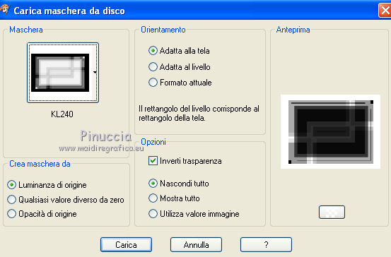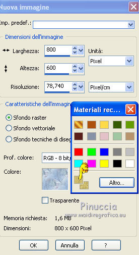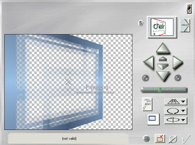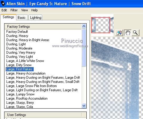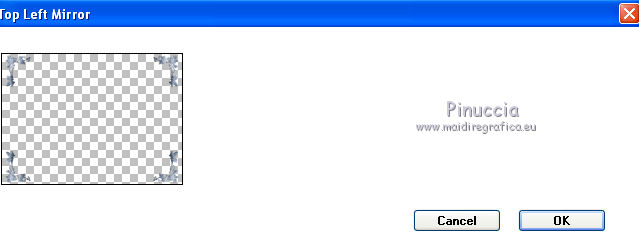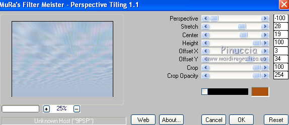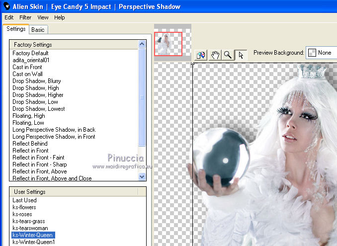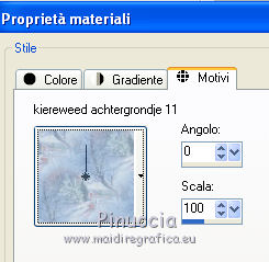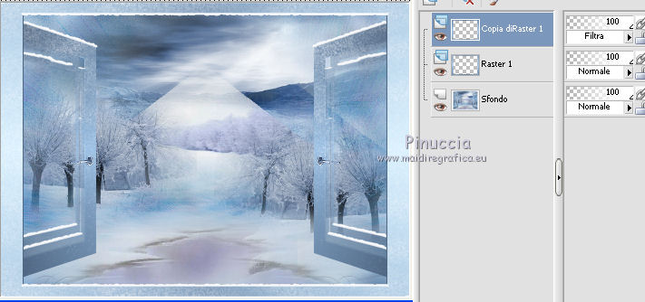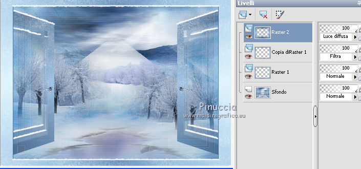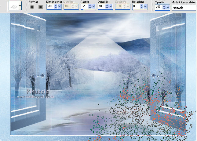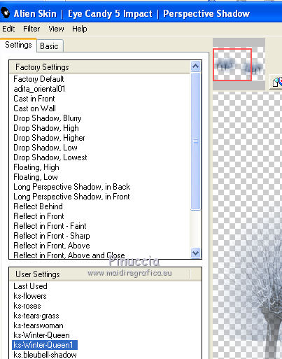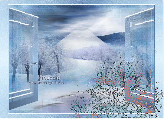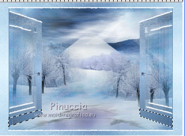 qui puoi trovare qualche risposta ai tuoi dubbi. Se l'argomento che ti interessa non è presente, ti prego di segnalarmelo. Questo tutorial è stato scritto con PSP X2, ma può essere eseguito anche con le altre versioni di PSP. Per tradurlo, ho usato PSP X. Occorrente: Materiale qui I tubes sono di Kitty Rispetta il lavoro degli autori e mantieni i tubes al loro stato originale. Filtri: in caso di necessità, consulta la sezione filtri qui Alien Skin Eye Candy 5 Impact qui Alien Skin Eye Candy 5 Nature qui Andromeda - Perspective qui Mura's Meister - Cloud qui FM Tile Tools - Blend Emboss qui Simple qui Filters Unlimited 2.0 qui Andrew's Filter 4 qui I filtri Andrew's per essere usati devono prima essere convertiti. Come fare vedi qui Si usano importandoli in Filters Unlimited (come fare vedi qui) ma possono funzionare anche da soli Metti la maschera KL240 nella cartella Maschere. Metti le selezioni ks-selectie-driehoek nella cartella Selezioni. Apri il pennello treeextension_1 in PSP ed esportalo come Pennello personalizzato. Attenzione, se il tuo PSP non supporta pennelli superiori a 500 pixels, prima di esportarlo, devi ridimensionarlo a 500 pixels di larghezza. Metti i preset ks-winter-queen e ks-winter-queen1 nella cartella del filtro Alien Skin Eye Candy Impact 5>Settings>Perspective Shadow. Se preferisci puoi importarlo direttamente dalla cartella in cui hai scompattato il materiale. Vedi la scheda del filtro qui e come importare un preset in Eye Candy qui Apri il resto del materiale in PSP. 1. Passa il colore di primo piano a Motivi. Apri il menu dei motivi e vedrai, oltre ai motivi disponibili, la lista dei files aperti in PSP. Seleziona l'immagine kiereweed_achtergrondje_11 con i seguenti settaggi. ![]() 2. Apri una nuova immagine 800 x 600 pixels, colore di sfondo: il motivo di primo piano. ![]() Regola>Sfocatura>Sfocatura gaussiana - raggio 12. ![]() 3. Livelli>Duplica. Effetti>Plugins>Filters Unlimited 2.0 - Andrew's Filter 4 - Squeeze Through the Gap... ![]() 4. Effetti>Plugins>Mura's Meister - Perspective Tiling. ![]() Cambia la modalità di miscelatura di questo livello in Rafforza. ![]() Livelli>Duplica. Effetti>Effetti di immagine>Scostamento. ![]() Lascia la modalità di miscelatura in Rafforza e abbassa l'opacità al 48%. ![]() Livelli>Unisci>Unisci giù. 5. Effetti>Plugins>Alien Skin Eye Candy 5 Nature - Snow Drift. Settings: Large, FirstFlakes e ok. ![]() Effetti>Effetti di bordo>Aumenta. 6. Apri il tube MistedBack07-Isa e vai a Modifica>Copia. Torna al tuo lavoro e vai a Modifica>Incolla come nuovo livello. Spostalo in alto a destra.Regola>Tonalità e saturazione>Viraggio. ![]() 7. Livelli>Nuovo livello raster. Selezione>Carica/Salva selezione>Carica selezione da disco. Cerca e carica la selezione ks-selectie-driehoek. ![]() Apri il tube "winterplaatje" e vai a Modifica>Copia. Torna al tuo lavoro e vai a Modifica>Incolla nella selezione. Selezione>Deseleziona. 8. Livelli>Duplica. Immagine>Ridimensiona, al 160%, tutti i livelli non selezionato. Cambia la modalità di miscelatura di questo livello in Rafforza. ![]() 9. Apri il tube "snow" e vai a Modifica>Copia. Torna al tuo lavoro e vai a Modifica>Incolla come nuovo livello. Spostalo a sinistra, al centro.![]() 10. Livelli>Duplica. Immagine>Rifletti. Effetti>Effetti di immagine>Scostamento. ![]() Livelli>Unisci>Unisci giù. 11. Effetti>Plugins>Alien Skin Eye Candy 5 Impact - Perspective Shadow, seleziona il preset ks-Winter-Queen1 e ok. ![]() 12. Apri il tube ks-snowvlak e vai a Modifica>Copia. Torna al tuo lavoro e vai a Modifica>Incolla come nuovo livello. Spostalo in basso.Effetti>Plugins>FM Tile Tools - Blend Emboss, con i settaggi standard. ![]() Attiva lo strumento Gomma e cancella il bordo netto del tube evidenziato dal filtro:![]() 13. Livelli>Nuovo livello raster. Imposta il colore di primo piano con #9ac0e5, e il colore di sfondo con #455a75. Passa il colore di primo piano a Gradiente radiale, con i seguenti settaggi. ![]() Riempi il livello con il gradiente.Livelli>Carica/Salva maschera>Carica maschera da disco. Cerca e carica la maschera KL240. ![]() Livelli>Unisci>Unisci gruppo. Effetti>Effetti di bordo>Aumenta. Modifica>Copia. Modifica>Incolla come nuova IMMAGINE, e minimizza questa immagine che ti servirà più tardi. 15. Torna al tuo lavoro. Effetti>Plugins>Andromeda - Perspective. Clicca prima su Reset per annullare eventuali precedenti impostazioni memorizzate dal filtro. Clicca poi sull'icona indicata dalla manina e seleziona High Left. ![]() Nella finestra di anteprima vedrai l'immagine come nell'esempio. ![]() Tieni premuto il mouse sull'immagine nell'anteprima e spostala come visualizzato nella schermata. Clicca sul segno di spunta per applicare il filtro. ![]() Livelli>Duplica. Immagine>Rifletti. Livelli>Unisci>Unisci giù. Effetti>Plugins>Alien Skin Eye Candy 5 Nature - Snow Drift, con i settaggi precedenti. ![]() 17. Apri il tube "gerdadeurknop" e vai a Modifica>Copia. Torna al tuo lavoro e vai a Modifica>Incolla come nuovo livello. Posizionalo sullo stipite sinistro della finestra.Regola>Tonalità e saturazione>Viraggio, con i settaggi precedenti. 18. Livelli>Duplica. Immagine>Rifletti. Livelli>Unisci>Unisci giù. Effetti>Effetti di bordo>Aumenta. 19. Livelli>Unisci>Unisci visibile. Immagine>Aggiungi bordatura, 2 pixels, simmetriche, con il colore #455a75. ![]() Immagine>Dimensione tela - 900 x 650 pixels, sfondo bianco. ![]() 20. Seleziona il bordo bianco con la bacchetta magica ![]() Livelli>Nuovo livello raster. Attiva l'immagine della maschera che hai minimizzato al punto 14. ![]() Modifica>Copia. Torna al tuo lavoro e vai a Modifica>Incolla nella selezione. Selezione>Deseleziona. 21. Di nuovo Effetti>Plugins>Alien Skin Eye Candy 5 Nature - Snow Drift. ![]() 22. Livelli>Duplica. Immagine>Capovolgi. Cambia la modalità di miscelatura di questo livello in Filtra. ![]() 22. Selezione>Seleziona tutto. Livelli>Nuovo livello raster. Modifica>Incolla nella selezione (l'immagine della maschera