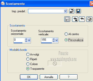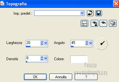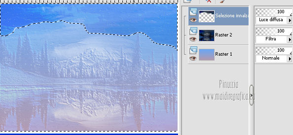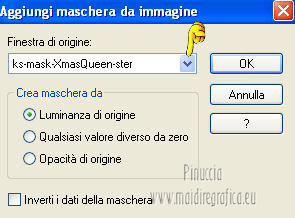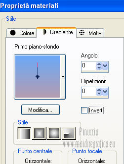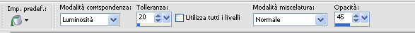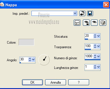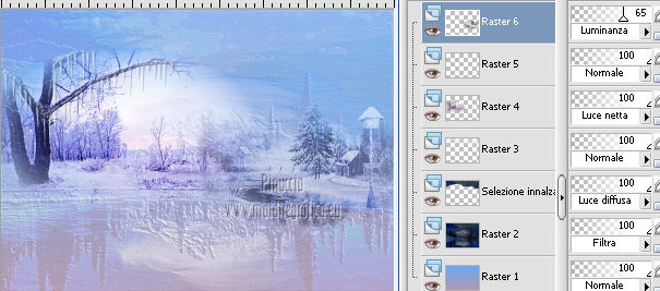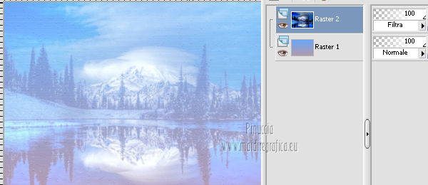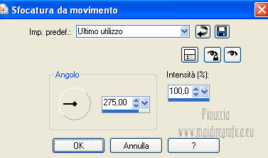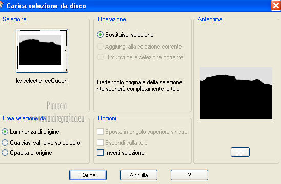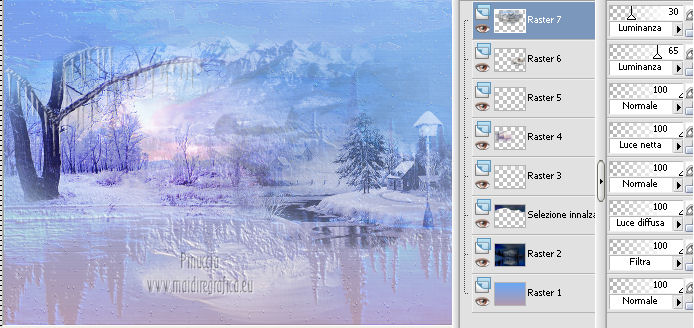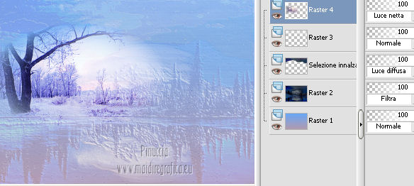 qui puoi trovare qualche risposta ai tuoi dubbi. Se l'argomento che ti interessa non è presente, ti prego di segnalarmelo. Questo tutorial è stato scritto con PSP X2 e tradotto con PSPX, ma può essere eseguito anche con le altre versioni di PSP. Per tradurlo, ho usato PSP X. Dalla versione X4, il comando Immagine>Rifletti è stato sostituito con Immagine>Capovolgi in orizzontale, e il comando Immagine>Capovolgi con Immagine>Capovolgi in verticale. Nelle versioni X5 e X6, le funzioni sono state migliorate rendendo disponibile il menu Oggetti. Con la nuova versione X7, sono tornati Rifletti>Capovolgi, ma con nuove varianti. Vedi la scheda sull'argomento qui traduzione francese qui le vostre versioni quiOccorrente: Materiale qui Per il tube delle renne grazie Alies Il resto del materiale è di Kitty Rispetta il lavoro degli autori e mantieni i tubes al loro stato originale. Filtri: in caso di necessità, consulta la sezione filtri qui Filters Unlimited 2.0 qui FM Tile Tools - Wrinkle Emboss, Blend Emboss qui VM Natural - Sparkle qui Alien Skin Eye Candy 5 Nature - Icicles qui Alien Skin Eye Candy 5 Impact - Perspective Shadow qui I filtri VM Natural si possono usare da soli o importati in Filters Unlimited (come fare vedi qui) Se un filtro fornito appare con questa icona non esitare a cambiare modalità di miscelatura e opacità secondo i colori utilizzati. Nelle ultime versioni di PSP non c'è il gradiente di primo piano/sfondo (Corel_06_029) Puoi usare i gradienti delle versioni precedenti. Trovi qui i gradienti Corel X. Metti i preset nelle rispettive cartelle del filtro Alien Skin Eye Candy 5 Impact/Nature. Cliccando sul file una o due volte (a seconda delle tue impostazioni), il preset si installerà automaticamente nella cartella corretta. Metti il pennello nella cartella Pennelli. Attenzione, il pennello è composto da due files che non devono essere separati. Vedi gli appunti sui pennelli qui Metti le selezioni nella cartella Selezioni. Apri la maschera in PSP e minimizzala con il resto del materiale. 1. Imposta il colore di primo piano con #b39cb0, e il colore di sfondo con #6ba8f7. ![]() Passa il colore di primo piano a Gradiente, stile Lineare, con i seguenti settaggi. ![]() Apri una nuova immagine 900 x 650 pixels, ![]() e riempila con il gradiente.2. Effetti>Effetti di trama>Nappa - colore #dcdcdc. ![]() Effetti>Effetti di bordo>Aumenta. 3. Livelli>Nuovo livello raster. Selezione>Seleziona tutto. Apri l'immagine ks-bleu winter.jpg e vai a Modifica>Copia. Torna al tuo lavoro e vai a Modifica>Incolla nella selezione. Selezione>Deseleziona. Cambia la modalità di miscelatura di questo livello in Filtra. ![]() 4. Effetti>Plugins>FM Tile Tools - Wrinkle Emboss. ![]() Selezione>Carica/Salva selezione>Carica selezione da disco. Cerca e carica la selezione ks-selectie-IceQueen. ![]() Selezione>Innalza selezione a livello. 5. Effetti>Effetti artistici>Topografia. ![]() Cambia la modalità di miscelatura di questo livello in Luce diffusa. ![]() Mantieni selezionato. Effetti>Effetti di bordo>Aumenta di più. 6. Livelli>Nuovo livello raster. Imposta il colore di primo piano con il colore bianco #ffffff, Imposta lo strumento Riempimento con i seguenti settaggi ![]() e riempi il livello con il colore bianco.Effetti>Effetti artistici>Topografia, con i settaggi precedenti. Selezione>Deseleziona. 7. Apri il tube ks-winter1 e vai a Modifica>Copia. Torna al tuo lavoro e vai a Modifica>Incolla come nuovo livello. Effetti>Effetti di immagine>Scostamento. ![]() 8. Effetti>Plugins>FM Tile Tools - Blend Emboss. ![]() Cambia la modalità di miscelatura di questo livello in Luce netta. ![]() 9. Livelli>Nuovo livello raster. Selezione>Carica/Salva selezione>Carica selezione da disco. Cerca e carica la selezione ks-selectie-XMas-Queen. ![]() questa selezione è per il tube utilizzato, con un altro tube dovrai decidere se fare una tua selezione prima di applicare il filtro Icicles, o saltare questo passaggio Effetti>Plugins>Alien Skin Eye Candy 5 Nature - Icicles. Seleziona il preset ks-Xmas-Queen-Ice e ok. Questi i settaggi, in caso di problemi con il preset. ![]() Selezione>Deseleziona. 10. Apri il tube ks-winter2 e vai a Modifica>Copia. Torna al tuo lavoro e vai a Modifica>Incolla come nuovo livello. Effetti>Effetti di immagine>Scostamento. ![]() Cambia la modalità di miscelatura di questo livello in Luminanza, e abbassa l'opacità al 65%. ![]() 11. Apri il tube ks-winter3 e vai a Modifica>Copia. Torna al tuo lavoro e vai a Modifica>Incolla come nuovo livello. Effetti>Effetti di immagine>Scostamento. ![]() Cambia la modalità di miscelatura di questo livello in Luminanza, e abbassa l'opacità al 30%. ![]() 12. Apri il tube Alies 717-xmas-reindeer-13122011 e vai a Modifica>Copia. Torna al tuo lavoro e vai a Modifica>Incolla come nuovo livello. Spostalo nell'angolo in basso a sinistra.![]() Effetti>Plugins>Alien Skin Eye Candy 5 Impact - Perspective Shadow. Seleziona il preset ks-Xmas-Queen-rendier e ok. ![]() 13. Livelli>Nuovo livello raster. Riporta l'opacità dello strumento Riempimento a 100, e riempi il livello con il colore bianco #ffffff.Livelli>Nuovo livello maschera>Da immagine. Apri il menu sotto la finestra di origine e vedrai la lista dei files aperti. Seleziona la maschera ks-mask-XmasQueen-ster con i seguenti settaggi. ![]() Livelli>Unisci>Unisci gruppo. 14. Apri il tube kittys-Ice Queen e vai a Modifica>Copia. Torna al tuo lavoro e vai a Modifica>Incolla come nuovo livello. Immagine>Ridimensiona, al 90%, tutti i livelli non selezionato. Sposta il tube sul bordo inferiore.15. Livelli>Unisci>Unisci tutto. Livelli>Duplica. Immagine>Ridimensiona, al 90%, tutti i livelli non selezionato. Effetti>Plugins>Alien Skin Eye Candy 5 Impact - Perspective Shadow. Seleziona il preset ks-Xmas-Queen e ok. ![]() 16. Attiva il livello inferiore. Regola>Sfocatura>Sfocatura da movimento. ![]() Effetti>Plugins>VM Natural - Sparkle. ![]() Ripeti l'Effetto una seconda volta. se hai usato il filtro in Unlimited