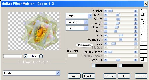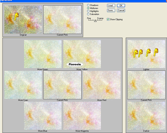 qui puoi trovare qualche risposta ai tuoi dubbi. Se l'argomento che ti interessa non è presente, ti prego di segnalarmelo. Questo tutorial è stato scritto con PSP X2, ma può essere eseguito anche con le altre versioni di PSP. Per tradurlo, ho usato PSP X. Occorrente: Materiale qui Il tube è di MTM Brigitte. Il resto del materiale è di Kitty. Rispetta il lavoro degli autori e mantieni i tubes al loro stato originale. Filtri: Adjust - Variations qui FM Tile Tools - Blend Emboss qui Mura's Meister - Copies qui ![]() Metti la maschera Diamantlijn nella cartella Maschere. Scompatta il software Photo-mosaique in una cartella. Prima di iniziare lancia il software Photo-Mosaique, che hai trovato nello zip (una volta scompattato, clicca sull'icona del programma, che non necessita di installazione). Clicca sull'icona della cartella (Ouvrir): ![]() e apri l'immagine dei fiori "Flores". Quindi clicca sull'icona del mosaico per creare un mosaico dell'immagine. ![]() Creato il mosaico, clicca sull'icona del dischetto per salvare l'immagine in formato jpg. ![]() Alla successiva finestra, lascia i settaggi standard e clicca ok. ![]() Puoi chiudere il programma. Ti apparirà questo messaggio, al quale puoi rispondere "non". ![]() 2. Apri una nuova immagine trasparente 800 x 600 pixel. Selezione>Seleziona tutto. Apri il file con il mosaico che hai appena creato e vai a Modifica>Copia. nello zip trovi anche il mosaico creato dall'autrice del tutorial. Se vuoi saltare il punto 1, puoi usare questo file. Torna al tuo lavoro e vai a Modifica>Incolla nella selezione. Selezione>Deseleziona. 3. Effetti>Plugins>Adjust>Variations. clicca una volta su Original (per annullare eventuali precedenti settaggi memorizzati dal filtro), e poi 4 volte su Lighter. ![]() 4. Attiva lo strumento Selezione , rettangolo,e traccia un rettangolo al centro dell'immagine. ![]() Livelli>Nuovo livello raster. Apri l'immagine dei fiori "flores", che ti è servita per creare il mosaico, e vai a Modifica>Copia. Torna al tuo lavoro e vai a Modifica>Incolla nella selezione. Effetti>Effetti 3D>sfalsa ombra: ![]() Ripeti l'Effetto Sfalsa ombra, cambiando verticale e orizzontale con -4. 5. Livelli>Duplica. Immagine>Ridimensiona, all'80%,t utti i livelli non selezionato. Attiva nuovamente lo strumento Selezione , rettangolo,e traccia un rettangolo al centro. ![]() Apri il tube Zonnebloem e vai a Modifica>Copia. Torna al tuo lavoro e vai a Modifica>Incolla nella selezione. Selezione>Deseleziona. 6. Effetti>Plugins>Mura's Meister - Copies: ![]() Effetti>Plugins>FM Tile Tools - Blend Emboss, con i settaggi standard. ![]() 7. Apri il tube "Bij" e vai a Modifica>Copia. Torna al tuo lavoro e vai a Modifica>Incolla come nuovo livello. Effetti>Effetti di bordo>Aumenta. Posiziona il tube sopra l'ape esistente sull'immagine.Livelli>Unisci>Unisci tutto. 8. Livelli>Nuovo livello raster. Imposta il colore di primo piano con #ead943, e riempi il livello con questo colore.Livelli>Carica/Salva maschera>Carica maschera da disco. Cerca e carica la maschera Diamantlijn: ![]() Livelli>Unisci>Unisci gruppo. Livelli>Duplica. Cambia la modalità di miscelatura di questo livello in Moltiplica. Livelli>Unisci>Unisci giù. Livelli>Duplica. Immagine>Ridimensiona, all'80%, tutti i livelli non selezionato. Livelli>Unisci>Unisci giù. 9. Apri l'angolo "sde_goth_red" e vai a Modifica>Copia. Torna al tuo lavoro e vai a Modifica>Incolla come nuovo livello. Spostalo in alto a sinistra.Effetti>Effetti 3D>Ritaglio: ![]() Livelli>Duplica. Immagine>Rifletti. Livelli>Duplica. Immagine>Capovolgi. Livelli>Duplica. Immagine>Rifletti. 10. Rimanendo posizionato su quest'ultimo livello, chiudi il livello di sfondo. Livelli>Unisci>Unisci visibile. Effetti>Effetti di bordo>Aumenta. Riapri il livello di sfondo. 11. Apri il tube della donna "MTM Lady_212_Demode" e vai a Modifica>Copia. Torna al tuo lavoro e vai a Modifica>Incolla come nuovo livello. Sposta il tube in basso a sinistra.Effetti>Effetti 3D>Sfalsa ombra: ![]() 12. Aggiungi il tuo nome e/o il tuo watermark su un nuovo livello. Apri il file di testo tekst.ks e vai a Modifica>copia. Torna al tuo lavoro e vai a Modifica>Incolla come nuovo livello. Spostalo in basso a destra.Livelli>Duplica. Cambia la modalità di miscelatura di questo livello in Moltiplica. Livelli>Unisci>Unisci tutto e salva in formato jpg. ![]()