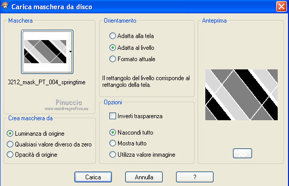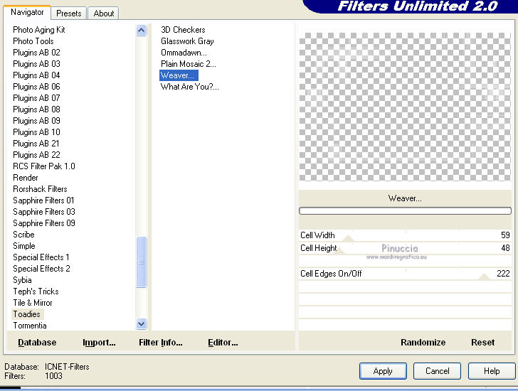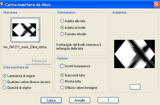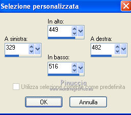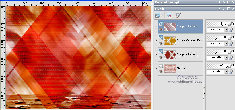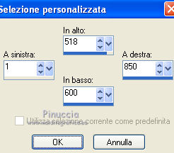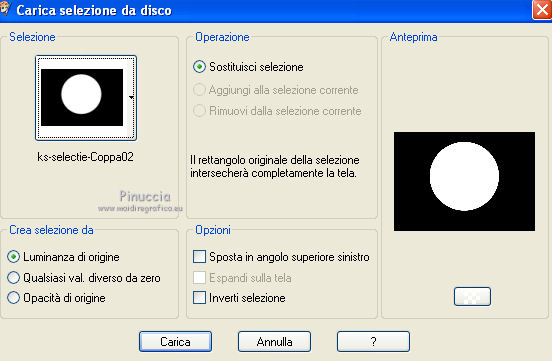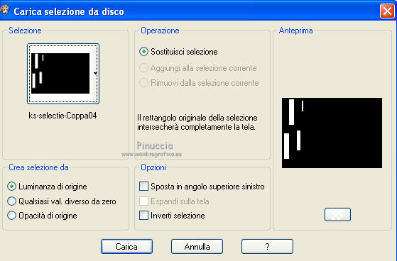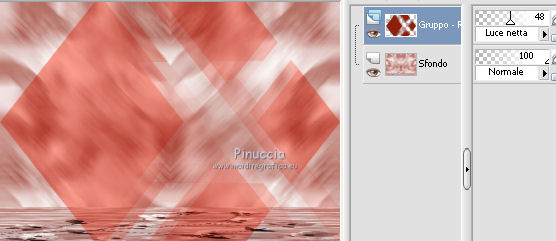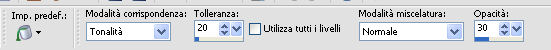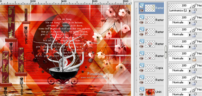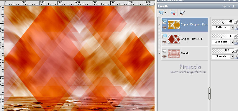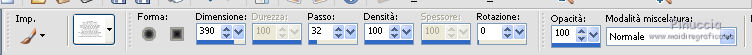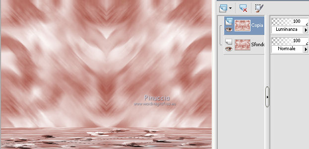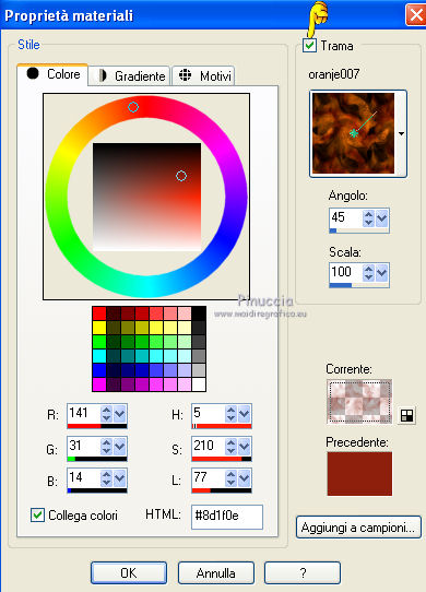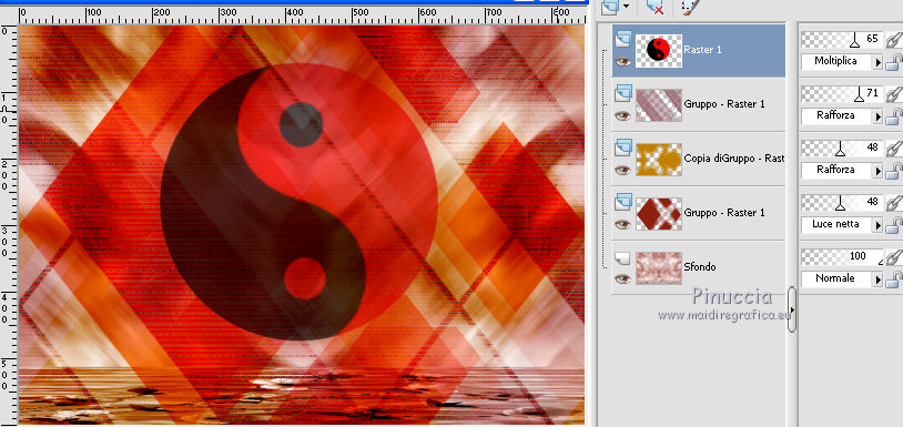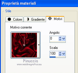 qui puoi trovare qualche risposta ai tuoi dubbi. Se l'argomento che ti interessa non è presente, ti prego di segnalarmelo. Questo tutorial è stato scritto con PSP X2 e tradotto con PXPX, ma può essere eseguito anche con le altre versioni di PSP. Dalla versione X4, il comando Immagine>Rifletti è stato sostituito con Immagine>Capovolgi in orizzontale, e il comando Immagine>Capovolgi con Immagine>Capovolgi in verticale. Nelle versioni X5 e X6, le funzioni sono state migliorate rendendo disponibile il menu Oggetti. Con la nuova versione X7, sono tornati Rifletti>Capovolgi, ma con nuove varianti. Vedi la scheda sull'argomento qui Traduzione francese qui Le vostre versioni quiOccorrente: Materiale qui Il tube della donna è di Kitty Filtri: in caso di necessità, consulta la sezione filtri qui Filters Unlimited 2.0 qui &<Bkg Designers sf10IV> - Lakeside Reflections (da importare in Unlimited) qui &<Bkg Kaleidoscope> - Flip SideLsf (da importare in Unlimited) qui Toadies - Weaver qui Alien Skin Eye Candy 5 Impact qui Adjust - Variations qui Mura's Seamless - Shift at Wave qui Cybia Screnworks qui I filtri Toadies, Mura's Seamless e Cybia si possono usare da soli o importati in Filters Unlimited (come fare vedi qui) Se un filtro fornito appare con questa icona ![]() non esitare a cambiare modalità di miscelatura e opacità secondo i colori utilizzati. Metti i preset (un preset - ks-coppa - non sarà utilizzato) Cliccando sul file una o due volte (a seconda delle tue impostazioni), automaticamente il preset si installerà nella cartella corretta. perchè uno o due clic vedi qui Metti il pennello nella cartella Pennelli. Attenzione, il pennello è composto da due files che non devono essere separati. Vedi gli appunti sui pennelli qui Metti il motivo "007" nella cartella Motivi. Se non vuoi appesantire la cartella, aprilo in PSP e minimizzalo e lo troverai nella lista dei motivi disponibili, quando ti servirà. Metti la trama oranje007 nella cartella Trame. Metti le maschere @nn_041211_mask_Eline_tdstudio e #64;nn_110212_mask_PT_004_springtime_tdstudio nella cartella Maschere. Metti le selezioni nella cartella Selezioni. 1. Apri una nuova immagine bianca 850 x 600 pixels. ![]() Imposta il colore di primo piano con #8d1f0e, seleziona Trama e imposta la trama oranje007, con i seguenti settaggi: ![]() Riempi l'immagine bianca,cliccando due volte, con il colore di primo piano+trama. Regola>Sfocatura>Sfocatura da movimento. ![]() 2. Effetti>Plugins>Filters Unlimited 2.0 - &<Bkg Designers sf10IV - Lakeside Reflection. ![]() Livelli>Duplica. Effetti>Plugins>Filters Unlimited 2.0 - &<Bkg Kaleidoscope> - Flip SideLsf. ![]() 3. Attiva lo strumento Selezione ,clicca sull'icona Selezione personalizzata ![]() e imposta i seguenti settaggi: ![]() Apri il tube JHanna_159_tube 050609 e vai a Modifica>Copia. non chiuderlo, perchè ti servirà ancora Torna al tuo lavoro e vai a Modifica>Incolla nella selezione. Selezione>Deseleziona. Cambia la modalità di miscelatura di questo livello in Luminanza. ![]() Livelli>Unisci>Unisci giù. 4. Livelli>Nuovo livello raster. Togli la selezione alla Trama nella paletta del colore di primo piano, e riempi il livello con il colore di primo piano #8d1f0e.Livelli>Carica/Salva maschera>Carica maschera da disco. Cerca e carica la maschera @nn_041211_mask_Eline_tdstudio. ![]() Livelli>Unisci>Unisci gruppo. 5. Cambia la modalità di miscelatura di questo livello in Luce netta, e abbassa l'opacità al 48%. ![]() Livelli>Duplica. Immagine>Rifletti. Effetti>Effetti di immagine>Motivo unico, con i settaggi standard. ![]() Cambia la modalità di miscelatura di questo livello in Rafforza, e mantieni l'opacità al 48%. ![]() 6. Effetti>Plugins>Adjust - Variations. Un clic su Original, per annullare eventuali precedenti settaggi memorizzati dal filtro, 2 clic su More Green, 7 clic su More Yellow, 1 clic su More Red e ok. ![]() 7. Livelli>Nuovo livello raster. Passa il colore di sfondo a Motivi, e seleziona il motivo "007". ![]() Riempi il livello con il motivo (tasto destro del mouse).Livelli>Carica/Salva maschera>Carica maschera da disco. Cerca e carica la maschera #64;nn_110212_mask_PT_004_springtime_tdstudio. ![]() Livelli>Unisci>Unisci gruppo. Cambia la modalità di miscelatura di questo livello in Rafforza, e abbassa l'opacità al 71%. ![]() 8. Effetti>Plugins>Cybia - Screenworks. ![]() Effetti>Effetti di bordo>Aumenta. 9. Livelli>Nuovo livello raster. Selezione>Carica/Salva selezione>Carica selezione da disco. Cerca e carica la selezione ks-selectie-Coppa02. ![]() Apri il tube ks-Yin-Yang e vai a Modifica>Copia. Torna al tuo lavoro e vai a Modifica>Incolla nella selezione. Selezione>Deseleziona. Cambia la modalità di miscelatura in Moltiplica, e abbassa l'opacità al 65%. ![]() 10. Livelli>Nuovo livello raster. Imposta il colore di primo piano con il colore bianco #ffffff. Attiva lo strumento Pennello ![]() Cerca e seleziona il pennello kittys-Yin-Yang, dimensione 390 pixels. ![]() e applicalo al centro cliccando con il tasto sinistro del mouse per usare il colore bianco di primo piano. ![]() 11. Livelli>Nuovo livello raster. Selezione>Carica/Salva selezione>Carica selezione da disco. Cerca e carica la selezione ks-selectie-Coppa01. ![]() Imposta la modalità di corrispondenza dello strumento Riempimento in Tonalità, e l'opacità a 30 ![]() e riempi due volte la selezione con il colore bianco di primo piano.Selezione>Deseleziona. 12. Effetti>Plugins>Toadies - Weaver. ![]() Livelli>Duplica. Livelli>Unisci>Unisci giù. Effetti>Plugins>Alien Skin Eye Candy 5 Impact - Perspective Shadow, seleziona il preset ks-Coppa2 e ok. Questi i settaggi, in caso di problemi con il preset ![]() 13. Livelli>Unisci>Unisci visibile. Livelli>Nuovo livello raster. Selezione>Carica/Salva selezione>Carica selezione da disco. Cerca e carica la selezione ks-selectie-Coppa03. ![]() Riporta lo strumento Riempimento su Nessuno, opacità 100, ![]() Riempi la selezione con il motivo 007 (tasto destro del mouse)