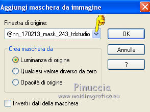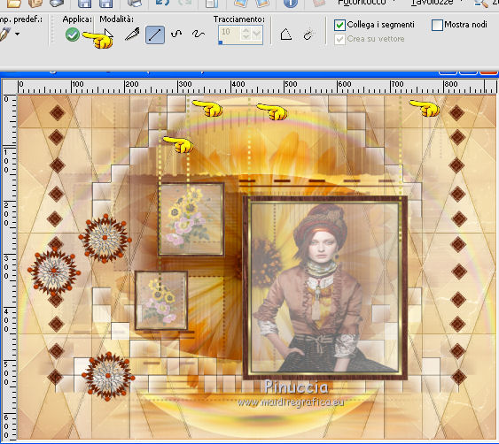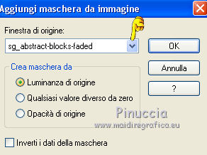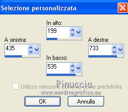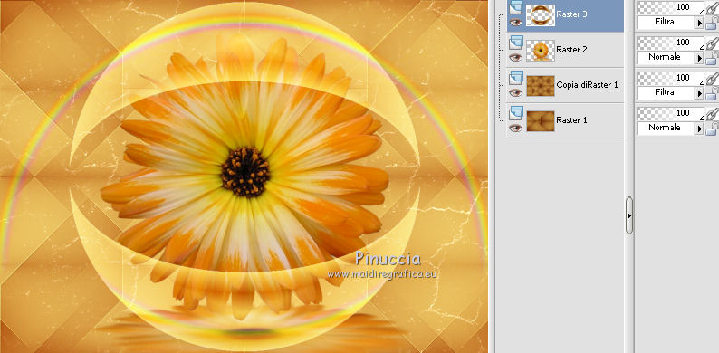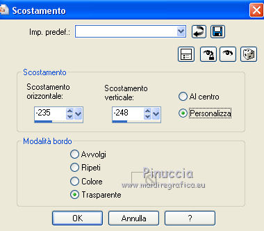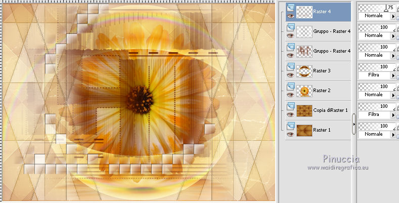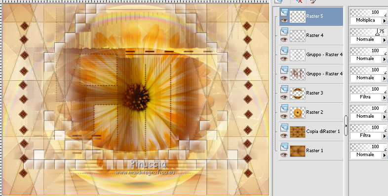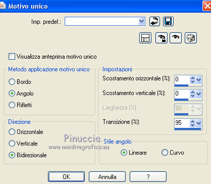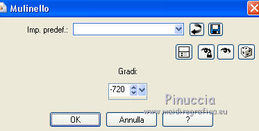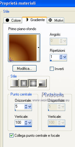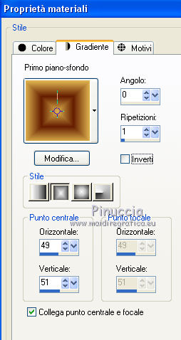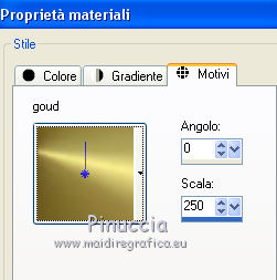 qui puoi trovare qualche risposta ai tuoi dubbi. Se l'argomento che ti interessa non è presente, ti prego di segnalarmelo. Questo tutorial è stato creato con CorelX2, ma può essere realizzato anche con le altre versioni di PSP. Dalla versione X4, il comando Immagine>Rifletti è stato sostituito con Immagine>Capovolgi in orizzontale, e il comando Immagine>Capovolgi con Immagine>Capovolgi in verticale. Nelle versioni X5 e X6, le funzioni sono state migliorate rendendo disponibile il menu Oggetti. Vedi la scheda sull'argomento qui Per tradurre questo tutorial ho usato PSP X. traduzione in francese qui Le vostre versioni qui Occorrente: Materiale qui Il tube della donna è di Kitty. Per la maschera grazie @nn Rispetta il lavoro degli autori e mantieni i tubes al loro stato originale. Filtri: in caso di necessità, consulta la sezione filtri qui Filters Unlimited 2.0 qui &<Bkg Designers sf10IV> - @BluyeBerry Pie, @Instant Tile (da importare in Unlimited) qui Photo Aging Kit - Cracked Paper (da importare in Unlimited) qui Mirror Rave - Quadrant Flip qui Italian Editors Effects - Mosaico qui AAA Frames - Foto Frame qui Alien Skin Eye Candy 5 Impact - Perspective Shadow qui I filtri Italian Editors e Mirror Rave si possono usare da soli o importati in Filters Unlimited (come fare vedi qui) Se un filtro fornito appare con questa icona Metti i preset Cliccando sul file una o due volte (a seconda delle tue impostazioni), automaticamente il preset si installerà nella cartella corretta. perchè uno o due clic vedi qui Metti i pennelli (cartella "penseel" nella cartella Pennelli. Attenzione, ogni pennello è composto da due files che non devono essere separati. Vedi gli appunti sui pennelli qui Metti la linea di stile #8 Rondje nella cartella Linee di stile. Metti la selezione nella cartella Selezioni. Apri il motivo "goud" e le maschere in PSP e minimizzali con il resto del materiale. 1. Imposta il colore di primo piano con #ddb14e, e il colore di sfondo con #641d01. ![]() Passa il colore di primo piano a Gradiente di primo piano/sfondo, stile Sprazzo di luce, con i seguenti settaggi. ![]() Apri una nuova immagine 900 x 650 pixels, ![]() e riempila con il gradiente.2. Effetti>Plugins>Filters Unlimited 2.0 - &&Bkg Designers sf10IV> - @BlueBerry Pie. ![]() Effetti>Effetti di immagine>Motivo unico. ![]() Effetti>Effetti di bordo>Aumenta di più. 3. Livelli>Duplica. Immagine>Rifletti. Cambia la modalità di miscelatura di questo livello in Filtra. ![]() Effetti>Plugins>Filters Unlimited 2.0 - &&Bkg Designers sf10IV> - @Instant Tile. ![]() nel tutorial originale XFlip è a 129. ma con questo settaggio ho ottenuto questo. ![]() Per questo motivo, ho cambiato il settaggio con 123 che dà il risultato uguale a quello del tutorial originale. Effetti>Plugins>Filters Unlimited 2.0 - Photo Aging Kit - Cracked Paper. ![]() Effetti>Plugins>Filters Unlimited 2.0 - Special Effect 2 - Rainbow. ![]() 4. Apri il tube 1Patries_BL103-margriet-K-photoss15-lisascan-17-12-10, e vai a Modifica>Copia. Torna al tuo lavoro e vai a Modifica>Incolla come nuovo livello. Lascialo come sta. Effetti>Plugins>Alien Skin Eye Candy 5 Impact - Perspective Shadow. Seleziona il preset ks-flower-Sunnyday e ok. In caso di problemi con il preset, puoi copiare i settaggi che vedi nella schermata. ![]() Risultato ![]() attenzione, però, il preset è stato creato con il tube fornito e nella sua posizione. Cambiando tube e posizione, possono variare entrambi o uno dei valori di Center Offset Direction e Center Offset Distance, come nell'esempio sotto, con il tube usato per la versione in fondo al tutorial ![]() Cambia i settaggi del Gradiente in stile Rettangolare. ![]() Livelli>Nuovo livello raster. Attiva lo strumento Selezione ![]() clicca sull'icona Selezione personalizzata ![]() e imposta i seguenti settaggi. ![]() Riempi la selezione con il gradiente.Selezione>Deseleziona. 5. Effetti>Effetti geometrici>Cerchio. ![]() Immagine>Capovolgi. Effetti>Plugins>Filters Unlimited 2.0 - Special Effect 2 - Rainbow. ![]() 6. Effetti>Plugins>Filters Unlimited 2.0 - Mirror Rave - Quadrant Flip. ![]() Cambia la modalità di miscelatura di questo livello in Filtra. ![]() 7. Livelli>Nuovo livello raster. Riempi con il colore di sfondo #641d01.Livelli>Nuovo livello maschera>Da immagine. Apri il menu sotto la finestra di origine e vedrai la lista dei files aperti. Seleziona la maschera sg_abstract-blocks-faded, con i seguenti settaggi. ![]() Livelli>Unisci>Unisci gruppo. Effetti>Effetti di immagine>Scostamento. ![]() 8. Imposta il colore di primo piano con il colore bianco #ffffff. Livelli>Nuovo livello raster. Riempi con il colore bianco.Livelli>Nuovo livello maschera>Da immagine. Apri il menu sotto la finestra di origine e seleziona la maschera @nn_170213_mask_243_tdstudio, con i seguenti settaggi. ![]() Livelli>Unisci>Unisci gruppo. Effetti>Effetti di bordo>Aumenta. 9. Livelli>Nuovo livello raster. Selezione>Carica/Salva selezione>Carica selezione da disco. Cerca e carica la selezione ks-selectie-Summerday. ![]() Riempi la selezione con il colore bianco #ffffff.Selezione>Deseleziona. 10. Effetti>Effetti di distorsione>Mulinello. ![]() Effetti>Plugins>Italian Editors Effect - Mosaico. ![]() Abbassa l'opacità di questo livello al 75%. ![]() Livelli>Duplica. Immagine>Rifletti. Livelli>Unisci>Unisci giù. 11. Apri il tube ks-bloks-accent-sunny day e vai a Modifica>Copia. Torna al tuo lavoro e vai a Modifica>Incolla come nuovo livello. Cambia la modalità di miscelatura di questo livello in Moltiplica. ![]() Sposta il tube un po' più in alto,come nell'esempio. ![]() 12. Livelli>Nuovo livello raster. Attiva lo strumento Pennello ![]() cerca e seleziona il pennello ks-cirkel. ![]() Applicalo a sinistra, cliccando una volta con il tasto destro del mouse, per usare il colore di sfondo #641d01. ![]() 13. Apri il tube ks-accent-flowers e vai a Modifica>Copia. Torna al tuo lavoro e vai a Modifica>Incolla come nuovo livello. Spostalo nei cerchi del pennello.![]() 