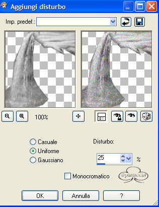 19. Regola>Aggiungi/Rimuovi disturbo>Aggiungi disturbo, con i seguenti settaggi: