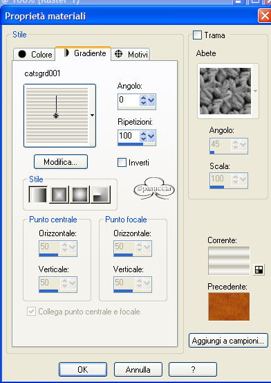 2. Setta il colore di primo piano su Gradiente, cerca Catsgrd001, angolo 0, ripetizioni 100.