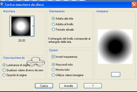 8. Layer, Mask load/save, Mask load from disk, cerca la maschera 20-20, Inverti trasparenza selezionato.
