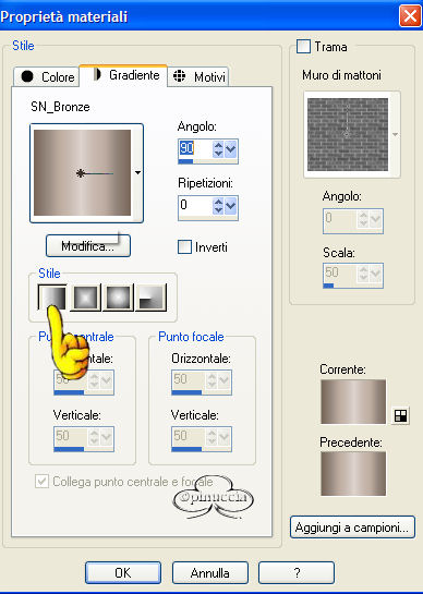 2. Setta il colore di primo piano su Gradiente, cerca SN_Bronze, angolo 90, ripetizioni 0, stile lineare: