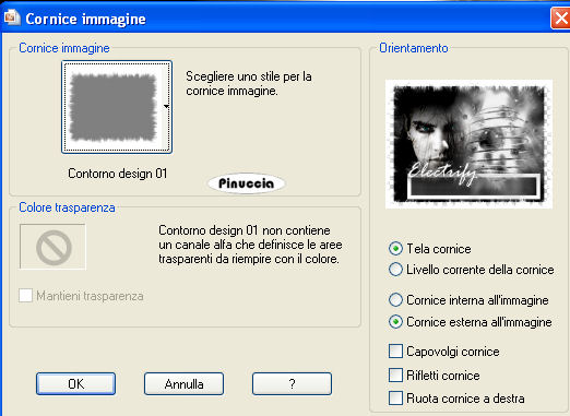 4. Immagine>Cornice-immagine. Seleziona la cornice Contorno-Design01 con i settaggi standard.