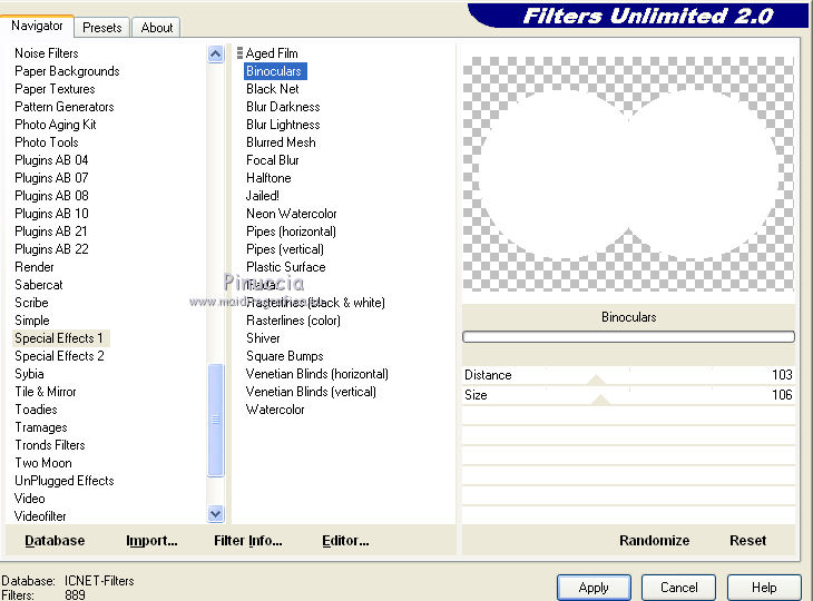 Effetti>Plugins>Filters Unlimited 2.0 - Special Effects 1 - Binoculars, con i settaggi standard.