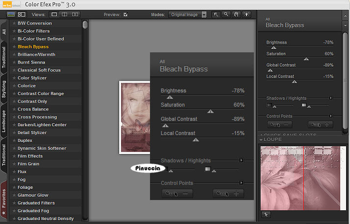 A sinistra seleziona Bleach Bypass, con i seguenti settaggi.