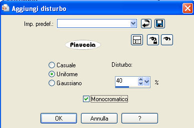 Regola>Aggiungi/Rimuovi disturbo>Aggiungi disturbo, con i seguenti settaggi: