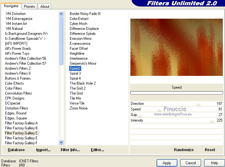 Effetti>Plugins>Filters Unlimited - Factory Gallery C - Speed, con i settaggi standard.