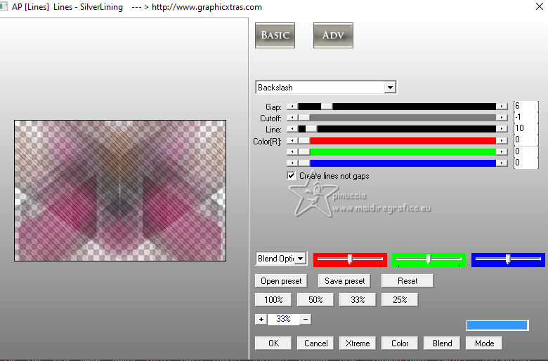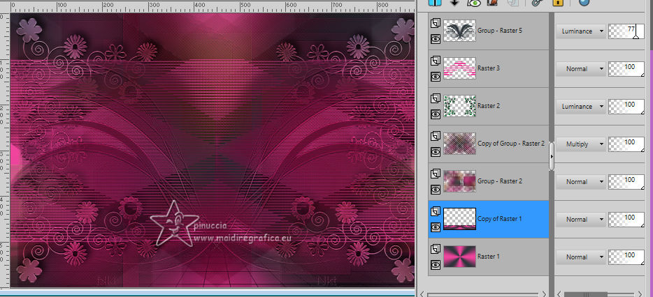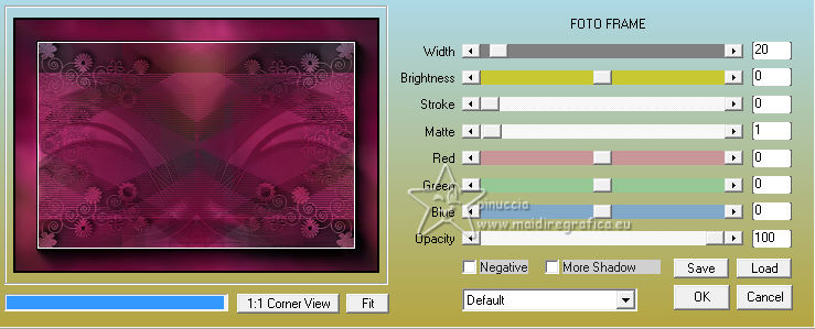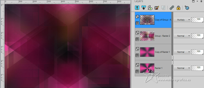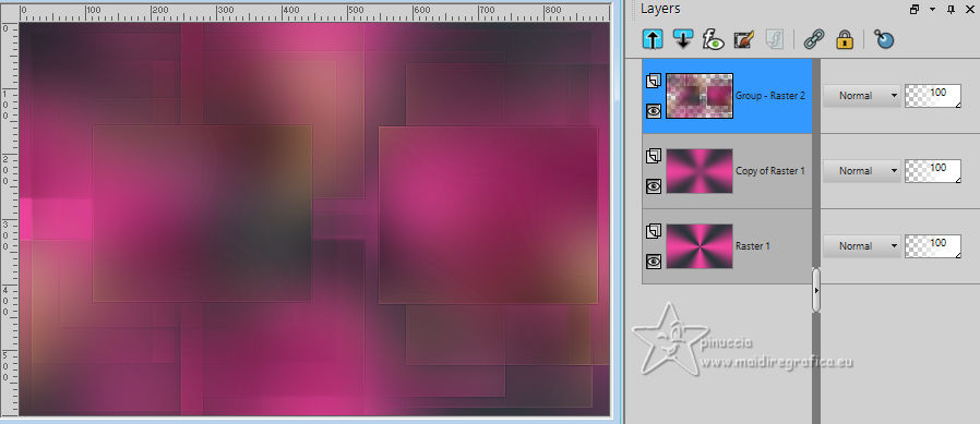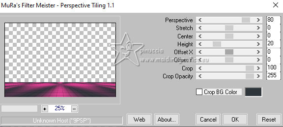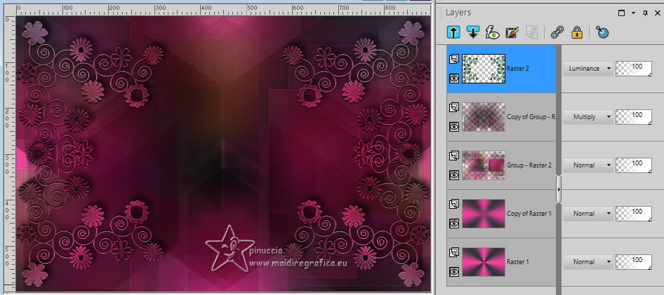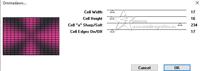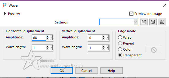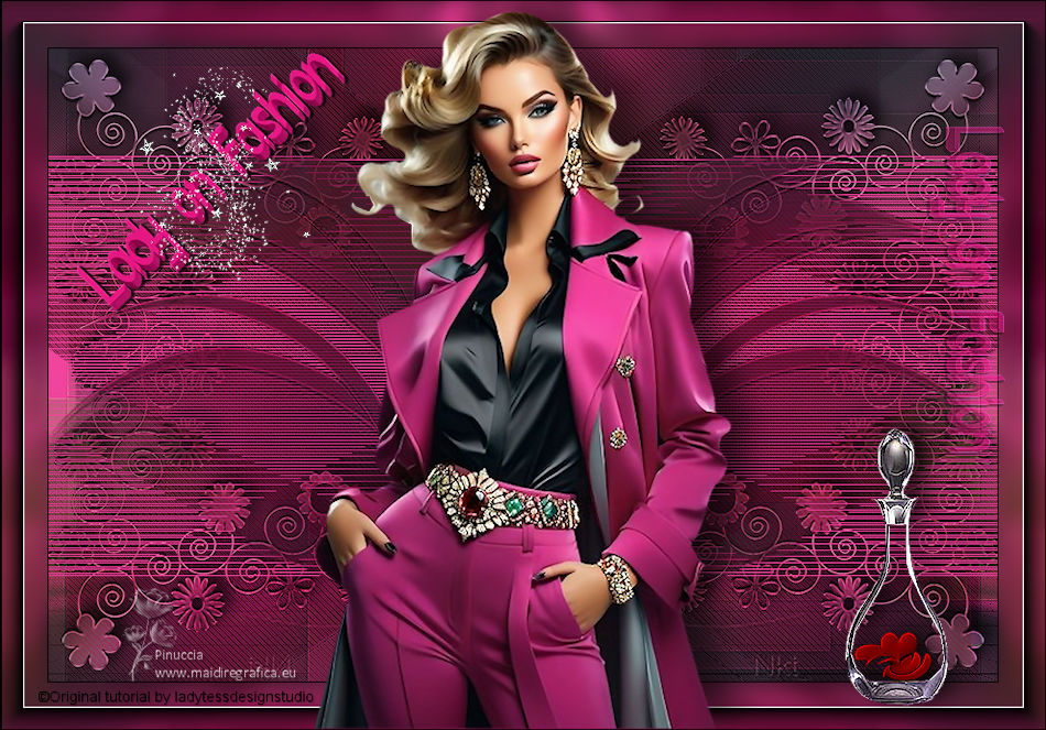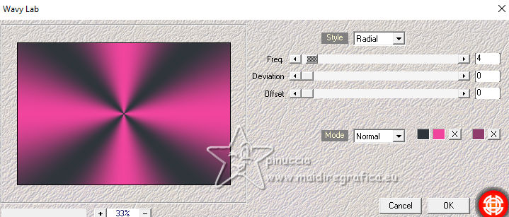 For this tutorial, you will need: ![]() Thanks for the tubes and the masks thanks Eugenia Clo, Nikita and Monaiekje. (you find here the links to the material authors' sites) ![]() consult, if necessary, my filter section here Filters Unlimited 2.0 here Mura's Meister - Perspective Tiling here Mehdi - Wavy Lab here AP [Lines] - Lines SilverLining here Toadies - Ommadawn here AAA Frames - Foto Frame here Filters Toadies can be used alone or imported into Filters Unlimited. (How do, you see here) If a plugin supplied appears with this icon ![]() You can change Blend Modes according to your colors. ![]() Copy the Selection in the Selection Folder. Open the masks in PSP and minimize them with the rest of the material. 1. Set your foreground color to #f0449d and your background color to #2e353b. ![]() 2. Open a new transparent image 900 x 600 pixels. Effects>Plugins>Mehdi - Wavy Lab This filter creates gradients with the colors of your Materials palette. The first is your background color, the second is your foreground color. Keep the last color created by the filtre. ![]() Layers>Duplicate. Adjust>Blur>Gaussian Blur - radius 40. ![]() 3. Layers>New Raster Layer. Selections>Select All. Open Woman2565_byClo ![]() Edit>Copy. Go back to your work and go to Edit>Paste into Selection. Selections>Select None. 4. Effects>Image Effects>Seamless Tiling, default settings. ![]() Adjust>Blur>Gaussian Blur - radius 50. ![]() 5. Layers>New Mask layer>From image Open the menu under the source window and you'll see all the files open. Select the mask Monaiekje mask 29 ![]() Layers>Merge>Merge Group. Effects>Edge Effects>Enhance. 6. We have this ![]() 7. Layers>Duplicate. Effects>Geometric Effects>Skew. ![]() Change the Blend Mode of this layer to Multiply and reduce the opacity to 61%. Layers>Duplicate. Image>Mirror>Mirror horizontal. Layers>Merge>Merge Down. 8. Effects>Plugins>AP [Lines] - Lines SilverLining. ![]() Effects>Edge Effects>Enhance. We have this ![]() 8. Open 12930422521_divers_nikita ![]() (you can colorize according to your tubes). Edit>Copy. Go back to your work and go to Edit>Paste as new layer. Image>Resize, to 40%, resize all layers not checked. Effects>Image Effects>Offset. ![]() 10. Layers>Duplicate. Image>Mirror>Mirror horizontal. Layers>Merge>Merge Down. Layers>Duplicate. Image>Mirror>Mirror Vertical. Layers>Merge>Merge Down. 11. Change the Blend Mode of this layer to Luminance. Effects>3D Effects>Drop Shadow, color #000000. ![]() We have this ![]() 12. Stay on the top layer. Layers>New Raster Layer. Selections>Load/Save Selection>Load Selection from Disk. Look for and load the selection LadyonFashion_sel_1 ![]() Flood Fill the selection with your foreground color #f0449d.Selections>Select None. 13. Effects>Distortion Effects>Wave. ![]() Effects>Reflection Effects>Rotating Mirror. ![]() Layers>New Raster Layer. Flood Fill the layer with your background color #2e353b.14. Layers>New Mask layer>From image Open the menu under the source window and select the mask 1250182098_nikita_masque ![]() Layers>Merge>Merge Group. Image>Resize, to 85%, resize all layers not checked. K key to activate your Pick Tool ![]() Position X: -35,00 - Position Y: 7,00. ![]() M key to deselect the Tool. 15. Layers>Duplicate. Image>Mirror>Mirror horizontal. Layers>Merge>Merge Down. Move a bit down.Change the Blend Mode of this layer to Luminance and reduce the opacity to 77%. Effects>Edge Effects>Enhance More. 16. Activate the layer Copy of Raster 1 (the second from the bottom). Effects>Plugins>Toadies - Ommadawn. ![]() Effects>Plugins>Mura's Meister - Perspective Tiling. ![]() Adjust>Sharpness>Sharpen. 17. We have this ![]() 18. Edit>Copy Special>Copy Merged. Edit>Paste as new image, and minimize it for the moment. Go back to your work. Image>Add borders, 1 pixel, symmetric, color #000000. Selections>Select All. 19. Image>Add borders, 45 pixels, symmetric, color #ffffff. Selections>Invert. Edit>Paste into Selection (the image of step 18 is still in memory). 20. Selections>Invert. Effects>Image Effects>Seamless Tiling, default settings. ![]() Again Selections>Invert. Adjust>Blur>Gaussian Blur - radius 10. ![]() 21. Effects>Plugins>AAA Frames - Foto Frame. ![]() Effects>Reflection Effects>Rotating Mirror, default settings. ![]() 22. Selections>Select None. Activate again the tube Woman2565_byClo and go to Edit>Copy. Go back to your work and go to Edit>Paste as new layer. Image>Resize, to 70%, resize all layers not checked. Objects>Align>Bottom. 23. Effects>3D Effects>Drop Shadow, color #000000. ![]() Adjust>Sharpness>Sharpen. 24. Open LTDStudio_Lady_on_Fashion_Deco ![]() Edit>Copy. Go back to your work and go to Edit>Paste as new layer. Move the tube to your liking.25. Open LTDStudio_Lady_on_Fashion_Texto ![]() Edit>Copy. Go back to your work and go to Edit>Paste as new layer. Move the tube to your liking.26. Sign your work. Add the author and the translator's watermarks. Layers>Merge>Merge All and save as jpg. For the tubes of these versions thanks Isa and Yvonne ![]() Nini and NaiseM ![]() ![]() Your versions. Thanks![]() Irene ![]() Kika ![]() Jolcsi ![]() Angela das Gracas ![]() If you have problems or doubts, or you find a not worked link, or only for tell me that you enjoyed this tutorial, write to me. |