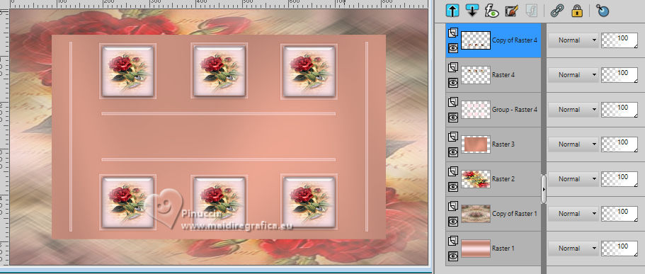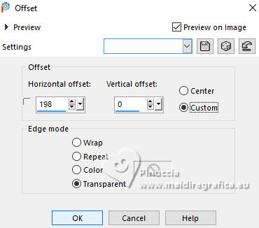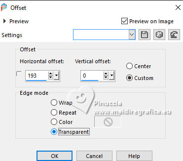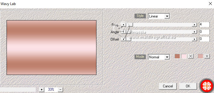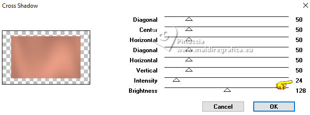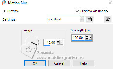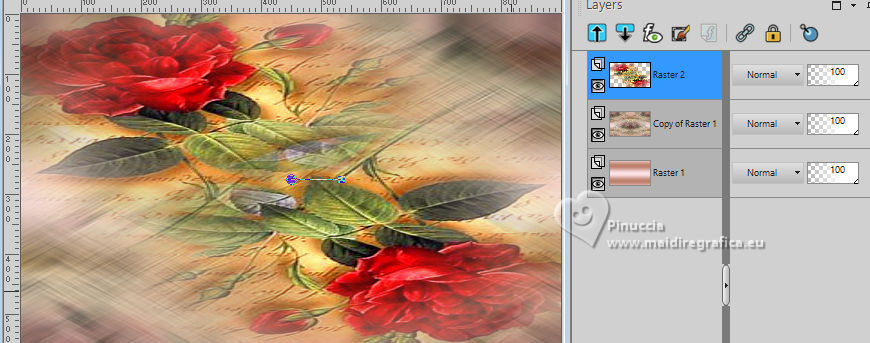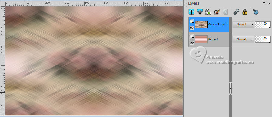 For this tutorial, you will need: ![]() Thanks for the tubes Drevers and smArt, and for the mask Narah. The rest of the material is by Lady Tess. (you find here the links to the material authors' sites) ![]() consult, if necessary, my filter section here Filters Unlimited 2.0 here Mehdi - Wavy Lab here Graphics Plus - Cross Shadow here FM Tile Tools - Saturation Emboss, Blend Emboss here Alien Skin Eye Candy 5 Impact - Glass here AAA Frames - Foto Frame here Filters Graphics Plus can be used alone or imported into Filters Unlimited. (How do, you see here) If a plugin supplied appears with this icon ![]() You can change Blend Modes according to your colors. ![]() Open the mask in PSP and minimize it with the rest of the material. 1. Set your foreground color to #fce2e7 and your background color to #be806c. ![]() 2. Open a new transparent image 900 x 550 pixels. Effects>Plugins>Mehdi - Wavy Lab This filter creates gradients with the colors of your Materials palette. The first is your background color, the second is your foreground color. Keep the last colors created by the filtre. ![]() 2. Layers>Duplicate. Layers>New Raster Layer. Selections>Select All. Open smArt_deco-7 ![]() Edit>Copy. Go back to your work and go to Edit>Paste into Selection. Selecions>Select None. 3. Effects>Image Effects>Seamless Tiling, default settings. ![]() Layers>Merge>Merge Down. Adjust>Blur>Motion Blur. ![]() Edit>Repeat Motion Blur. 4. Layers>Duplicate. Image>Mirror>Mirror horizontal. Reduce the opacity of this layer to 50%. Layers>Merge>Merge Down. Effects>Edge Effects>Enhance More. 5. We have this ![]() 6. Layers>New Raster Layer. Selections>Select All. Open smArt_deco_3 ![]() Edit>Copy. Go back to your work and go to Edit>Paste into Selection. Selections>Select None. 7. Effects>Plugins>FM Tile Tools - Saturation Emboss, default settings. ![]() K key to activate your Pick Tool ![]() Position X: -128,00 - Position Y: -110,00. ![]() M key to deselect the Tool. Layers>Duplicate. Image>Mirror>Mirror Horizontal. Image>Mirror>Mirror Vertical. Layers>Merge>Merge Down. 8. We have this. ![]() 9. Layers>New Raster Layer. Flood Fill with your background color #be806e.Image>Resize, to 80%, resize all layers not checked. Effects>Plugins>Graphics Plus - Cross Shadow. ![]() 10. Layers>New Raster Layer. Flood Fill with your foreground color #fce2e7.Layers>New Mask layer>From image Open the menu under the source window and you'll see all the files open. Select the mask NarahsMasks_1803. ![]() Effects>Edge Effects>Enhance More. Layers>Merge>Merge Group. 11. Activate your Magic Wand Tool ![]() ![]() Click in the left frame to select it. ![]() Layers>New Raster Layer. 12. Edit>Paste into Selection - the tube smArt_deco_3 is still in memory. Adjust>Sharpness>Sharpen More. Effects>Plugins>Alien Skin Eye Candy 5 Impact - Glass - preset Clear. ![]() Selections>Select None. 13. Layers>Duplicate. Effects>Image Effects>Offset. ![]() Again Layers>Duplicate. Effects>Image Effects>Offset. ![]() 14. Layers>Merge>Merge Down - 2 times. Layers>Duplicate. Layers>Merge>Merge Down. Again Layers>Duplicate. Effects>Image Effects>Offset. ![]() 15. We have this. ![]() 16. Activate the layer Raster 3 (the 4th layers from the bottom) Edit>Paste as new layer (the tube smArt_deco_3 is always in memory). Objects>Align>Left. Layers>Duplicate. Image>Mirror>Mirror Horizontal. 17. Layers>Merge>Merge Down. Effects>Plugins>FM Tile Tools - Blend Emboss, default settings ![]() Edit>Copy Special>Copy Merged. Edit>Paste as new image - and minimize this image. Go back to your work. Image>Add borders, 1 pixel, symmetric, color #ffffff. 18. Selections>Select All. Image>Add borders, 45 pixels, symmetric, color #ffffff. Selections>Invert. Edit>Paste into Selection - the image minimized at step 17 is still in memory. 19. Adjust>Blur>Gaussian Blur - radius 20. ![]() Effects>Plugins>AAA Frames - Foto Frame. ![]() Effects>Reflection Effects>Rotating Mirror, default settings. ![]() Selections>Select None. 20. Open Drevers_misted_woman_246 ![]() Edit>Copy. Go back to your work and go to Edit>Paste as new layer. Effects>Plugins>FM Tile Tools - Blend Emboss, default settings ![]() 21. Open LTDStudio_Romantic_Rose_Texto ![]() Edit>Copy. Go back to your work and go to Edit>Paste as new layer. Sign your work on a new layer. Add the author and the translator's watermarks. Layers>Merge>Merge All and save as jpg. For the tube of this version thanks Guismo ![]() ![]() Your versions. Thanks![]() Lynnette ![]() Kika ![]() Pia ![]() If you have problems or doubts, or you find a not worked link, or only for tell me that you enjoyed this tutorial, write to me. |