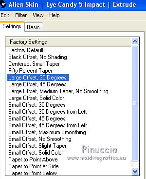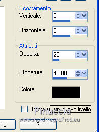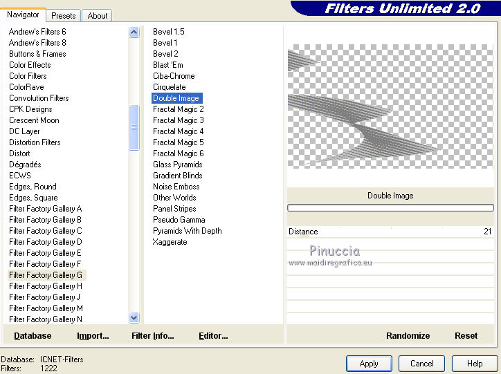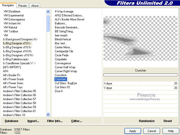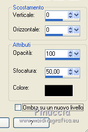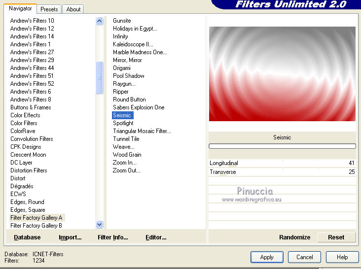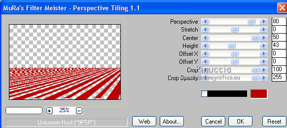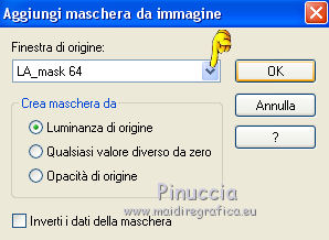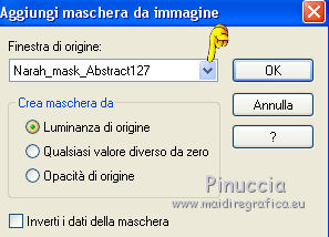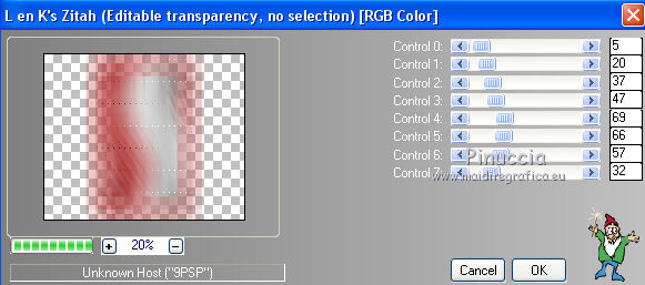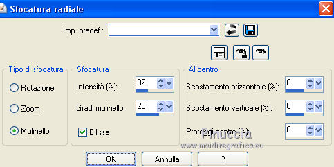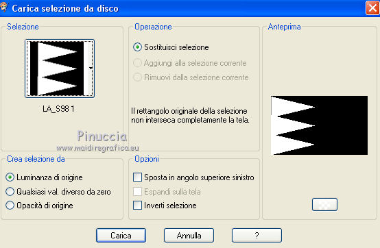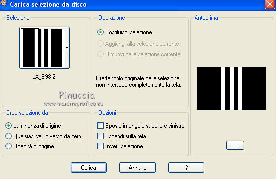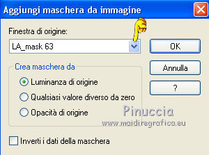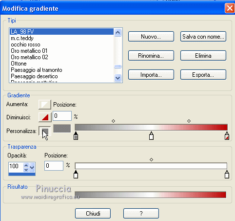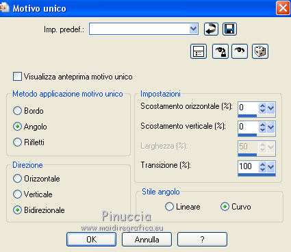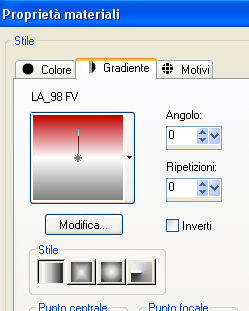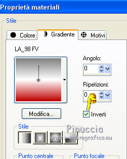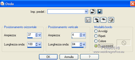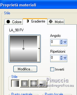 qui puoi trovare qualche risposta ai tuoi dubbi. Se l'argomento che ti interessa non è presente, ti prego di segnalarmelo. Il copyright del tutorial appartiene a Laguna Azul. Questo tutorial è stato creato con CorelX2, ma può essere realizzato anche con le altre versioni di PSP. Dalla versione X4, il comando Immagine>Rifletti è stato sostituito con Immagine>Capovolgi in orizzontale, e il comando Immagine>Capovolgi con Immagine>Capovolgi in verticale. Nelle versioni X5 e X6, le funzioni sono state migliorate rendendo disponibile il menu Oggetti. Con la nuova versione X7, sono tornati Rifletti>Capovolgi, ma con nuove varianti. Vedi la scheda sull'argomento qui Per tradurrlo ho usato PSP X. Traduzione francese/traduction en français qui Le vostre versioni qui Occorrente: Un tube a scelta. Il resto del materiale qui Il tube utilizzato è di K@rine. Una maschera è di Narah. Il resto del materiale è di Laguna Azul (in questa pagina trovi i links ai siti dei creatori di tubes) Filtri: se hai problemi con i filtri, consulta la mia sezione filtri qui Filters Unlimited 2.0 qui &<Bkg Designer sf10I - Cruncher da importare in Unlimited) qui &<Bkg Designer sf10II - MURUs Wave (da importare in Unlimited) qui Filter Factory Gallery A - Sesmic qui Filter Factory Gallery G - Double Image qui L&K's - L&K's Zitah qui Toadies - What are you qui Mura's Meister - Perspective Tiling qui Alien Skin Eye Candy 5 Impact - Extrude qui I filtri Factory Gallery e Toadies si possono usare da soli o importati in Filters Unlimited. come fare vedi qui) Se un filtro fornito appare con questa icona Attenzione, a volte i filtri hanno risultati differenti se usati soli o in Unlimited. Inoltre circola in rete una versione di Unlimited che non si installa ed è composta da files in formato 8bf. Anche in questo caso le due versioni possono dare risultati differenti. ![]() Metti le selezioni nella cartella Selezioni. Metti il gradiente LA_98 FV nella cartella gradienti. Apri le maschere in PSP e minimizzale. 1. Apri una nuova immagine trasparente 900 x 550 pixels. Scegli dal tuo tube un colore e impostalo come colore di sfondo. Imposta il colore di primo piano con il colore bianco #ffffff. ![]() Passa il colore di primo piano a Gradiente, e seleziona il gradiente "LA_98FV", Stile Lineare, angolo e ripetizioni 0. Dovresti avere questo. ![]() Ma il gradiente è influenzato dal colore di sfondo e avrai la parte superiore del gradiente con il colore scelto. ![]() Per portare il gradiente alle tinte originali con cui è stato creato, clicca su Modifica, poi su Personalizza e quindi "sdoppia" il calamaio e trascinalo fino in fondo. Per conservare il gradiente originale (che più tardi ti servirà), prima di chiudere, clicca su Salva con nome e assegna un nome al gradiente. ![]() Se vuoi evitare questo passaggio (con alcune versioni di PSP dopo aver usato la funzione Modifica del gradiente, il programma si chiude), puoi momentaneamente impostare il colore di sfondo con il colore #808080 (che, oltretutto ti servirà più tardi), e avrai il gradiente originale. ![]() Riempi l'immagine trasparente con il gradiente.2. Livelli>Duplica. Immagine>Ridimensiona, al 75%, tutti i livelli non selezionato. ![]() Effetti>Effetti di immagine>Motivo unico. ![]() Effetti>Effetti di bordo>Aumenta di più. Effetti>Effetti di immagine>Motivo unico, con i seguenti settaggi. ![]() 3. Livelli>Nuovo livello raster. Riporta il colore di primo piano a Colore. Riempi il livello con il colore bianco di primo piano.Livelli>Nuovo livello maschera>Da immagine. Apri il menu sotto la finestra di origine e vedrai la lista dei files aperti. Seleziona la maschera LA_mask 63, con i seguenti settaggi. ![]() Livelli>Unisci>Unisci gruppo. 4. Regola>Sfocatura>Sfocatura radiale. ![]() Cambia la modalità di miscelatura di questo livello in Luce diffusa. 5. Livelli>Nuovo livello raster. Selezione>Carica/Salva selezione>Carica selezione da disco. Cerca e carica la selezione LA_S98 1. ![]() Riempi la selezione con il colore di sfondo #808080.Selezione>Deseleziona. Effetti>Effetti di distorsione>Onda. ![]() Effetti>Plugins>Filters Unlimited 2.0 - Filter Factory Gallery G - Double Image, con i settaggi standard. ![]() Effetti>Plugins>Filters Unlimited 2.0 - &<Bkg Designer sf10I> - Cruncher, con i settaggi standard. ![]() Livelli>Duplica. Immagine>Rifletti. Immagine>Capovolgi. Livelli>Unisci>Unisci giù. Effetti>Effetti di distorsione>Onda, con i settaggi precedenti. ![]() Cambia la modalità di miscelatura di questo livello in Rafforza. 6. Livelli>Nuovo livello raster. Selezione>Carica/Salva selezione>Carica selezione da disco. Cerca e carica la selezione LA_S98 2. ![]() Imposta il colore di sfondo con il colore scelto dal tube. ![]() Riempi la selezione con questo colore.Selezione>Deseleziona. Effetti>Plugins>Mura's Meister - Perspective Tiling. ![]() Effetti>Plugins>Filters Unlimited 2.0 - &<Bkg Designer sf10II> - MURUs Wave, con i settaggi standard. ![]() Effetti>Effetti 3D>Sfalsa ombra. ![]() 7. Regola>Sfocatura>Sfocatura radiale. ![]() Effetti>Effetti di bordo>Aumenta di più. Livelli>Unisci>Unisci visibile. Livelli>Duplica. Immagine>Ridimensiona, al 75%, tutti i livelli non selezionato. 8. Effetti>Plugins>Toadies - What are you, con i settaggi standard. ![]() Immagine>Ruota per gradi - 90 gradi a destra. ![]() Di nuovo Effetti>Plugins>Toadies - What are you, con i settaggi precedenti. Effetti>Plugins>L&K's - L&K's Zitah, 2 volte con i seguenti settaggi. ![]() 9. Livelli>Nuovo livello raster. Riempi con il colore bianco.Livelli>Nuovo livello maschera>Da immagine. Apri il menu sotto la finestra di origine e seleziona la maschera Narah_mask_Abstract127, con i seguenti settaggi. ![]() Livelli>Unisci>Unisci gruppo. Livelli>Unisci>Unisci visibile. 10. Immagine>Dimensioni tela - 1000 x 650 pixels. ![]() Livelli>Nuovo livello raster. Passa il colore di primo piano a Gradiente e imposta il gradiente originale LA_98 FV, Inverti selezionato. ![]() Riempi il livello con il gradien