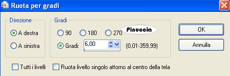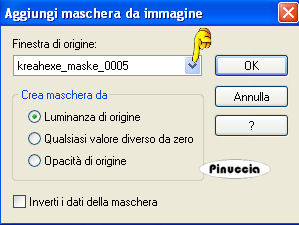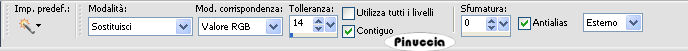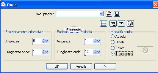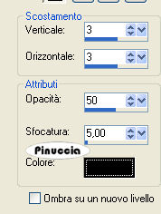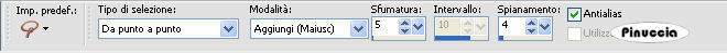 qui puoi trovare qualche risposta ai tuoi dubbi. Se l'argomento che ti interessa non è presente, ti prego di segnalarmelo. Questo tutorial è stato scritto con PSP X2, ma può essere eseguito anche con le altre versioni di PSP. Il copyright del tutorial, del materiale scrap e dei poser appartiene a Laguna Azul. Il copyright della traduzione è mio. Il copyright dei tubes e delle immagini appartiene ai rispettivi artisti. Per favore, rispetta il lavoro degli autori. traduzione in francese qui Occorrente: Tre tubes a scelta. Il resto del materiale qui La maschera è di Kreahexe I poser utilizzati sono di LagunaAzul Filtri: Mura's Meister - Copies qui 1. Apri una nuova immagine trasparente 900 x 700 pixels. Apri la maschera "kreahexe_maske_00052" e minimizzala nella tua area di lavoro. Scegli un'immagine di sfondo e aprila in PSP. Per il mio esempio ho scelto "la_paper05". Immagine>Ridimensiona, a 500 pixels di larghezza. Livelli>Nuovo livello maschera>Da immagine. Apri il menu sotto la finestra di origine e vedrai la lista dei file aperti. Seleziona la maschera "kreahexe_maske_00052" con i seguenti settaggi. ![]() Livelli>Unisci>Unisci gruppo. Immagine>Rifletti. Modifica>Copia. Torna alla tua immagine trasparente e vai a Modifica>Incolla come nuovo livello. Sposta l'immagine nell'angolo in basso a sinistra, in modo che chiuda il bordo inferiore.![]() 2. Apri l'immagine di sfondo "la_back" e vai a Modifica>Copia. Torna al tuo lavoro e vai a Modifica>Incolla come nuovo livello. Apri "la_paper02" (o un'altra carta, se preferisci). Immagine>Ridimensiona, a 500 pixels di larghezza. Livelli>Nuovo livello maschera>Da immagine. Seleziona e carica nuovamente la maschera "kreahexe_maske_00052". Livelli>Unisci>Unisci gruppo. Modifica>Copia. Torna al tuo lavoro e vai a Modifica>Incolla come nuovo livello. Sposta l'immagine nell'angolo in alto a destra, a chiudere i bordi della tela.![]() puoi chiudere la maschera, perchè non ti servirà più 3. Apri il tube "la_choco tag" e vai a Modifica>Copia. Torna al tuo lavoro e vai a Modifica>Incolla come nuovo livello. Immagine>Ruota per gradi - 6 gradi a destra. ![]() Regola>Messa a fuoco>Metti a fuoco. Posiziona la targhetta come nell'esempio.![]() Livelli>Duplica. 4. Attiva lo strumento Bacchetta magica con i seguenti settaggi.![]() Clicca al centro della targhetta per selezionarla. ![]() Imposta il colore di sfondo con il colore #50412d" (o con il colore che preferisci, purchè abbinato ai colori del tuo lavoro), Scegli uno dei font forniti - per il mio esempio ho usato il font Viva Maria. Clicca all'esterno della selezione per far apparire la finestra del testo. Scrivi una parola (io ho scritto "Cioccolato"). Applica, per applicare il testo. ![]() Livelli>Converti in livello raster. Sposta il testo al centro della selezione.![]() Effetti>Plugins>Mura's Meister - Copies, con i seguenti settaggi. ![]() Selezione>Deseleziona. Cambia la modalità di miscelatura di questo livello in Filtra, e abbassa l'opacità al 65%. ![]() 5. Apri uno dei tube che hai scelto, il mio la_chocoposer03. Immagine>Ridimensiona, a circa il 50%, o a 600 pixels di altezza. Modifica>Copia. Torna al tuo lavoro e vai a Modifica>Incolla come nuovo livello. Posiziona il tube pressappoco come nell'esempio.![]() Regola>Messa a fuoco>Metti a fuoco. Effetti>Effetti 3D>Sfalsa ombra, con il colore nero. ![]() 6. Attiva il terzo livello dall'alto. ![]() Selezione>Seleziona tutto. Selezione>Mobile. Selezione>Immobilizza. Selezione>Inverti. Attiva il livello superiore (il tube). Attiva lo strumento Gomma e cancella la parte inferiore del tube esterna alla selezione.La selezione impedirà alla gomma di cancellare all'interno di questa. ![]() Selezione>Deseleziona. 7. Apri "la_choco metal ranke1". Clicca sull'icona "ruota a destra" sulla barra superiore degli strumenti.Modifica>Copia. Torna al tuo lavoro e vai a Modifica>Incolla come nuovo livello. Sposta il tube a destra, come nel mio esempio.![]() Effetti>Effetti 3D>sfalsa ombra, con il colore nero. ![]() 8. Apri il tube "la_choco lace" e vai a Modifica>Copia. Torna al tuo lavoro e vai a Modifica>Incolla come nuovo livello. Sposta il merletto come nel mio esempio.![]() Effetti>Effetti 3D>sfalsa ombra, con i settaggi precedenti. 9. Apri il tube "la_choco-ribbon" e vai a Modifica>Copia. Torna al tuo lavoro e vai a Modifica>Incolla come nuovo livello. Effetti>Effetti di distorsione>Onda. ![]() Immagine>Ruota per gradi, con i settaggi precedenti. ![]() Sposta sotto il bordo della targhetta.![]() Effetti>Effetti 3D>Sfalsa ombra, con i settaggi precedenti. Attiva lo strumento Selezione , (tasto S sulla tastiera),![]() e seleziona l'ultima parte del nastro. ![]() Premi sulla tastiera il tasto CANC. Se hai tagliato eliminato qualcosa in più o in meno, sarà sufficiente spostare il nastro. 10. Scegli e apri un nastro verticale, il mio "la_choco ribbon v". Immagine>Ridimensiona, al 50%. Regola>Messa a fuoco>Metti a fuoco. Modifica>Copia. Torna al tuo lavoro e vai a Modifica>Incolla come nuovo livello. Effetti>Effetti 3D>Sfalsa ombra, con i settaggi precedenti. Sposta il nastro a sinistra.![]() 11. Scegli e apri un fiore. Immagine>Ridimensiona, al 40%. Regola>Messa a fuoco>Accentua messa a fuoco. Modifica>Copia. Torna al tuo lavoro e vai a Modifica>Incolla come nuovo livello. Sposta il fiore sopra il nastro.![]() Effetti>Effetti 3D>Sfalsa ombra, con i settaggi precedenti. 12. Scegli e apri una cornice. Immagine>Ridimensiona, a 675 pixels di altezza. Regola>Messa a fuoco>Accentua messa a fuoco. Modifica>Copia. Torna al tuo lavoro e vai a Modifica>Incolla come nuovo livello. Sposta la cornice a sinistra, sopra il pizzo.![]() Effetti>Effetti 3D>Sfalsa ombra, con il colore nero: ![]() 13. Attiva il livello "merletto". Attiva lo strumento Selezione a mano libera ![]() ![]() Seleziona le parti finali del merletto in alto e in basso, come mostrato nella schermata. ![]() Premi sulla tastiera il tasto CANC. Selezione>Deseleziona. Attiva nuovamente il livello superi