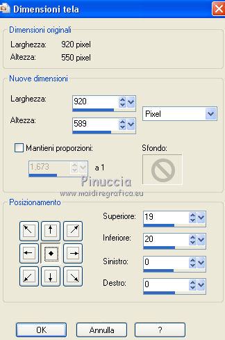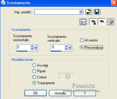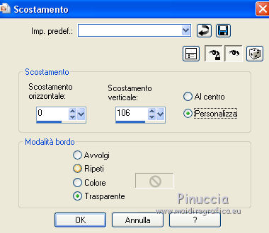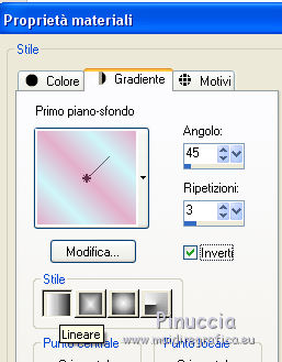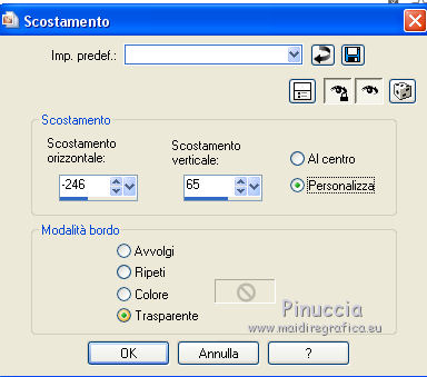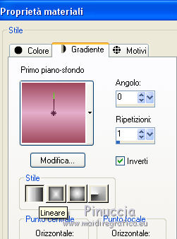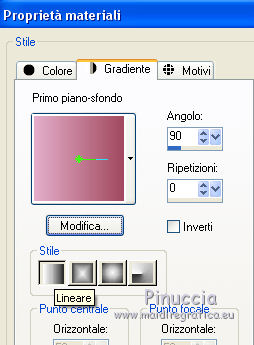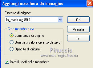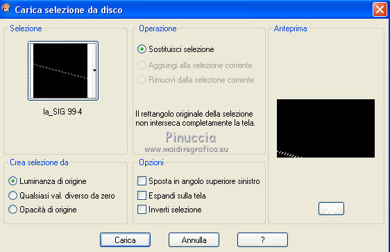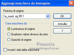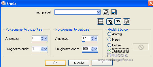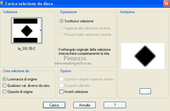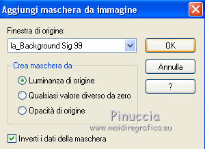 qui puoi trovare qualche risposta ai tuoi dubbi. Se l'argomento che ti interessa non è presente, ti prego di segnalarmelo. Il copyright del tutorial appartiene a Laguna Azul. Questo tutorial è stato creato con CorelX7 e tradotto con CorelX e CorelX2, ma può essere realizzato anche con le altre versioni di PSP. Dalla versione X4, il comando Immagine>Rifletti è stato sostituito con Immagine>Capovolgi in orizzontale, e il comando Immagine>Capovolgi con Immagine>Capovolgi in verticale. Nelle versioni X5 e X6, le funzioni sono state migliorate rendendo disponibile il menu Oggetti. Con la nuova versione X7, sono tornati Rifletti>Capovolgi, ma con nuove varianti. Vedi la scheda sull'argomento qui Traduzione francese/traduction en français qui Le vostre versioni qui Occorrente: Un tube a scelta. Il resto del materiale qui Per il tube usato grazie Tocha. (in questa pagina trovi i links ai siti dei creatori di tubes) Filtri: se hai problemi con i filtri, consulta la mia sezione filtri qui Filters Unlimited 2.0 qui AAA Frames - Foto Frame qui &<Bkg Designer sf10II> - Diamonds, MURU's Wave (da importare in Unlimited) qui &<Bkg Designer sf10III> - SIM 4 Way Average, VMT Trimosaic (da importare in Unlimited) qui Alien Skin Eye Candy 5 Impact - Extrude qui Simple - Blintz, Pizza Slice Mirror qui VM Toolbox - Zoom Blur qui I filtri Simple e VM Toolbox si possono usare da soli o importati in Filters Unlimited. come fare vedi qui) Se un filtro fornito appare con questa icona ![]() non esitare a cambiare modalità di miscelatura e opacità secondo i colori utilizzati. Nelle ultime versioni di PSP non c'è il gradiente di primo piano/sfondo (Corel_06_029) Puoi usare i gradienti delle versioni precedenti. Trovi qui i gradienti Corel X. Metti lo script nella cartella Script sicuri. Metti le selezioni nella cartella Selezioni (la selezione 7 non sarà utilizzata). Apri la maschera in PSP e minimizzale con il resto del materiale. 1. Scegli 4 colori dal tuo tube. Per l'esempio: ![]() Invece del nero, puoi anche usare un altro colore molto scuro dal tube. Non scegliere colori troppo luminosi. Imposta il colore di primo piano con il colore 1 #e4aeca, e il colore di sfondo con il colore 2 #a1495e. ![]() Passa il colore di primo piano a Gradiente di primo piano/sfondo, stile Lineare. ![]() 2. Apri l'immagine di sfondo la_Background Sig 99. Modifica>Copia, e minimizza l'immagine (che ti servirà per una maschera). Modifica>Incolla come nuova immagine. Questa copia sarà la base del tuo lavoro. Effetti>Effetti di bordo>Aumenta. Livelli>Nuovo livello raster. Riempi il livello con il gradiente.Effetti>Plugins>Filters Unlimited 2.0 - &<Bkg Designer sf10II> - Diamonds. ![]() Effetti>Plugins>Filters Unlimited 2.0 - &<Bkg Designer sf10II> - MURU's Wave. ![]() Abbassa l'opacità di questo livello all'80%. 3. Apri l'immagine di sfondo la_Background Sig 99 trans - e vai a Modifica>Copia. Torna al tuo lavoro e vai a Modifica>Incolla come nuovo livello. Effetti>Plugins>Simple - Pizza Slice Mirror. 4. Imposta il colore di primo piano con il colore 4 #ffffff Livelli>Nuovo livello raster. Riempi il livello con il colore bianco.Livelli>Nuovo livello maschera>Da immagine. Apri il menu sotto la finestra di origine e vedrai la lista dei files aperti. Seleziona la maschera LA_MASK sig 99 1. ![]() Livelli>Unisci>Unisci gruppo. Cambia la modalità di miscelatura di questo livello in Luce diffusa. 5. Livelli>Nuovo livello raster. Selezione>Carica/Salva selezione>Carica selezione da disco. Cerca e carica la selezione la_SIG 99-1. ![]() Modalità di corrispondenza dello strumento Riempimento su Nessuno, ![]() Riempi la selezione con il colore bianco (colore 4).Selezione>Deseleziona. Effetti>Plugins>VM Toolbox - Zoom Blur. ![]() Effetti>Effetti di distorsione>Onda. ![]() 6. Selezione>Carica/Salva selezione>Carica selezione da disco. Cerca e carica la selezione la_SIG 99-2. ![]() Apri il misted del fiore. Se usi un altro tube: Immagine>Ridimensiona, a 470 pixels di altezza. Regola>Messa a fuoco>Metti a fuoco. Modifica>Copia, e minimizza il tube, che ti servirà ancora. Torna al tuo lavoro e vai a Modifica>Incolla come nuovo livello. Spostalo al centro della selezione.![]() Premi sulla tastiera il tasto CANC ![]() Selezione>Deseleziona. Livelli>Unisci>Unisci visibile. 7. Effetti>Plugins>AAA Frames - Foto Frame. ![]() Immagine>Ridimensiona, al 40%, tutti i livelli non selezionato. ![]() Regola>Messa a fuoco>Metti a fuoco. Effetti>Effetti 3D>Sfalsa ombra. ![]() Effetti>Effetti di immagine>Scostamento. ![]() 8. Livelli>Nuovo livello raster. Livelli>Disponi>Sposta giù. Riporta il colore di primo piano al colore iniziale (#e4aeca) e al Gradiente. ![]() Riempi il livello con il gradiente.9. Imposta nuovamente il colore di primo piano con il colore 4 #ffffff. Livelli>Nuovo livello raster. Riempi con il colore bianco.Livelli>Nuovo livello maschera>Da immagine. Apri il menu sotto la finestra di origine e seleziona l'immagine di sfondo la_Background sig 99. ![]() Livelli>Unisci>Unisci gruppo. Livelli>Duplica. Immagine>Immagine negativa. Effetti>Effetti di distorsione>Onda. ![]() Cambia la modalità di miscelatura di questo livello in Luce diffusa. 10. Attiva il livello superiore. Livelli>Nuovo livello raster. Selezione>Carica/Salva selezione>Carica selezione da disco. Cerca e carica la selezione la_SIG 99-3. ![]() Riempi la selezione con il colore 4 #ffffff.Selezione>Modifica>Contrai - 1 pixel. Premi sulla tastiera il tasto CANC. Selezione>Deseleziona. Livelli>Duplica. Effetti>Effetti di immagine>Scostamento. ![]() Cambia la modalità di miscelatura di questo livello in Luce diffusa. 11. Livelli>Nuovo livello raster. Selezione>Carica/Salva selezione>Carica selezione da disco. Cerca e carica la selezione la_SIG 99-4. ![]() Ingrandisci l'immagine per vedere meglio. Riempi la selezione con il colore 4 #ffffff.Selezione>Deseleziona. 12. Livelli>Nuovo livello raster. Selezione>Carica/Salva selezione>Carica selezione da disco. Cerca e carica la selezione