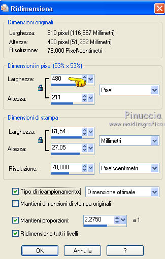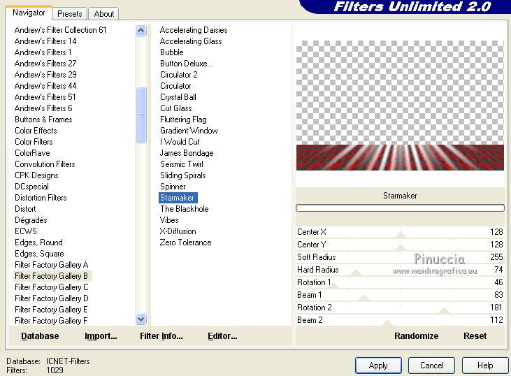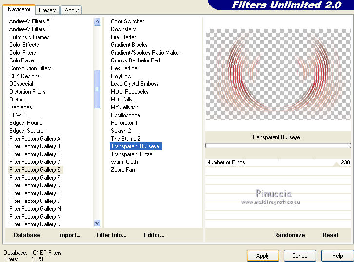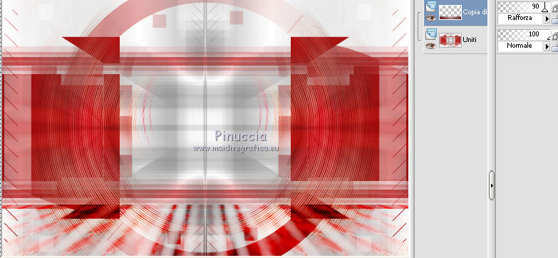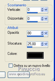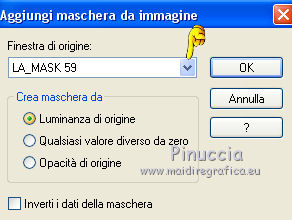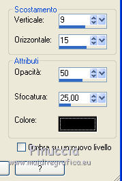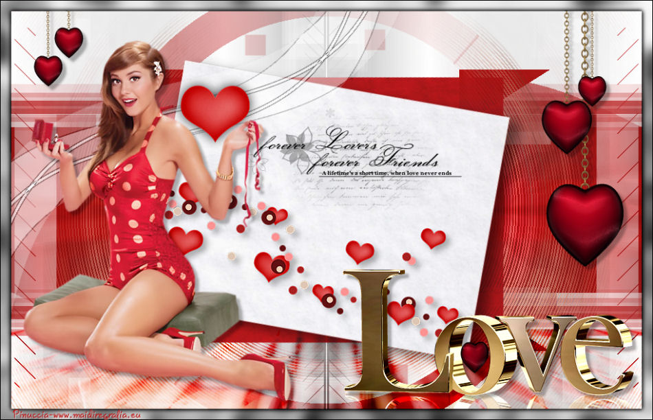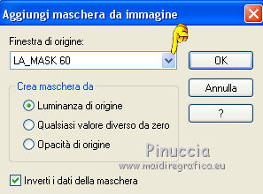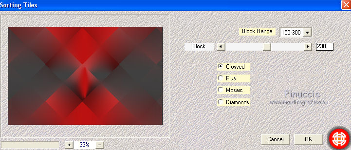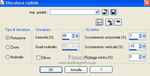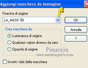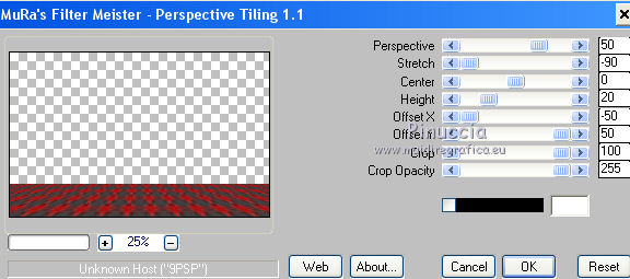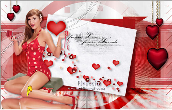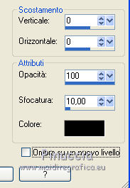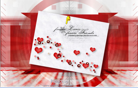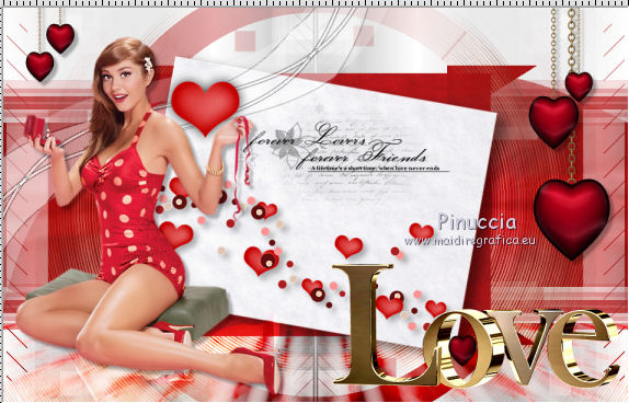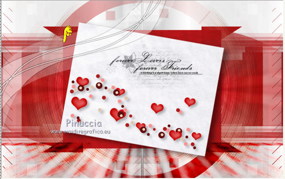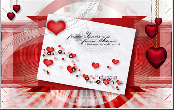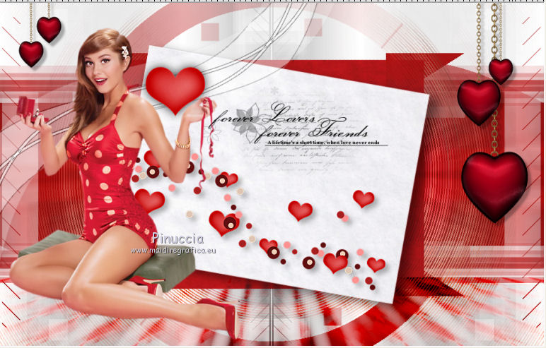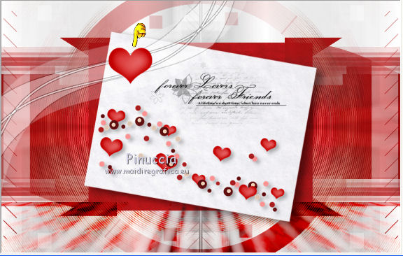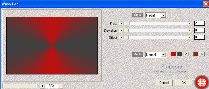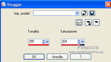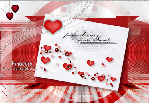 qui puoi trovare qualche risposta ai tuoi dubbi. Se l'argomento che ti interessa non è presente, ti prego di segnalarmelo. Il copyright del tutorial appartiene a Laguna Azul. Questo tutorial è stato creato con CorelX2, ma può essere realizzato anche con le altre versioni di PSP. Dalla versione X4, il comando Immagine>Rifletti è stato sostituito con Immagine>Capovolgi in orizzontale, e il comando Immagine>Capovolgi con Immagine>Capovolgi in verticale. Nelle versioni X5 e X6, le funzioni sono state migliorate rendendo disponibile il menu Oggetti. Vedi la scheda sull'argomento qui Per tradurrlo ho usato PSP X. Traduzione francese/traduction en français qui Occorrente: Un tube a scelta. Il resto del materiale qui Il tube utilizzato è di Tocha. Filtri: se hai problemi con i filtri, consulta la mia sezione filtri qui Filters Unlimited 2.0 qui Filter Factory Gallery E - Transparent Bullseye qui Filter Factory Gallery B - Starmaker qui Mura's Meister - Perspective Tiling qui Mehdi - Wavy Lab, Sorting Tiles qui I filtri Factory Gallery si possono usare da soli o importati in Filters Unlimited. come fare vedi qui) Se un filtro fornito appare con questa icona ![]() Apri le maschere in PSP e minimizzale con il resto del materiale. 1. Imposta il colore di primo piano con il colore bianco #ffffff. Apri una nuova immagine trasparente 950 x 600 pixels, e riempila con il colore bianco.Imposta il colore di primo piano con #404040. Scegli un colore scuro dal tuo tube e impostalo come colore di sfondo. Per l'esempio #bc1111. 2. Livelli>Nuovo livello maschera>Da immagine. Apri il menu sotto la finestra di origine e vedrai la lista dei files aperti. Seleziona la maschera LA_MASK 58, con i seguenti settaggi. ![]() Livelli>Unisci>Unisci gruppo. 3. Livelli>Nuovo livello raster. Riempi con il colore di primo piano #404040.Livelli>Nuovo livello maschera>Da immagine. Apri il menu sotto la finestra di origine e seleziona la maschera LA_MASK 59, con i seguenti settaggi. ![]() Livelli>Unisci>Unisci gruppo. 4. Apri il tuo tube. Immagine>Ridimensiona, a 450 pixels di altezza, tutti i livelli selezionato. ![]() Modifica>Copia. Torna al tuo lavoro e vai a Modifica>Incolla come nuovo livello. Spostalo a destra (vedi l'esempio).![]() Livelli>Duplica. Immagine>Rifletti. Livelli>Unisci>Unisci giù. 5. Regola>Sfocatura>Sfocatura radiale. ![]() Effetti>Plugins>Filters Unlimited 2.0 - Filter Factory Gallery E - Transparent Bullseye. ![]() Regola>Messa a fuoco>Metti a fuoco. 6. Livelli>Nuovo livello raster. Riempi con il colore di primo piano.Livelli>Nuovo livello maschera>Da immagine. Apri il menu sotto la finestra di origine e seleziona la maschera LA_MASK 60, con i seguenti settaggi. ![]() Livelli>Unisci>Unisci gruppo. Cambia la modalità di miscelatura di questo livello in Sovrapponi. ![]() 7. Livelli>Unisci>Unisci visibile. Livelli>Duplica. Effetti>Plugins>Mehdi - Wavy Lab. ![]() Effetti>Plugins>Mehdi - Sorting Tiles. ![]() Effetti>Plugins>Mura's Meister - Perspective Tiling. ![]() Effetti>Plugins>Filters Unlimited 2.0 - Filter Factory Gallery B - Starmaker. ![]() Cambia la modalità di miscelatura di questo livello in Rafforza, e abbassa l'opacità al 90%. ![]() 8. Apri l'immagine di sfondo "LA_Paper grey" e vai a Modifica>Copia. Torna al tuo lavoro e vai a Modifica>Incolla come nuovo livello. Apri la paletta del colore di sfondo, e prendi nota dei valori di Tonalità (H) e Saturazione (S) del tuo colore di sfondo. ![]() Regola>Tonalità e saturazione>Viraggio, e trascrivi i valori annotati nelle rispettive caselle, abbassando eventalmente la Saturazione se il colore è troppo forte. ![]() Cambia la modalità di miscelatura di questo livello in Scurisci. 9. Apri l'immagine di sfondo "LA_Paper white" e vai a Modifica>Copia. Torna al tuo lavoro e vai a Modifica>Incolla come nuovo livello. Apri il tube "LA_deco hearts". Immagine>Ridimensiona, a 480 pixels di larghezza, tutti i livelli selezionato. ![]() Modifica>Copia. minimizza il tube che ti servirà ancora. Torna al tuo lavoro e vai a Modifica>Incolla come nuovo livello. Regola>Messa a fuoco>Metti a fuoco. Effetti>Effetti di immagine>Scostamento. ![]() Livelli>Unisci>Unisci giù. Immagine>Ruota per gradi - 10 gradi a destra. ![]() Regola>Messa a fuoco>Metti a fuoco. Effetti>Effetti 3D>Sfalsa ombra. ![]() 10. Apri il tube "la_brush" e vai a Modifica>Copia. Torna al tuo lavoro e vai a Modifica>Incolla come nuovo livello. Spostalo un po' più in alto a destra sulla carta bianca, vedi l'esempio.![]() Apri il tube "la_deco white" e vai a Modifica>Copia. Torna al tuo lavoro e vai a Modifica>Incolla come nuovo livello. Spostalo a sinistra, come nell'esempio.![]() Apri il tube "la_heart single" e vai a Modifica>Copia. Torna al tuo lavoro e vai a Modifica>Incolla come nuovo livello. Spostalo sull'onda.![]() Effetti>Effetti 3D>Sfalsa ombra. ![]() 11. Apri il tube "la_small hearts" e vai a Modifica>Copia. Torna al tuo lavoro e vai a Modifica>Incolla come nuovo livello. Spostalo nell'angolo in alto a sinistra.(eventualmente, più tardi, in base al tuo tube, potrai posizionarlo meglio). ![]() Effetti>Effetti 3D>Sfalsa ombra. ![]() 12. Apri il tube "la_big hearts" e vai a Modifica>Copia. Torna al tuo lavoro e vai a Modifica>Incolla come nuovo livello. Spostalo nell'angolo in alto a destra.![]() Effetti>Effetti 3D>Sfalsa ombra, con i settaggi precedenti. 13. Attiva nuovamente il tuo tube. Modifica>Annulla azione Ridimensiona, e avrai nuovamente il tube nelle dimensioni originali. Immagine>Ridimensiona, a 550 pixels di altezza, tutti i livelli selezionato. Regola>Messa a fuoco>Metti a fuoco. Modifica>Copia. Torna al tuo lavoro e vai a Modifica>Incolla come nuovo livello. Spostalo in basso a sinistra, tra i cuori.![]() Livelli>Duplica. Immagine>Capovolgi. Sposta questo tube in basso, contro l'originale,per creare il "riflesso". Eventualmente, secondo il tube scelto, ruotalo quando necessario. ![]() Cambia la modalità di miscelatura di questo livello in Sovrapponi. Livelli>Disponi>Spo