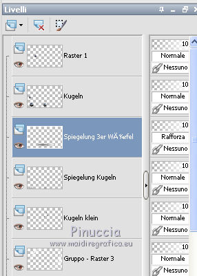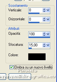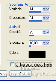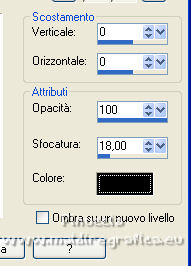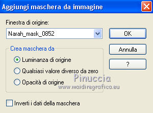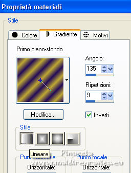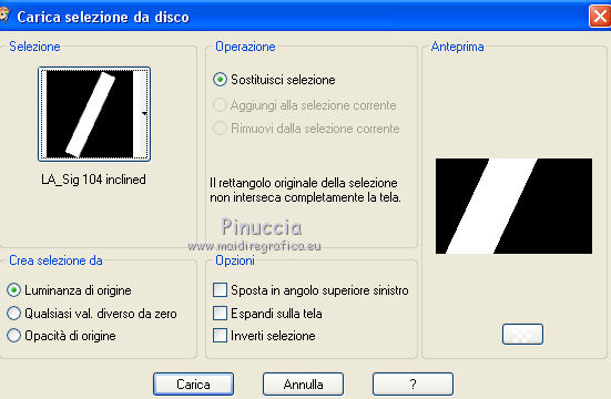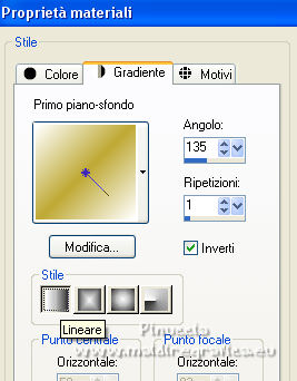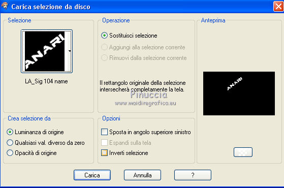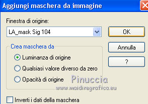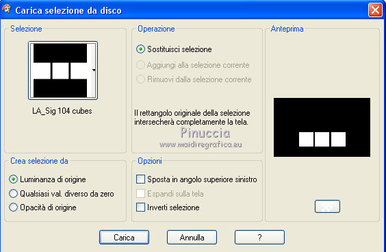 qui puoi trovare qualche risposta ai tuoi dubbi. Se l'argomento che ti interessa non è presente, ti prego di segnalarmelo. Il copyright del tutorial appartiene a Laguna Azul. Questo tutorial è stato creato con PspX9 e tradotto con CorelX e CorelX2, ma può essere realizzato anche con le altre versioni di PSP. Dalla versione X4, il comando Immagine>Rifletti è stato sostituito con Immagine>Capovolgi in orizzontale, e il comando Immagine>Capovolgi con Immagine>Capovolgi in verticale. Nelle versioni X5 e X6, le funzioni sono state migliorate rendendo disponibile il menu Oggetti. Con la nuova versione X7, sono tornati Rifletti>Capovolgi, ma con nuove varianti. Vedi la scheda sull'argomento qui Traduzione francese/traduction en français qui Le vostre versioni quiOccorrente: Un tube a scelta (il tube usato nel tutorial originale è un tube soggetto a licenza). Il resto del materiale qui Per il tube usato nella mia versione grazie Beatriz. Il resto del materiale è di Laguna Azul (in questa pagina trovi i links ai siti dei creatori di tubes) Filtri: in caso di dubbi, ricorda di consultare la mia sezione filtri qui Filters Unlimited 2.0 qui Filters Unlimited 2.0 - versione in files 8bf qui &<Bkg Designer sf10I> - Cruncher (da importare in Unlimited) qui Alien Skin Eye Candy 5 Impact - Extrude, Perspective Shadow qui °v° Kiwi Oelfilter - 3,5 Promille qui I filtri Kiwi si possono usare da soli o importati in Filters Unlimited (come fare vedi qui) Se un filtro fornito appare con questa icona ![]() non esitare a cambiare modalità di miscelatura e opacità secondo i colori utilizzati. Nelle ultime versioni di PSP non c'è il gradiente di primo piano/sfondo (Corel_06_029) Puoi usare i gradienti delle versioni precedenti. Trovi qui i gradienti Corel X. Metti i presets Cliccando sul file una o due volte (a seconda delle tue impostazioni), automaticamente il preset si installerà nella cartella corretta. perchè uno o due clic vedi qui Metti le selezioni nella cartella Selezioni. Apri le maschere in PSP e minimizzale con il resto del materiale. ![]() Imposta il colore di primo piano con un colore medio del tuo tube, e il colore di sfondo con un colore un po' più scuro. Dovrebbero essere diversi ma in armonia. I miei colori: primo piano #bea834, sfondo #230b58. ![]() Passa il colore di primo piano a Gradiente di primo piano/sfondo, stile Apri l'immagine LA_Anari. Questa immagine, che sarà la base del tuo lavoro, è composta da vari livelli. ![]() E' attivo il livello inferiore, Anfang (inizio). Riempi il livello trasparente con il gradiente.2. Imposta il colore di primo piano con il colore bianco. Livelli>Nuovo livello raster. Riempi il livello con il colore bianco.Livelli>Nuovo livello maschera>Da immagine. Apri il menu sotto la finestra di origine e vedrai la lista dei files aperti. Seleziona la maschera LA_mask Sig 104x. ![]() Livelli>Unisci>Unisci gruppo. 3. Riporta il colore di primo piano al colore iniziale #bea834. Livelli>Nuovo livello raster. Selezione>Carica/Salva selezione>Carica selezione da disco. Cerca e carica la selezione LA_Sig 104 inclined. ![]() Riempi la selezione con il colore di primo piano.Selezione>Deseleziona. Effetti>Plugins>Filters Unlimited 2.0 - &<Bkg Designer sf10I> - Cruncher, con i settaggi standard. il risultato di questo effetto cambia secondo la versione di Unlimited utilizzata: con la versione software di Unlimited ![]() con la versione di Unlimited che non si installa perchè composta da files in formato 8bf. ![]() Ripeti l'Effetto una seconda volta. Risultato con Unlimited software ![]() Risultato con Unlimited in files formato 8bf. ![]() Effetti>Effetti di bordo>Aumenta di più. Cambia la modalità di miscelatura di questo livello in Luce netta, (se è troppo luminoso puoi ridurre un po' l'opacità). Io ho abbassato l'opacità al 55%. 4. Imposta nuovamente il colore di primo piano con il colore bianco. Livelli>Nuovo livello raster. Riempi il livello con il colore bianco.Livelli>Nuovo livello maschera>Da immagine. Apri il menu sotto la finestra di origine e seleziona la maschera LA_Mask Sig 104. ![]() Livelli>Unisci>Unisci gruppo. Cambia la modalità di miscelatura di questo livello in Tonalità (esistente). 5. Livelli>Nuovo livello raster. Riempi con il colore bianco.Livelli>Nuovo livello maschera>Da immagine. Apri il menu sotto la finestra di origine e vedrai la lista dei files aperti. Seleziona la maschera Narah_Mask_0852. ![]() Livelli>Unisci>Unisci gruppo. 6. Attiva il livello Spiegelung 3er Würfel. ![]() Imposta nuovamente il colore di primo piano con il colore iniziale #bea834, e il colore di sfondo con il colore bianco. ![]() Passa il colore di primo piano a Gradiente di primo piano/sfondo, stile Lineare. ![]() Livelli>Nuovo livello raster. Selezione>Carica/Salva selezione>Carica selezione da disco. Cerca e carica la selezione LA_Sig 104 cubes. ![]() Riempi la selezione con il gradiente.Selezione>Deseleziona. Effetti>Plugins>Alien Skin Eye Candy 5 Impact - Extrude. Seleziona il preset LA_Sig 104 Extrude e ok. ![]() Effetti>Effetti di bordo>Aumenta. Livelli>Duplica. Cambia la modalità di miscelatura di questo livello in Sovrapponi, e abbassa l'opacità al 60%, o secondo i tuoi colori. Attiva il livello sottostante dell'originale. Effetti>Plugins>Alien Skin Eye Candy 5 Impact - Perspective Shadow. Seleziona il preset LA_Sig 104 Shadow e ok. ![]() 7. Torna al livello soprastante in modalità Sovrapponi. Livelli>Nuovo livello raster. Selezione>Carica/Salva selezione>Carica selezione da disco. Cerca e carica la selezione LA_Sig 104 symbole ![]() Mantieni selezionato. Effetti>Effetti 3D>Sfalsa ombra. ![]() Selezione>Deseleziona. 8. Attiva il livello soprastante, Kugeln (sfere). Riporta il colore di sfondo al colore iniziale #230b58, e cambia i settaggi del Gradiente. ![]() Livelli>Nuovo livello raster. Selezione>Carica/Salva selezione>Carica selezione da disco. Cerca e carica la selezione LA_Sig 104 Lines. ![]() Riempi la selezione con il colore scuro di s