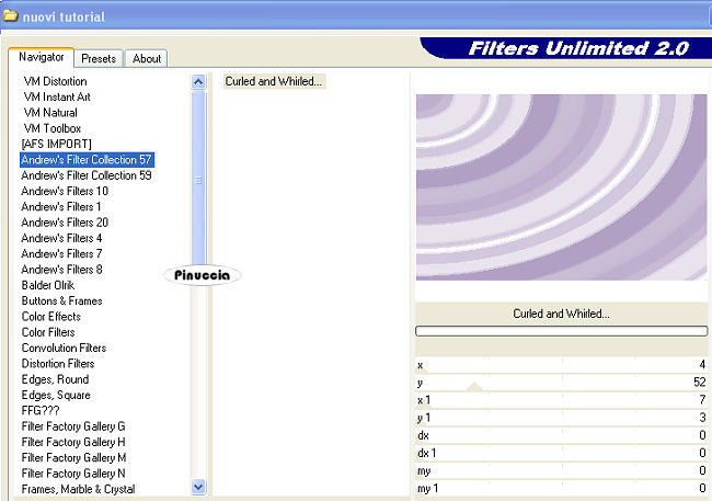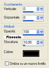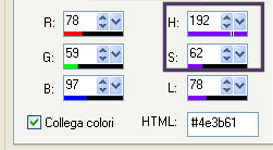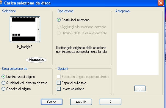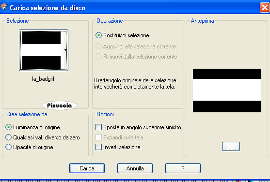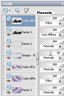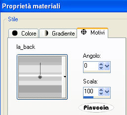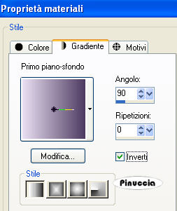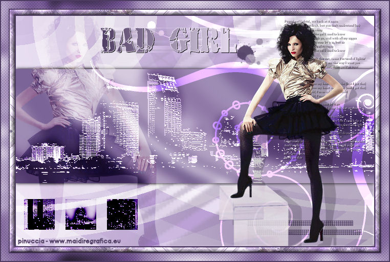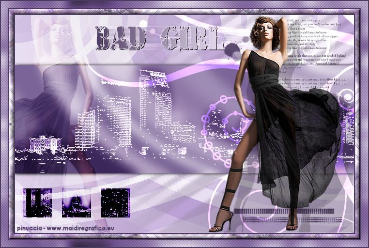 qui puoi trovare qualche risposta ai tuoi dubbi. Se l'argomento che ti interessa non è presente, ti prego di segnalarmelo. Questo tutorial è stato scritto con PSP X2, ma può essere eseguito anche con le altre versioni di PSP. Per tradurlo, ho usato PSP X. Il copyright del tutorial appartiene all'autrice. Il copyright della traduzione è mio. Per favore, rispetta il lavoro degli autori e mantieni i tube inalterati. Occorrente: Un tube a scelta. Il resto del materiale qui Per i miei esempi ho usato tubes di Graça, Yoka e 1Patries. Filtri: Filters Unlimited qui Simple qui Andrew's Filter 57 qui per usare i filtri Andrew's bisogna prima convertirli. Come fare vedi qui Si usano importandoli in Filters Unlimited (come fare vedi qui, ma possono funzionare anche da soli Metti le selezioni nella cartella Selezioni. Importa i pennelli in PSP: File>Importa>Pennello personalizzato, cerca i pennelli nella cartella dove li hai salvati - clicca "Aggiungi tutti", i pennelli passeranno nella finestra a destra; clicca ok e avrai i pennelli disponibili. ![]() Apri il font e minimizzalo. Lo troverai nella lista dei font disponibili, quando ti servirà. ![]() 1. Apri una nuova immagine trasparente 700 x 450 pixels. Apri il file di sfondo la_back e minimizzalo nella tua area di lavoro. Passa il colore di primo piano a Motivi e seleziona il file che troverai nella lista dei motivi disponibili. ![]() Riempi l'immagine trasparente con questo motivo.Scegli dai tuoi tube un colore scuro e impostalo come colore di primo piano. Prendi nota dei valori di tonalità (H) e saturazione (S) di questo colore. ![]() 2. Regola>Tonalità e saturazione>Viraggio e trascrivi i valori annotati nelle rispettive caselle. ![]() 3. Effetti>Plugins>I.C.Net Software - Filters Unlimited 2.0 - Andrew's Filter 57 - Curled and Whirled, con i settaggi standard. ![]() Livelli>Duplica. Cambia la modalità di miscelatura di questo livello in Moltiplica. Livelli>Unisci>Unisci giù. Ancora Livelli>Duplica. Immagine>Rifletti. Cambia la modalità di miscelatura di questo livello in Filtra. 4. Livelli>Nuovo livello raster. Imposta il colore di sfondo con un colore chiaro scelto dai tuoi tube (il mio #e9dff2). Passa il colore di primo piano a Gradiente di primo piano/sfondo, con i seguenti settaggi: ![]() Riempi il livello con il gradiente.Apri la maschera caro06_v, e minimizzala nella tua area di lavoro. Livelli>Nuovo livello raster>Da immagine: apri il menu sotto la finestra di origine e vedrai tutti i files aperti. Seleziona la maschera con i seguenti settaggi: ![]() Livelli>Unisci>Unisci gruppo. Abbassa l'opacità di questo livello al 50%. 6. Selezione>Carica/Salva selezione>Carica selezione da disco. Cerca e carica la selezione la_badgirl: ![]() Premi sulla tastiera il tasto CANC ![]() 7. Mantieni selezionato. Attiva il livello centrale: ![]() Livelli>Duplica. Selezione>Inverti. Premi sulla tastiera il tasto CANC. Riporta la modalità di miscelatura di questo livello a Normale: ![]() Selezione>inverti. Regola>sfocatura>Sfocatura gaussiana - raggio 10. ![]() 8. Mantieni ancora selezionato. Attiva il livello superiore. Livelli>Nuovo livello raster. Effetti>Effetti 3D>Sfalsa ombra, con i seguenti settaggi, colore nero: ![]() Apri il tube la_dark-city e vai a Modifica>Copia. Torna al tuo lavoro e vai a Modifica>Incolla come nuovo livello. Non spostare il tube. Selezione>inverti. Premi sulla tastiera il tasto CANC. Selezione>Deseleziona. Regola>Tonalità e saturazione>Viraggio, con i settaggi precedenti. Cambia la modalità di miscelatura di questo livello in Luce diffusa. Livelli>Duplica. Cambia la modalità di miscelatura di questo livello in Filtra. ![]() 9. Selezione>Carica/Salva selezione>Carica selezione da disco. Cerca e carica la selezione la_badgirl2: ![]() Modifica>Incolla come nuovo livello (il tube la_dark-city è ancora in memoria). Regola>Tonalità e saturazione>Viraggio, con i settaggi precedenti. Immagine>Ridimensiona, al 60%, tutti i livelli non selezionato. Posiziona l'immagine nella selezione.![]() Premi sulla tastiera il tasto CANC. Effetti>Effetti 3D>Sfalsa ombra, con i settaggi precedenti. Selezione>Deseleziona. Cambia la modalità di miscelatura di questo livello in Rafforza. 10. Livelli>Nuovo livello raster. Riporta il colore di primo piano al colore scuro. Attiva lo strumento Pennello ![]() cerca e seleziona il pennello PmsBrush12 001, e applicalo in basso a destra cliccando con il tasto sinistro del mouse per usare il colore di primo piano. ![]() 11. Apri il tube Kat_NKDA_doodle_kit_05_01. Regola>Tonalità e saturazione>Viraggio, con i settaggi precedenti. Modifica>Copia. Torna al tuo lavoro e via a Modifica>Incolla come nuovo livello. Non spostarlo. Effetti>Effetti di immagine>Scostamento: ![]() Cambia la modalità di miscelatura di questo livello in Indebolisci. 12. Livelli>Nuovo livello raster. Seleziona il pennello aethereality-034-022, e applicalo in alto a destra, cliccando con il tasto destro del mouse per usare il colore chiaro di sfondo. Effetti>Effetti 3D>Sfalsa ombra, con i seguenti settaggi, colore nero. ![]() 13. Apri il tuo tube e vai a Modifica>Copia. Torna al tuo lavoro e vai a Modifica>Incolla come nuovo livello. Sposta il tube a sinistra.Cambia la modalità di miscelatura di questo livello in Luce diffusa. Attiva nuovamente il tube. Immagine>Ridimensiona, a 450 pixels di altezza. Regola>Messa a fuoco>Metti a fuoco. Modifica>Copia. Torna al tuo lavoro e vai a Modifica>Incolla come nuovo livello. Spostalo a destra.Effetti>Effetti 3D>sfalsa ombra, con i seguenti settaggi, colore nero. ![]() 14. Attiva lo strumento Testo , scegli un font o usa quello fornito,imposta il gradiente come colore di sfondo e scrivi un testo sull'immagine. Livelli>Converti in livello raster. Livelli>Duplica e attiva il livello sottostante. Effetti>Effetti di distorsione>Vento - da sinistra, intensità 100. ![]() Attiva il livello superiore. Effetti>Effetti 3D>sfalsa ombra, con i seguenti settaggi, colore nero. ![]() Se vuoi: Live