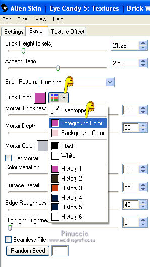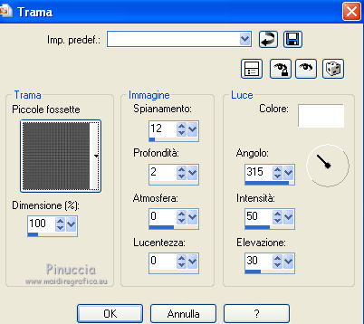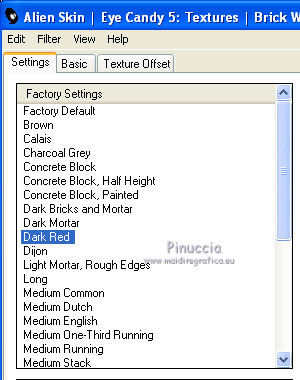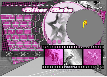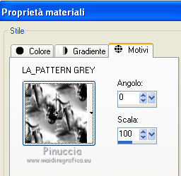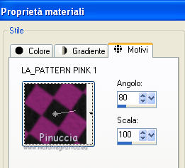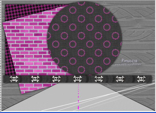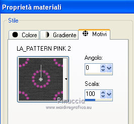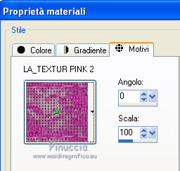 qui puoi trovare qualche risposta ai tuoi dubbi. Se l'argomento che ti interessa non è presente, ti prego di segnalarmelo. Questo tutorial è stato scritto con PSP X2, ma può essere eseguito anche con le altre versioni di PSP. Il copyright del tutorial, del materiale scrap e dei poser appartiene a Laguna Azul. Il copyright della traduzione è mio. Il copyright dei tubes e delle immagini appartiene ai rispettivi artisti. Per favore, rispetta il lavoro degli autori. Occorrente: Materiale qui Filtri: Alien Skin Eye Candy 5 Textures qui Animation Shop qui ![]() 1. Apri "LA_BIKER TEMPLATE", che sarà la base del tuo lavoro. Le istruzioni che seguono si riferiscono al materiale usato per il mio esempio. Se vuoi usare altri colori, usa il materiale corrispondente al tuo colore. Nella cartella "LA_BIKER KIT" trovi una seconda cartella "LA_PATTERN-TEXTUREN". Da questa seconda cartella apri "LA_PATTERN PINK 1" e minimizza. Passa il colore di primo piano a Motivi e seleziona la trama con i seguenti settaggi. ![]() 2. Attiva lo strumento Bacchetta magica , sfumatura e tolleranza 0.Attiva il livello "QUADRAT GROSS 1" e clicca nel quadrato per selezionarlo. se vuoi visualizzare meglio i tuoi passaggi, puoi chiudere i livelli soprastanti, e renderli visibili successivamente Riempi la selezione con il motivo di primo piano.Selezione>Deseleziona. Effetti>Effetti 3D>Sfalsa ombra. ![]() 3. Attiva il livello "QUADRAT GROSS 2". Seleziona il quadro con la bacchetta magica ![]() Imposta il colore di primo piano con un colore medio scelto dal tuo lavoro - per il mio esempio #c648a7, e riempi la selezione con questo colore.Effetti>Plugins>Alien Skin Eye Candy 5 Texture - Brick Wall: seleziona il preset Dark Red, e sotto Basic imposta il tuo colore di primo piano. ![]() Selezione>Deseleziona. Effetti>Effetti 3D>Sfalsa ombra, con i settaggi precedenti. 4. Attiva il livello "STRASSEN LINIE". Colorizza per adattarlo ai tuoi colori (per il mio esempio non è necessario). Sul viraggio vedi qui 5. Apri il tube "LA_WITH LINIE" e vai a Modifica>Copia. Torna al tuo lavoro e vai a Modifica>Incolla come nuovo livello. Effetti>Effetti di immagine>Scostamento. ![]() 6. Apri la trama "LA_PATTERN PINK 2" e minimizzala. Impostala come motivo di primo piano con i seguenti settaggi. ![]() Attiva il livello "KREISS GROSS". Seleziona il cerchio con la bacchetta magica ![]() e riempilo con il nuovo motivo di primo piano.Selezione>Deseleziona. Effetti>Effetti 3D>Sfalsa ombra, con i settaggi precedenti. 7. Attiva il livello "RECKTECK SCHMAL". Apri il tube "LA_SKULL RIBBON" e vai a Modifica>Copia. Torna al tuo lavoro e vai a Modifica>Incolla come nuovo livello. Posiziona il tube sulla striscia grigia.Elimina o chiudi il livello "RECHTECK SCHMAL". Sul livello del tube: Effetti>Effetti 3D>Sfalsa ombra, con i settaggi precedenti. ![]() 8. Attiva il livello "METALGITTER". Effetti>Effetti 3D>Sfalsa ombra, con i settaggi precedenti. 9. Apri la trama "LA_PATTERN GREY" e minimizzala. Imposta la trama come Motivo di primo piano, con i settaggi precedenti. ![]() Attiva il livello "RECHTECK DUNKEL". Seleziona con la bacchetta magica ![]() e riempi con il nuovo motivo di primo piano.Selezione>Deseleziona. Effetti>Effetti 3D>Sfalsa ombra, con i settaggi precedenti. 10. "Apri la trama "LA_TEXTUR PINK 2" e minimizzala. Imposta la trama come motivo di primo piano, con i settaggi precedenti. ![]() Attiva il livello "RECHTECK HELL". Seleziona con la bacchetta magica ![]() e riempi con il motivo di primo piano.Selezione>Deseleziona. Effetti>Effetti 3D>Sfalsa ombra, con i settaggi precedenti. 11. Attiva il livello "RECHTECK SCHRIFT". Effetti>Effetti di trama>Trama - seleziona la trama Piccole fossette, con i seguenti settaggi. ![]() 12. Apri la trama "LA_TEXTUR PINK 1" e vai a Modifica>Copia. Attiva il livello "KREIS 1". Seleziona il cerchio con la bacchetta magica