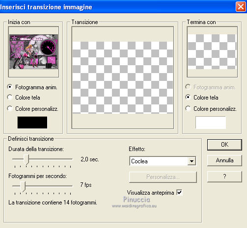 Modifica>Incolla nella selezione.Selezione>Deseleziona. 13. Se stai usando altri colori attiva il livello "Kreis 2" e colorizza. Apri il tube "LA_STARS SW" e vai a Modifica>Copia. Torna al tuo lavoro e vai a Modifica>Incolla come nuovo livello. Posiziona il tube nel cerchio.14. Attiva il livello "SCHRIFTZUG". se vuoi, puoi scrivere un tuo testo, con il colore bianco e posizionarlo al posto di quello esistente.Per il testo del template è stato usato il font Blazed Selezione>Seleziona tutto. Selezione>Mobile. Selezione>Modifica>Espandi - 3 pixels. Livelli>Nuovo livello raster. Livelli>Disponi>Sposta giù. Riporta il colore di primo piano al colore scelto (#c648a7) e riempi la selezione con il colore di primo piano.Di nuovo Selezione>Modifica>Espandi - 3 pixels. Ancora Livelli>Nuovo livello raster. Livelli>Disponi>Sposta giù. Imposta il colore di primo piano con il colore nero, e riempi la selezione con il colore nero.Selezione>Deseleziona. 15. Attiva il livello "BACK FILM RECHTS". Colorizza se stai usando altri colori. Seleziona con la bacchetta magica ![]() Livelli>Nuovo livello raster. Apri il primo sfondo "LA_BIKER BACK1" e vai a Modifica>Copia. Torna al tuo lavoro e vai a Modifica>Incolla nella selezione. Selezione>Deseleziona. Cambia la modalità di miscelatura di questo livello in Sovrapponi. Effetti>Effetti di bordo>Aumenta. 16. Attiva il livello "BACK FILM MITTE". Seleziona con la bacchetta magica ![]() Apri il secondo sfondo "LA_BIKER BACK2" e vai a Modifica>Copia. Torna al tuo lavoro (in questo caso non devi aggiungere un nuovo livello) e vai a Modifica>Incolla nella selezione. Selezione>Deseleziona. Effetti>Effetti di bordo>Aumenta. 17. Attiva il livello "BACK FILM LINKS". Seleziona con la bacchetta magica ![]() Livelli>Nuovo livello raster. Apri il terzo sfondo "LA_BIKER BACK3" e vai a Modifica>Copia. Torna al tuo lavoro e vai a Modifica>Incolla nella selezione. Selezione>Deseleziona. Cambia la modalità di miscelatura di questo livello in Sovrapponi. Effetti>Effetti di bordo>Aumenta. 18. Attiva il livello "STERN 1". Effetti>Effetti 3D>Sfalsa ombra, con i settaggi precedenti. 19. Attiva il livello "KLEINE QUADRATE". Effetti>Effetti 3D>Sfalsa ombra, con i settaggi precedenti. Se stai usando altri colori, colorizza il livello "KREIS RAND RAUTE". 20. Attiva il livello "STERN 2". Effetti>Effetti 3D>Sfalsa ombra, con i settaggi precedenti. Adesso puoi decorare il tuo lavoro, utilizzando il materiale fornito. Ridimensiona quanto necessario, senza dimenticare di mettere a fuoco. Applica l'Effetto Sfalsa ombra, con i settaggi precedenti. Non mettere nulla sul livello "KREIS TOU" che deve rimanere libero. ![]() Questo il mio esempio: ![]() 21. Quando tutto è a posto e sei soddisfatto, aggiungi il tuo nome e/o il tuo watermark, senza dimenticare il copyright delle immagini usate. Modifica>Copia Unione. 22. Apri il tube "LA_@TOURENZÄHLER" con il tuo colore. Immagine>Ridimensiona - al 50%, tutti i livelli selezionato. ![]() Immagine>Dimensioni tela, con i seguenti settaggi. ![]() E adesso il tube ha dimensione e posizione corrette per il tuo lavoro. ![]() 24. Attiva il livello inferiore e vai a Modifica>Incolla come nuovo livello. (Stai incollando il tuo lavoro copiato al punto 22). Chiudi tutti i livelli dell'orologio tranne il livello "TOUR 1". Modifica>Copia Unione. Apri Animation Shop e vai a Modifica>Incolla>Incolla come nuova animazione. Torna in PSP. Chiudi il livello "TOUR 1" e apri il livello "TOUR 2". Modifica>Copia Unione. Torna in Animation Shop e vai a Modifica>Incolla>Incolla dopo il fotogramma corrente. E così via, con i livelli successivi fino al livello "TOUR 24". 25. Alla fine avrai in Animation Shop una animazione composta da 24 fotogrammi. Modifica>Seleziona tutto. Animazione>Proprietà fotogramma e imposta la velocità a 7. Clicca sul primo fotogramma per selezionarlo. Animazione>Proprietà fotogramma e imposta la velocità a 100. Clicca sull'ultimo fotogramma. Animazione>Proprietà fotogramma e imposta la velocità a 20. Se vuoi, salta il prossimo passaggio. Controlla il risultato cliccando su Visualizza ![]() e salva in formato gif. ![]() 26. Se vuoi realizzare la seconda animazione, clicca sull'ultimo fotogramma per selezionarlo. Effetti>Inserisci transizione immagine e seleziona Coclea con i seguenti settaggi. ![]() Elimina gli ultimi 3 fotogrammi. Clicca sull'ultimo fotogramma (35) per selezionarlo e imposta la velocità a 57. Controlla il risultato cliccando su Visualizza ![]() e salva in formato gif. ![]() Se hai problemi o dubbi, o trovi un link non funzionante, o anche soltanto per un saluto, scrivimi. 22 Maggio 2012 |
