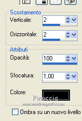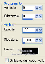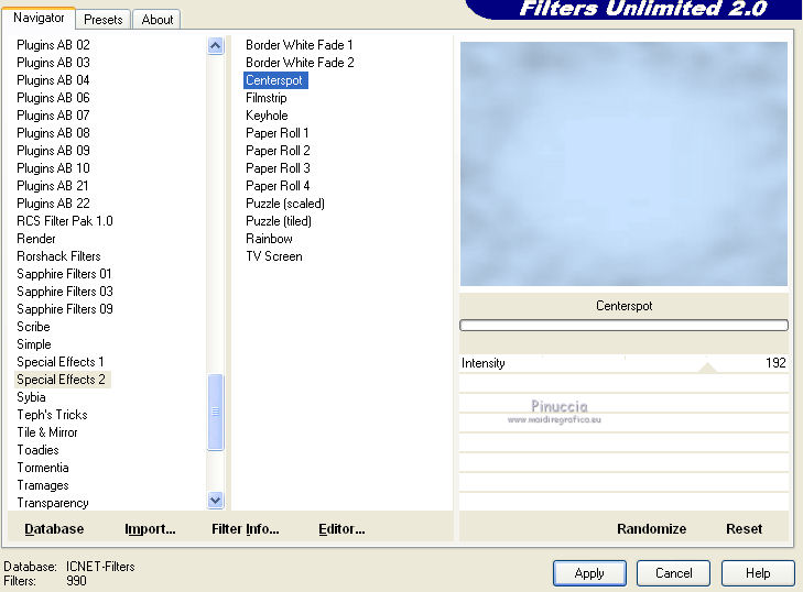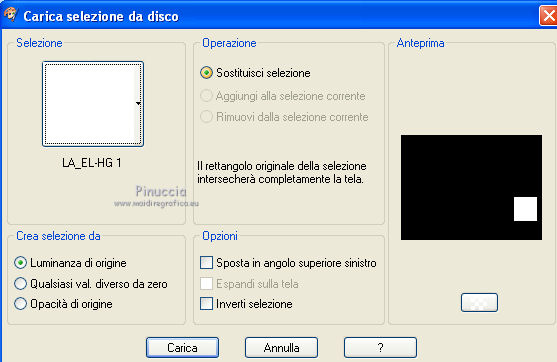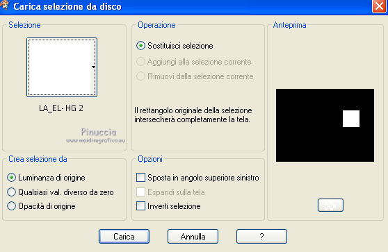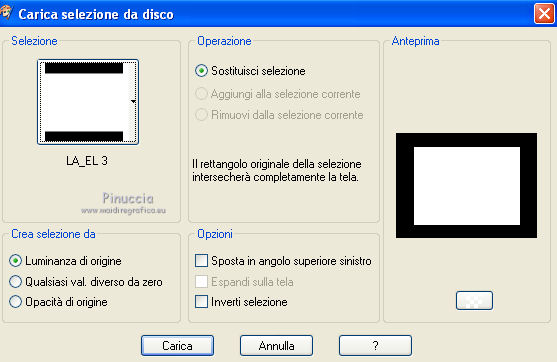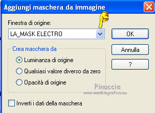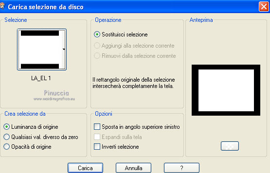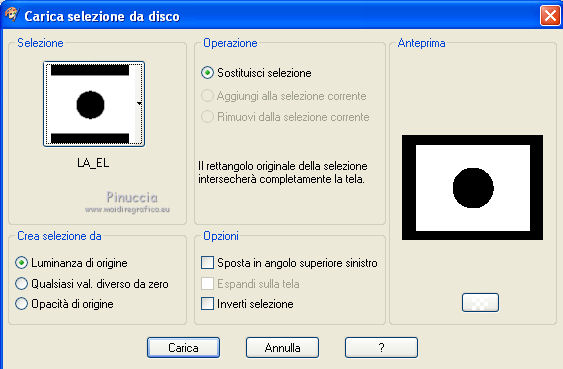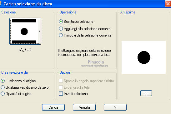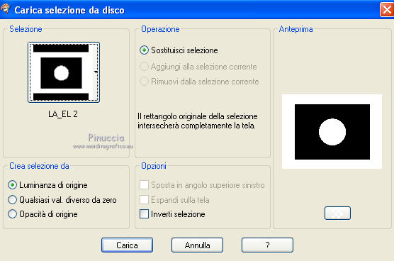 qui puoi trovare qualche risposta ai tuoi dubbi. Se l'argomento che ti interessa non è presente, ti prego di segnalarmelo. Questo tutorial è stato scritto con PSP X2, ma può essere eseguito anche con le altre versioni di PSP. Il copyright del tutorial, del materiale scrap e dei poser appartiene a Laguna Azul. Il copyright della traduzione è mio. Il copyright dei tubes e delle immagini appartiene ai rispettivi artisti. Per favore, rispetta il lavoro degli autori. Occorrente: A scelta un'immagine di sfondo (o un paesaggio astratto o di fantasia). Per il mio esempio ho usato l'immagine di sfondo ABSTRACT, di Moni http://monismagicalpictures.blogspot.de/search/label/Fantasy qui Uno o due tube a scelta (i tubes usati sono stati tolti dal materiale perchè non più disponiibili per il download. Il resto del materiale qui Filtri: Filters Unlimited 2.0 qui Animation Shop qui ![]() Metti le selezioni nella cartella Selezioni. Apri la maschera in LA_MASK ELECTRO in Psp e minimizzala con il resto del materiale. 1. Apri una nuova immagine trasparente 800 x 600 pixels. Scegli due colori dai tuoi tubes o dallo sfondo. Imposta il colore di primo piano con il colore chiaro (il mio #c9e3ff), e il colore di sfondo con il colore scuro (poichè il mio tube indossa un vestito nero ho scelto il colore blu #004067). 2. Riempi l'immagine trasparente con il colore di primo piano.Effetti>Plugins>Filters Unlimited 2.0 - Special Effects 2 - Centerspot. ![]() 3. Apri la tua immagine di sfondo e porta le dimensioni a una larghezza di 800 pixels circa; l'altezza non deve essere inferiore a 600 pixels. Le proporzioni devono essere mantenute; vedi l'esempio. ![]() Modifica>Copia. Torna al tuo lavoro e vai a Modifica>Incolla come nuovo livello. Cambia la modalità di miscelatura di questo livello in Filtra, o quello che preferisci. d'ora in poi tradurrò le modalità indicate nel tutorial e non ripeterò che puoi sempre adattare queste modalità alle tue esigenze Livelli>Duplica. Attiva il livello sottostante dell'originale. Selezione>Carica/Salva selezione>Carica selezione da disco. Cerca e carica la selezione "LA_EL". ![]() Premi sulla tastiera il tasto CANC. 4. Attiva il livello superiore. Selezione>Carica/Salva selezione>Carica selezione da disco. Cerca e carica la selezione "LA_EL 0". ![]() Premi sulla tastiera il tasto CANC. Selezione>Deseleziona. Cambia la modalità di miscelatura di questo livello in Luce diffusa. 5. Livelli>Nuovo livello raster. Riempi con il colore di sfondo.Livelli>Nuovo livello maschera>Da immagine. Apri il menu sotto la finestra di origine e vedrai la lista dei files aperti. Seleziona la maschera "LA_MASK ELECTRO" con i seguenti settaggi. ![]() Livelli>Unisci>Unisci gruppo. Effetti>Effetti 3D>Sfalsa ombra. ![]() Effetti>Effetti di bordo>Aumenta. 6. Apri l'immagine di sfondo "LA_BACK, colorizza se necessario, e vai a Modifica>Copia. Torna al tuo lavoro e vai a Modifica>Incolla come nuovo livello. Cambia la modalità di miscelatura di questo livello in Luce diffusa. 7. Livelli>Nuovo livello raster. Selezione>Carica/Salva selezione>Carica selezione da disco. Cerca e carica la selezione "LA_EL 1". ![]() Effetti>Effetti 3D>Sfalsa ombra. ![]() Selezione>Deseleziona. 8. Apri il tube "LA_DECO LINIE H" e vai a Modifica>Copia. Torna al tuo lavoro e vai a Modifica>Incolla come nuovo livello. Effetti>Effetti di immagine>Scostamento. ![]() Cambia la modalità di miscelatura di questo livello in Luce diffusa. Livelli>Duplica. Immagine>Capovolgi. Immagine>Rifletti. 9. Attiva il livello inferiore. Livelli>Duplica. Livelli>Disponi>Porta in alto. Selezione>Carica/Salva selezione>Carica selezione da disco. Cerca e carica la selezione "LA_EL 2". ![]() Premi sulla tastiera il tasto CANC. Selezione>Deseleziona. Immagine>Immagine negativa. Se stai usando PSP 9: Regola>Bilanciamento colore>Immagine negativa Cambia la modalità di miscelatura di questo livello in Luminanza (Esistente). 10. Livelli>Nuovo livello raster. Selezione>Carica/Salva selezione>Carica selezione da disco. Cerca e carica la selezione "LA_EL 3". ![]() Effetti>Effetti 3D>Sfalsa ombra, con i settaggi precedenti. Selezione>Deseleziona. 11. Apri "LA_BACK DOTS" e vai a Modifica>Copia. Torna al tuo lavoro e vai a Modifica>Incolla come nuovo livello. 12. Apri il tube "LA_DOTS AND LINES" e vai a Modifica>Copia. Torna al tuo lavoro e vai a Modifica>Incolla come nuovo livello. 13. Scegli uno dei due tubes "LA_SHAPE..." (io ho usato il numero 2) e vai a Modifica>Copia. Torna al tuo lavoro e vai a Modifica>Incolla come nuovo livello. Effetti>Effetti di immagine>Scostamento. ![]() Cambia la modalità di miscelatura di questo livello in Filtra. 14. Apri il tube "LA_LINES" e vai a Modifica>Copia. Torna al tuo lavoro e vai a Modifica>Incolla come nuovo livello. Effetti>Effetti di immagine>Scostamento. ![]() Immagine>Immagine negativa. Se stai usando PSP 9: Regola>Bilanciamento colore>Immagine negativa Effetti>Effetti 3D>Sfalsa ombra. ![]() Cambia la modalità di miscelatura di questo livello in Luce diffusa. 15. Livelli>Nuovo livello raster. Selezione>Carica/Salva selezione>Carica selezione da disco. Cerca e carica la selezione "LA_EL_HG 1". ![]() Apri "LA_RAHMEN BACK" e vai a Modifica>Copia. Torna al tuo lavoro e vai a Modifica>Incolla nella selezione. 16. Mantieni selezionato. 17. Apri nuovamente la tua mmagine di sfondo. Se necessario colorizza. Modifica>Copia. Torna al tuo lavoro e vai a Modifica>Incolla come nuovo livello. Posiziona l'immagine nell'area selezionata.Mantieni ancora selezionato. Apri uno dei due tubes, eventualmente ridimensionalo un po' e vai a Modifica>Copia. Torna al tuo lavoro e vai a Modifica>Incolla come nuovo livello. Posizionalo nell'area selezionata(vedi il mio esempio per orientarti). Cambia la modalità di miscelatura di questo livello in Schiarisci. Selezione>Inverti. Premi sulla tastiera il tasto CANC. Attiva il livello sottostante dello sfondo, e premi nuovamente il tasto CANC. Selezione>Deseleziona. Questo il mio risultato