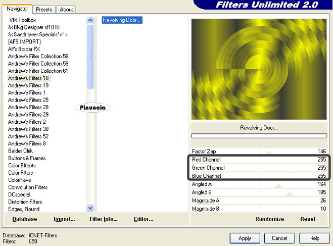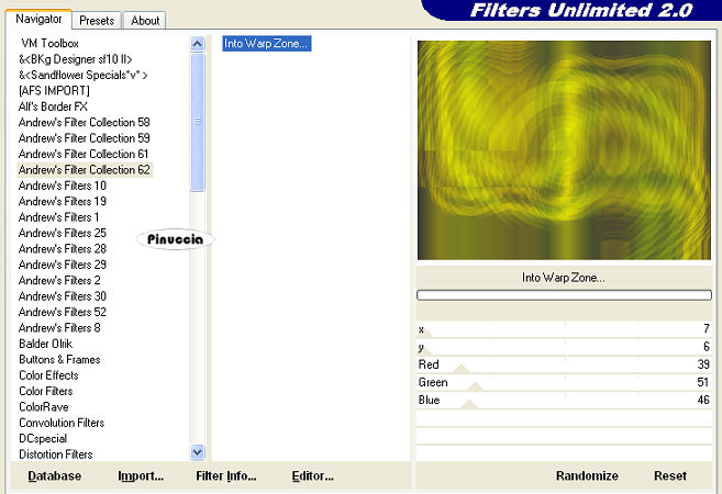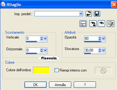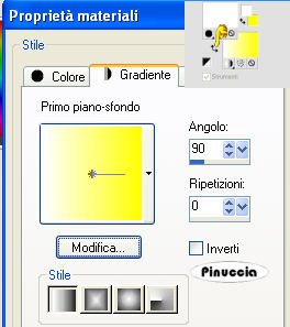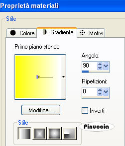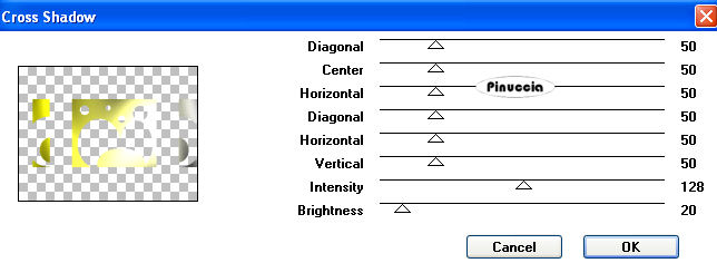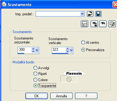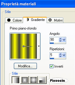 qui puoi trovare qualche risposta ai tuoi dubbi. Se l'argomento che ti interessa non è presente, ti prego di segnalarmelo. Questo tutorial è stato scritto con PSP X2, ma può essere eseguito anche con le altre versioni di PSP. Per tradurlo, ho usato PSP X. Il copyright del tutorial appartiene all'autrice. Il copyright della traduzione è mio. Occorrente: A scelta un tube appropriato. Il resto del materiale qui i tube usati per i miei esempi sono ©Popeye Wong Filtri: Graphics Plus qui Filters Unlimited qui Andrew's Filter 10 qui Andrew's Filter 62 qui I filtri Andrew's per essere usati devono prima essere convertiti. Come fare vedi qui Si usano importandoli in Filters Unlimited (come fare vedi qui) ma possono funzionare anche da soli ![]() Metti la selezione nella cartella Selezioni. Apri i font e minimizzali nella tua area di lavoro. Li troverai nella lista dei font disponibili quando ti serviranno. 1. Apri una nuova immagine trasparente 800 x 600 pixels. Scegli dal tuo tube un colore chiaro, ma forte (il mio #ffff00) e impostalo come colore di primo piano. Imposta il colore di sfondo con #3b3b37. Passa il colore di primo piano a Gradiente: ![]() Riempi l'immagine trasparente con il gradiente.2. Effetti>Plugins>Filters Unlimited 2.0 - Andrew's Filter 10 - Revolving Door: ![]() Se stai usando altri colori, dovrai regolare il settaggio di Red,Green e Blue channel Livelli>Duplica. 3. Effetti>Plugins>Filters Unlimited 2.0 - Andrew's Filter 62 - Into Warp Zone: ![]() Cambia la modalità di miscelatura di questo livello in Moltiplica. 4. Apri il tuo tube e vai a Modifica>Copia. Torna al tuo lavoro e vai a Modifica>Incolla come nuovo livello. Posiziona il tube in basso, come nell'esempio.![]() Cambia la modalità di miscelatura di questo livello in Luce diffusa, e rinomina il livello "Immagine 1". ![]() 5. Apri il tube "la_deko" e vai a Modifica>Copia. Torna al tuo lavoro e vai a Modifica>Incolla come nuovo livello. Effetti>Effetti di immagine>Scostamento: ![]() Effetti>effetti 3D>sfalsa ombra, con il colore di primo piano, ombra su nuovo livello selezionato: ![]() Ripeti l'Effetto Sfalsa ombra, con i seguenti settaggi. ![]() Attiva il livello superiore. Selezione>Seleziona tutto. Selezione>Mobile. Selezione>immobilizza. Attiva il livello sottostante (il livello dell'ombra: "Raster2 Ombra1") e premi sulla tastiera il tasto CANC. Selezione>Deseleziona. Attiva nuovamente il livello superiore, tasto destro del mouse e Elimina. 6. Nella paletta dei livelli rimane il livello dell'ombra contrassegnato da un numero 1. Questo numero è il collegamento che legava il livello dell'ombra a quello del tube. Clicca sul numero 1 per togliere il collegamento (deve apparire "Nessuno"). ![]() Livelli>Duplica. Immagine>Ruota per gradi - 90 gradi a destra: ![]() Effetti>Effetti di immagine>Scostamento: ![]() 7. Apri il tube "la_ball_variante". Attiva il livello "Balls". Questo passaggio è a titolo di esempio. Se hai usato i colori del tutorial, non sarà necessario. Prendi nota dei valori di Tonalità (H) e Saturazione (S) del tuo colore di primo piano. ![]() Regola>Tonalità e Saturazione>Viraggio e trascrivi i valori annotati nelle rispettive caselle. ![]() Livelli>Unisci>Unisci visibile. Modifica>Copia. Torna al tuo lavoro e vai a Modifica>incolla come nuovo livello. 8. Immagine>Ridimensiona, al 70%, tutti i livelli non selezionato. Sposta il tube in basso, come nel mio esempio.![]() Effetti>Effetti 3D>sfalsa ombra: ![]() Livelli>Duplica, e cambia la modalità di miscelatura di questo livello ìn Luce diffusa. 9. Livelli>Nuovo livello raster. Selezione>Carica/Salva selezione>Carica selezione da disco. Cerca e carica la selezione "la_Select Si 45". ![]() Imposta il colore di sfondo con il bianco, e cambia i settaggi del gradiente. ![]() Riempi la selezione con questo gradiente.Selezione>Deseleziona. Effetti>Plugins>Graphics Plus - Cross Shadow: ![]() Effetti>Effetti 3D>sfalsa ombra: ![]() 10. Attiva il livello "Immagine 1" e sistema la posizione del tube, come nell'esempio.A seconda del tube che hai usato, puoi ingrandirlo (Immagine>Ridimensiona...): nel mio esempio ho ridimensionato al 150%. ![]() Attiva il livello superiore. 11. Apri il pennello "moargh.de__symphony_1" e vai a Modifica>Copia. Torna al tuo lavoro e vai a Modifica>Incolla come nuovo livello. Sposta il pennello come ti sembra meglio. Questa la mia posizione.![]() Apri il secondo pennello "moargh.de__symphony_8" e vai a Modifica>Copia. Torna al tuo lavoro e vai a Modifica>Incolla come nuovo livello. Immagine>Immagine negativa. se stai usando PSP 9: Regola>Bilanciamento colore>Immagine negativa Spostalo nell'angolo in alto a sinistra (o dove preferisci).![]() 12. Apri il tube "la_trans_balls" e vai a Modifica>Copia. Torna al tuo lavoro e vai a Modifica>Incolla come nuovo livello. Apri il pennello "Yoka_Blockjes" e vai a Modifica>Copia. Torna al tuo lavoro e vai a Modifica>Incolla come nuovo livello. Spostalo nell'angolo in alto a destra.13. Attiva lo strumento Testo , e seleziona il font Echo,Inverti i colori nella paletta dei materiali e cambia i settaggi del gradiente. ![]() Posiziona il testo e, agendo sui nodi centrali della griglia dello strumento, allarga il testo. ![]() Quando appare l'icona dello spostamento, puoi posizionare il testo come preferisci. ![]() Livelli>Converti in livello raster. Regola>Messa a fuoco>Accentua messa a fuoco. Cambia la modalità di miscelatura di questo livello in Luce diffusa. Seleziona il font Walzer e scrivi nuovamente il testo sopra il precedente. Usando i nodi della griglia disponi il testo correttamente. ![]() Livelli>Converti in livello raster. Livelli>Duplica, e attiva il livello sottostante. Effetti>Effetti di distorsione>Vento - da sinistra, intensità 100: ![]() 14. Attiva il livello superiore. Effetti>Effetti 3D>sfalsa ombra. ![]() 15. Attiva nuovamente il tube della donna. Immagine>Ridimensiona - a 580 pixels di altezza. Modifica>Copia. Torna al tuo lavoro e vai a Modifica>Incolla come nuovo live