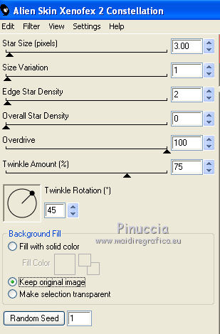 qui puoi trovare qualche risposta ai tuoi dubbi. Se l'argomento che ti interessa non è presente, ti prego di segnalarmelo. Questo tutorial è stato scritto con PSP X2, ma può essere eseguito anche con le altre versioni di PSP. Il copyright del tutorial, del materiale scrap e dei poser appartiene a Laguna Azul. Il copyright della traduzione è mio. Il copyright dei tubes e delle immagini appartiene ai rispettivi artisti. Per favore, rispetta il lavoro degli autori. Occorrente: Lo scrapkit Golden Dream di Angela's Dreamz (il sito non è più in rete) qui . Filtri: Alien Skin Xenofex 2.0 qui Animation Shop qui ![]() 1. Dallo scrapkit apri la carta "AG-GD-Paper06". Duplica usando la combinazione di tasti maiuscola+D e chiudi l'originale. La copia sarà la base del tuo lavoro. 2. Apri "AD-GD-Paper07. Immagine>Ridimensiona, a 700 pixels. ![]() Livelli>Innalza livello di sfondo. Effetti>Plugins>Alien Skin Xenofex 2.0 - Burnt Edges. ![]() Modifica>Copia. Torna al tuo lavoro e vai a Modifica>Incolla come nuovo livello. Effetti>Effetti 3D>Sfalsa ombra. ![]() 3. Apri una delle cornici rotonde - per l'esempio ho usato "AD-GD-Element28" - e vai a Modifica>Copia. Torna al tuo lavoro e vai a Modifica>Incolla come nuovo livello. Attiva lo strumento Bacchetta magica , sfumatura e tolleranza 0,e clicca al centro della cornice per selezionarla. ![]() Selezione>Modifica>Espandi - 6 pixels. Livelli>Nuovo livello raster. Livelli>Disponi>Sposta giù. Apri la carta "AD-GD-Paper08" e vai a Modifica>Copia. Torna al tuo lavoro e vai a Modifica>Incolla nella selezione. Selezione>Deseleziona. 4. Apri il tube "AD-GD-Element01" e vai a Modifica>Copia. Torna al tuo lavoro e vai a Modifica>Incolla come nuovo livello. Effetti>Effetti 3D>Sfalsa ombra, con i settaggi precedenti. 5. Attiva il livello superiore. Apri il tube dell'albero "AD-GD-Element16" e vai a Modifica>Copia. Torna al tuo lavoro e vai a Modifica>Incolla come nuovo livello. Immagine>Ridimensiona, al 70%, tutti i livelli non selezionato. Regola>Messa a fuoco>Metti a fuoco. Effetti>Effetti 3D>Sfalsa ombra, con i settaggi precedenti. Spostalo in basso a destra.![]() 6. Apri il tube "AD-GD-Element24" - o se preferisci "AD-GD-Element23" - e vai a Modifica>Copia. Torna al tuo lavoro e vai a Modifica>Incolla come nuovo livello. Immagine>Ridimensiona, al 50%, tutti i livelli non selezionato. Regola>Messa a fuoco>Metti a fuoco. Effetti>Effetti 3D>Sfalsa ombra, con i settaggi precedenti. Posiziona il tube come nel mio esempio.![]() 7. Apri uno dei pacchetti - io ho scelto "AD-GD-Element08" - e vai a Modifica>Copia. Torna al tuo lavoro e vai a Modifica>Incolla come nuovo livello. Immagine>Ridimensiona, al 50%, tutti i livelli non selezionato. Regola>Messa a fuoco>Metti a fuoco. Effetti>Effetti 3D>Sfalsa ombra, con i settaggi precedenti. Sposta il pacchetto dove preferisci.Per il mio esempio. ![]() 8. Adesso copia e incolla gli elementi della scrap che hai scelto per il tuo lavoro. Immagine>Ridimensiona, al 50% o quanto necessario, tutti i livelli non selezionato. Regola>Messa a fuoco>Metti a fuoco. Effetti>Effetti 3D>Sfalsa ombra, con i settaggi precedenti. Posiziona gli elementi come ti sembra meglio.Per finire, aggiungi un testo. Il mio lavoro si presenta così. ![]() 9. Quando sei soddisfatto, vai a Livelli>Unisci>Unisci visibile. Rinomina questo livello "B1". Livelli>Duplica, 2 volte, e rinomina i livelli "B2" e "B3". 10. Attiva il livello "B1". Effetti>Plugins>Alien Skin Xenofex 2.0 - Constellation. ![]() Attiva il livello "B2". Ripeti l'Effetto Constellation, cliccando una volta su Random Seed. Chiudi questo livello e attiva il livello "B3". Ripeti l'Effetto Constellation, clicca su Random Seed e ok. Chiudi il livello. 11. Livelli>Nuovo livello raster. Riempi il livello con un colore scelto dalla tua immagine.Selezione>Seleziona tutto. Selezione>Modifica>Contrai - 3 pixels. Premi sulla tastiera il tasto CANC. Selezione>Deseleziona. 12. Rinomina questo livello "R1". Livelli>Duplica - 2 volte, e rinomina i livelli "R2" e "R3". Attiva il livello "R1". Effetti>Plugins>Alien Skin Xenofex 2.0 - Constellation. ![]() Attiva il livello "R2". Ripeti l'Effetto Constellation, cliccando una volta su Random Seed. Chiudi questo livello e attiva il livello "R3". Ripeti l'Effetto Constellation, clicca su Random Seed e ok. Chiudi il livello. 14. Aggiungi il tuo nome e/o il tuo watermark, senza dimenticare il copyright delle immagini usate. 15. Questa dovrebbe essere la tua paletta dei livelli. ![]() Modifica>Copia Unione. Apri Animation Shop e vai a Modifica>Incolla>Incolla come nuova animazione. 16. Torna in PSP. Chiudi i livelli "B1" e "R1", e apri i livelli "B2" e "R2". ![]() Modifica>Copia Unione. Torna in Animation Shop e vai a Modifica>Incolla>Incolla dopo il fotogramma corrente. 16. Di nuovo in PSP. Chiudi i livelli "B2" e "R2", e apri i livelli "B3" e "R3". ![]() Modifica>Copia Unione. In Animation Shop: Modifica>Incolla>Incolla dopo il fotogramma corrente. Controlla il risultato cliccando su Visualizza e salva in formato gif.![]() Se hai problemi o dubbi, o trovi un link non funzionante, o anche soltanto per un saluto, scrivimi. 11 Dicembre 2011 |