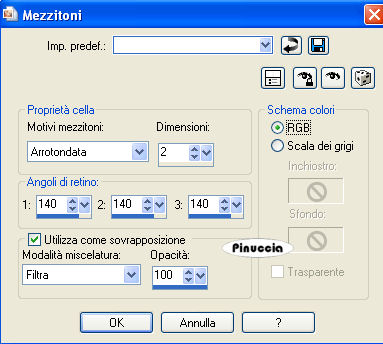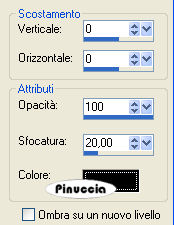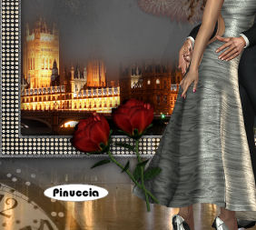 qui puoi trovare qualche risposta ai tuoi dubbi. Se l'argomento che ti interessa non è presente, ti prego di segnalarmelo. Questo tutorial è stato scritto con PSP X2, ma può essere eseguito anche con le altre versioni di PSP. Per tradurlo, ho usato PSP X. Il copyright del tutorial, come quello dei posers, appartiene all'autrice. Il copyright della traduzione è mio. Il copyright dei tubes appartiene ai rispettivi autori. Rispetta il lavoro degli autori. Occorrente: Un tube a scelta. Il tube di uno scenario. Il resto del materiale qui Il tube che ho usato è di Laguna Azul. ![]() 1. Apri l'immagine di sfondo "la_paper silber". Questa sarà la base del tuo lavoro. Apri il tube "la_feuerwerk" e vai a Modifica>Copia. Torna al tuo lavoro e vai a Modifica>Incolla come nuovo livello. Spostalo in alto a sinistra.![]() Cambia la modalità di miscelatura di questo livello in Luce diffusa, e abbassa l'opacità al 48%. 2. Apri il tube "la_ballsaal" e vai a Modifica>Copia. Torna al tuo lavoro e vai a Modifica>Incolla come nuovo livello. Spostalo in basso a destra.![]() 3. Apri la cornice "la_frame silber" e vai a Modifica>Copia. Torna al tuo lavoro e vai a Modifica>Incolla come nuovo livello. Apri il tuo tube del paesaggio e vai a Modifica>Copia. Torna al tuo lavoro e vai a Modifica>Incolla come nuovo livello. Attiva lo strumento Selezione ,clicca sull'icona Selezione personalizzata ![]() e imposta i seguenti settaggi. ![]() Selezione>inverti. Premi sulla tastiera il tasto CANC. Selezione>Deseleziona. Livelli>Disponi>Sposta giù. 4. Attiva il livello superiore. Effetti>Effetti 3D>sfalsa ombra, con i seguenti settaggi, colore nero. ![]() 5. Apri il tube "new-year1". Immagine>Ridimensiona, al 50%, tutti i livelli non selezionato. Regola>Messa a fuoco>Metti a fuoco. Modifica>Copia. Torna al tuo lavoro e vai a Modifica>Incolla come nuovo livello. Spostalo nell'angolo in basso a sinistra.Cambia la modalità di miscelatura di questo livello in Luminanza (esistente), e abbassa l'opacità al 40%. 6. Apri il tuo tube. Immagine>Ridimensiona, a 600 pixels di altezza. Regola>Messa a fuoco>Metti a fuoco. Modifica>Copia. Torna al tuo lavoro e vai a Modifica>Incolla come nuovo livello. Sposta il tube in basso a destra.7. Apri il tube "la_rose". Immagine>Ridimensiona, al 30%. Modifica>Copia. Torna al tuo lavoro e vai a Modifica>Incolla come nuovo livello. Livelli>Duplica. Immagine>Ruota per gradi - 35 gradi a destra. ![]() Posiziona le due rose come nel mio esempio![]() Livelli>Unisci>Unisci giù. Regola>Messa a fuoco>Metti a fuoco. Sposta le rose nell'angolo in basso a destra.![]() Effetti>Effetti 3D>Sfalsa ombra, con i settaggi precedenti. 8. Apri il tube "la_bow silber trans". Immagine>Ridimensiona, al 30%. Regola>Messa a fuoco>Metti a fuoco. Modifica>Copia. Torna al tuo lavoro e vai a Modifica>Incolla come nuovo livello. Spostalo nell'angolo in basso a sinistra della cornice.![]() 9. Scegli una bottiglia; per il mio esempio ho usato "la_bottle silber". Immagine>Ridimensiona, al 40%. Regola>Messa a fuoco>Metti a fuoco. Modifica>Copia. Torna al tuo lavoro e vai a Modifica>Incolla come nuovo livello. Sposta la bottiglia in basso vicino all'orologio.![]() Effetti>Effetti 3D>Sfalsa ombra, con i settaggi precedenti. 10. Apri uno dei bicchieri. Per il mio esempio ho scelto il bicchiere trasparente "la_glas trans". Immagine>Ridimensiona, al 50%. Regola>Messa a fuoco>Metti a fuoco. Modifica>Copia. Torna al tuo lavoro e vai a Modifica>Incolla come nuovo livello. Livelli>Duplica. Posiziona i due bicchieri a destra e a sinistra della bottiglia.11. Apri "la_ribbon silber". Immagine>Ridimensiona, al 60%. Regola>Messa a fuoco>Metti a fuoco. Modifica>copia. Torna al tuo lavoro e vai a Modifica>Incolla come nuovo livello. Spostalo in alto a sinistra.Effetti>Effetti 3D>Sfalsa ombra, con i settaggi precedenti. Apri "la_ribbon gold". Immagine>Ridimensiona, al 60%. Regola>Messa a fuoco>Metti a fuoco. Modifica>copia. Torna al tuo lavoro e vai a Modifica>Incolla come nuovo livello. Spostalo in alto a sinistra.![]() Effetti>Effetti 3D>Sfalsa ombra, con i settaggi precedenti. 12. Apri uno dei fiori trasparente - il mio "la_flower silber trans" e vai a Modifica>Copia. Torna al tuo lavoro e vai a Modifica>Incolla come nuovo livello. Spostalo nell'angolo in alto a destra, lasciando visibile la pietra centrale.![]() 13. Apri il tube "la_ribbon gold02". Immagine>Ridimensiona, al 60%. Regola>Messa a fuoco>Metti a fuoco. Modifica>Copia. Torna al tuo lavoro e vai a Modifica>Incolla come nuovo livello. Spostalo sull'orologio.![]() Effetti>Effetti 3D>Sfalsa ombra, con i settaggi precedenti. Livelli>Duplica. Immagine>Ruota per gradi - 90 gradi a destra. ![]() Spostalo un po' più in alto a sinistra del fiore.![]() 14. Apri "la_ribbon silber02". Immagine>Ridimensiona, al 60%, Regola>Messa a fuoco>Metti a fuoco. Modifica>Copia. Torna al tuo lavoro e vai a Modifica>Incolla come nuovo livello. Spostalo in basso a sinistra.![]() Effetti>Effetti 3D>Sfalsa ombra, con i settaggi precedenti. 15. Apri "la_disco ball silber". Immagine>Ridimensiona, al 60%, Regola>Messa a fuoco>Metti a fuoco. Modifica>Copia. Torna al tuo lavoro e vai a Modifica>Incolla come nuovo livello. Spostalo in alto a sinistra tra i due nastri.![]() Effetti>Effetti 3D>Sfalsa ombra, con i settaggi precedenti. 16. Scegli uno dei tube con il numero 2010 e vai a Modifica>Copia. Torna al tuo lavoro e vai a Modifica>Incolla come nuovo livello. Effetti>Effetti 3D>Sfalsa ombra, con i settaggi precedenti. Sposta il numero tra i due nastri dorati.![]() Aggiungi il tuo nome e/o il tuo watermark su un nuovo livello. 17. Immagine>Aggiungi bordatura, 5 pixels, simmetriche, con il colore bianco. Seleziona il bordo bianco con la bacchetta magica , sfumatura e tolleranza 0.Apri l'immagine di sfondo "la_paper gold" e vai a Modifica>Copia. Torna al tuo lavoro e vai a Modifica>Incolla nella selezione. Effetti>Effetti artistici>Mezzitoni. ![]() Effetti>Effetti di bordo>Aumenta. Effetti>Effetti 3D>Smusso 