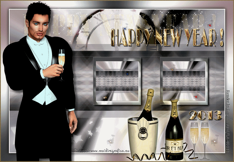 qui puoi trovare qualche risposta ai tuoi dubbi. Se l'argomento che ti interessa non è presente, ti prego di segnalarmelo. Questo tutorial è stato scritto con PSP X2, ma può essere eseguito anche con le altre versioni di PSP. Il copyright del tutorial e del poser appartiene a Laguna Azul. Il copyright della traduzione è mio. Il copyright dei tubes e delle immagini appartiene ai rispettivi artisti. Per favore, rispetta il lavoro degli autori. Occorrente: Un tube a scelta (il poser è stato ritirato dal materiale, perchè non è più libero per la condivisione). Il resto del materiale qui Filtri: AAA Frames - Foto Frame qui Filters Unlimited qui &<Bkg Designer sf10I> - Cruncher (da importare in Unlimited) qui Nik Software - Color Efex Pro qui VM Stylize - Zoom blur qui VM Toolbox - Tile, Seamless Tile qui Mehdi - Wavy Lab qui Alien Skin Xenofex 2.0 - Constellation qui Animation Shop qui ![]() 1. Apri l'immagine di sfondo "LA_BG 2013". Questa sarà la base del tuo lavoro. Apri il tube "LA_2013_Man". Immagine>Ridimensiona, a 700 pixels di altezza. Modifica>Copia, e minimizza il tube che ti servirà ancora. Torna al tuo lavoro e vai a Modifica>Incolla come nuovo livello. Sposta il tube a sinistra, come nell'esempio.![]() nota, la posizione del tube potrebbe essere differente dalla mia; per questo motivo, il risultato finale potrà essere lievemente differente dal mio esempio 2. Regola>Sfocatura>Sfocatura radiale. ![]() Livelli>Duplica. Immagine>Rifletti. Immagine>Capovolgi. Livelli>Unisci>Unisci visibile. 3. Effetti>Plugins>Filter Unlimited 2.0 - VM Stylize - Zoom blur. ![]() 4. Effetti>Plugins>Color Efex 3.0 Complete - Contrast Only. ![]() se stai usando altri colori, puoi cambiare le impostazioni in base a questi. Il risultato non dovrebbe essere troppo forte. 5. Immagine>Aggiungi bordatura, 3 pixels, simmetriche, con il colore bianco. Livelli>Duplica. Immagine>Ridimensiona, all'80%, tutti i livelli non selezionato. ![]() 6. Ancora Livelli>Duplica. Immagine>Ridimensiona, all'80%, tutti i livelli non selezionato. Di nuovo Livelli>Duplica. Immagine>Ridimensiona, all'80%, tutti i livelli non selezionato. Ora dovresti avere 4 livelli, come nell'esempio. ![]() 7. Chiudi il livello inferiore, rimanendo posizionato sul livello superiore. Livelli>Unisci>Unisci visibile. Riapri il livello inferiore e rimani posizionato sul livello Uniti. 8. Effetti>Plugins>Filters Unlimited 2.0 - VM Toolbox - Tiler. ![]() Effetti>Plugins>Filters Unlimimited 2.0 - VM Toolbox - Seamless Tile. ![]() Effetti>Plugins>Filters Unlimited 2.0 - &<Bkg Designer sf10I> - Cruncher. ![]() Immagine>Ruota per gradi - 90 gradi a sinistra. ![]() Immagine>Ridimensiona, 1350 x 250 pixels, tutti i livelli e mantieni proporzioni non selezionati. ![]() Duplica l'immagine usando la combinazione di tasti maiuscola+D. Su questa copia. Livelli>Unisci>Unisci visibile. Effetti>Plugins>AAA Frames - Foto frame. ![]() Immagine>Ridimensiona, 200 x 200 pixels, tutti i livelli selezionato, mantieni proporzioni non selezionato. ![]() Regola>Messa a fuoco>Metti a fuoco. Minimizza questa immagine, e torna al tuo lavoro originale. 11. E' sempre attivo il livello superiore. Apri il tube "LA_CLOCK 2013" e vai a Modifica>Copia. Torna al tuo lavoro e vai a Modifica>Incolla come nuovo livello. Immagine>Ridimensiona, all'80%, tutti i livelli non selezionato, mantieni proporzioni selezionato. ![]() Effetti>Effetti di immagine>Scostamento. ![]() Cambia la modalità di miscelatura di questo livello in Rafforza. Livelli>Disponi>Sposta giù. 12. Attiva il livello superiore. Livelli>Duplica, e attiva il livello sottostante dell'originale. ![]() Effetti>Effetti di distorsione>Onda. ![]() Cambia la modalità di miscelatura di questo livello in Scharisci. 13. Attiva il livello superiore. Attiva l'immagine 200x200 che hai minimizzato al punto 10 e vai a Modifica>Copia. Torna al tuo lavoro e vai a Modifica>Incolla come nuovo livello. Effetti>Effetti 3D>Sfalsa ombra. ![]() Livelli>Duplica. Effetti>Effetti di immagine>Scostamento. ![]() 14. Livelli>Nuovo livello raster. Imposta il colore di primo piano con il colore bianco. Riempi il livello con il colore bianco.Selezione>Seleziona tutto. Selezione>Modifica>Contrai - 3 pixels. Premi sulla tastiera il tasto CANC. Selezione>Deseleziona. 15. Attiva il livello inferiore. Livelli>Innalza livello di sfondo. Immagine>Dimensioni tela - 980 x 680 pixels. ![]() Effetti>Effetti 3D>Sfalsa ombra. ![]() 16. Livelli>Nuovo livello raster. Livelli>Disponi>Sposta giù. Imposta il colore di primo piano con un colore medio, e il colore di sfondo con un colore scuro. I miei colori. ![]() Effetti>Plugins>Mehdi - Wavy Lab. Questo filtro lavora con i colori impostati nella paletta dei materiali. Il primo colore è il colore di sfondo, il secondo quello di primo piano. Imposta il terzo colore con il colore bianco. ![]() 17. Attiva il livello soprastante (il secondo livello dal basso). Apri il tube "LA_STARS" e vai a Modifica>Copia. Torna al tuo lavoro e vai a Modifica>Incolla come nuovo livello. Il tube è coperto dai livelli superiori. Premi il tasto D per attivare lo strumento Deformazione ![]() che evidenzierà il tube e spostalo mnell'angolo in basso a sinistra, come nell'esempio. ![]() Effetti>Effetti 3D>Sfalsa ombra, con il colore bianco. ![]() 18. Attiva il livello superiore. Apri il tube "LA_SEKT 2013". Immagine>Ridimensiona, all'80%. Modifica>Copia. Torna al tuo lavoro e vai a Modifica>Incolla come nuovo livello. Regola>Messa a fuoco>Metti a fuoco. Sposta il tube in basso a destra.![]() Effetti>Effetti 3D>Sfalsa ombra, con i settaggi precedenti. Livelli>Duplica e attiva il livello sottostante dell'originale. Regola>Sfocatura>Sfocatura radiale, con i settaggi precedenti. Cambia la modalità di miscelatura di questo livello in Luce netta. 19. Attiva il livello superiore. Apri il tube "LA_WORDART HNY" e vai a Modifica>Copia. Torna al tuo alvoro e vai a Modifica>Incolla come nuovo livello. Spostalo in alto, come nell'esempio.![]() Apri "L