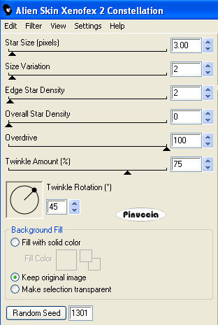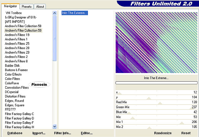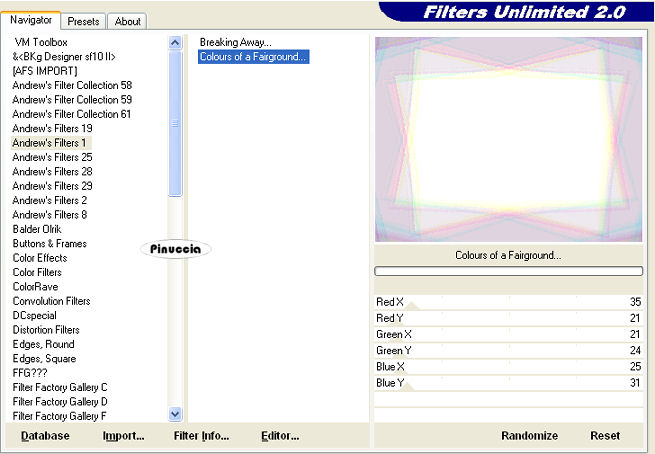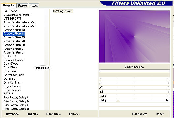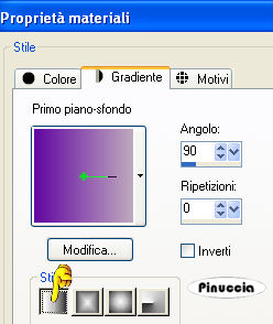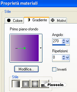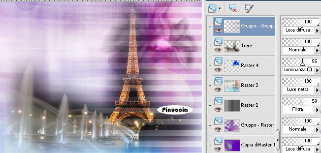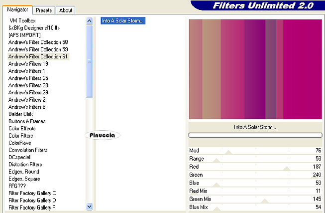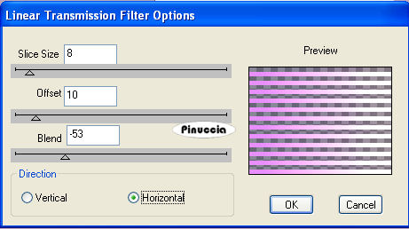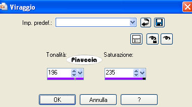 qui puoi trovare qualche risposta ai tuoi dubbi. Se l'argomento che ti interessa non è presente, ti prego di segnalarmelo. Questo tutorial è stato scritto con PSP X2, ma può essere eseguito anche con le altre versioni di PSP. Per tradurlo, ho usato PSP X. Il copyright del tutorial appartiene all'autrice. Il copyright della traduzione è mio. Occorrente: A scelta due tube di donna, uno dei quali dovrebbe essere un misted. Il resto del materiale qui I tubes che ho usato sono di Lut. Gli altri tubes sono di Guismo, Dieter&Marion (©Pixelio.de) e Silke. Filtri: Andrew's Filter 1 qui Andrew's Filter 59 qui Andrew's Filter 61 qui DSB Flux qui Filters Unlimited 2.0 qui Alien Skin Xenofex 2 qui Ti servirà anche Animation Shop qui ![]() Metti la selezione nella cartella Selezioni. 1. Apri una nuova immagine trasparente 800 x 600 pixels. Scegli due colori dai tuoi tubes. Imposta il colore di primo piano con un colore scuro (il mio #6207a2) e il colore di sfondo con un colore chiaro (il mio ##bea8bd). Passa il colore di primo piano a Gradiente di primo piano/sfondo, con i seguenti settaggi: ![]() Riempi l'immagine trasparente con il gradiente.2. Effetti>Plugins>Filters Unlimited 2.0 - Andrew's Filter 1 - Breaking Away. ![]() Livelli>Duplica. 3. Effetti>Plugins>Filters Unlimited 2.0 - Andrew's Filter 59 - Into The Extreme: ![]() Cambia la modalità di miscelatura di questo livello in Luce diffusa. 4. Apri la maschera "maskcameron_indie1" e minimizzala. Torna al tuo lavoro. Livelli>Nuovo livello raster. Riempi il livello con il gradiente.Livelli>Nuovo livello maschera>Da immagine, apri il menu sotto la finestra di origine e vedrai la lista dei files aperti. Seleziona la maschera con i seguenti settaggi: ![]() Livelli>Unisci>Unisci gruppo. Effetti>Effetti 3D>sfalsa ombra: ![]() 5. Livelli>Nuovo livello raster. Cambia i settaggi del gradiente: ![]() Riempi il livello con il gradiente.Effetti>Plugins>Filters Unlimited 2.0 - Andrew's Filter 61 - Into a Solar Storm: ![]() Regola>Tonalità e Saturazione>Viraggio: ![]() Cambia la modalità di miscelatura di questo livello in Filtra, e abbassa l'opacità al 50%. 6. Apri il file di sfondo "hgtexture_10" e vai a Modifica>Copia. non chiuderlo perchè ti servirà ancora Torna al tuo lavoro e vai a Modifica>Incolla come nuovo livello. Cambia la modalità di miscelatura di questo livello in Luce netta. ![]() 7. Apri il tube "mds6854 Background Feuerwerk_Enzian" e vai a Modifica>Copia. Torna al tuo lavoro e vai a Modifica>Incolla come nuovo livello. Spostalo nell'angolo in alto a destra.Cambia la modalità di miscelatura di questo livello in Luminanza (esistente), e abbassa l'opacità al 55% 8. Apri il tube "cal-guis-paris1-8112008" e vai a Modifica>Copia. Torna al tuo lavoro e vai a Modifica>Incolla come nuovo livello. Immagine>Ridimensiona, al 120%, tutti i livelli non selezionato. (se stai usando altri tube, prima di copiarli ridimensiona o ingrandisci da 600 a 600 pixels di altezza). Regola>Messa a fuoco>Metti a fuoco. Rinomina questo livello "Torre". 9. Livelli>Nuovo livello raster. Cambia nuovamente i settaggi del gradiente. ![]() Riempi il livello con il gradiente.Effetti>Plugins>DSB Flux - Linear Transmission, con i seguenti settaggi. ![]() Apri la maschera "mask_fv_02" e minimizzala. Torna al tuo lavoro. Livelli>Nuovo livello maschera>Da immagine. Seleziona la maschera con i seguenti settaggi: ![]() Livelli>Unisci>Unisci gruppo. Ripeti Livelli>Nuovo livello maschera>Da immagine. Seleziona la maschera con gli stessi settaggi. Livelli>Unisci>Unisci gruppo. Cambia la modalità di miscelatura di questo livello in Luce diffusa, ![]() 10. Apri il tube "SKF_Bubbles212.08" e vai a Modifica>Copia. Torna al tuo lavoro e vai a Modifica>Incolla come nuovo livello. Cambia la modalità di miscelatura di questo livello in Luce diffusa. 11. Apri il tube "la_wordart 12" e vai a Modifica>Copia. Torna al tuo lavoro e vai a Modifica>Incolla come nuovo livello. Spostalo come nel mio esempio.![]() 12. Apri il tube misted. Ridimensionalo o ingrandiscilo a 600 pixels di altezza. Regola>Messa a fuoco>Metti a fuoco. Modifica>Copia. Torna al tuo lavoro e vai a Modifica>Incolla come nuovo livello. Spostalo a sinistra, in modo che non copra il testo.Cambia la modalità di miscelatura di questo livello in Sovrapponi. 13. Livelli>Nuovo livello raster Selezione>Carica/Salva selezione>Carica selezione da disco. Cerca e carica la selezione "la_B28 Select1". ![]() Effetti>Effetti 3D>sfalsa ombra: ![]() Mantieni selezionato. Attiva nuovamente il file di sfondo "hgtexture_10" e vai a Modifica>Copia. Torna al tuo lavoro e vai a Modifica>Incolla nella selezione. Selezione>Inverti. Premi sulla tastiera il tasto CANC. Selezione>Deseleziona. Prendi nota dei valori di Tonalità (H) e Saturazione (S) del colore di primo piano. ![]() Regola>Tonalità e saturazione>Viraggio e trascrivi i valori annotati nelle rispettive caselle: ![]() Cambia la modalità di miscelatura di questo livello in Moltiplica. 14. Apri il secondo tube. Ridimensionalo a 570 pixels di altezza. Regola>Messa a fuoco>Metti a fuoco. Modifica>Copia. Torna al tuo lavoro e vai a Modifica>Incolla come nuovo livello. Spostalo a destra.Effetti>Effetti 3D>Sfalsa ombra: ![]() 15. Apri una nuova immagine trasparente 800 x 600 pixels. Immagine>Aggiungi bordatura, 1 pixel, simmetriche, con il colore nero. Immagine>Aggiungi bordatura, 15 pixels, simmetriche, con il colore di sfondo. Seleziona questo bordo con la bacchetta magica , tolleranza e sfumatura 0.Effetti>Effetti artistici>Mezzitoni: ![]() Mantieni selezionato. Effetti>Effetti 3D>Smusso a incasso. ![]() Selezione>Deseleziona. 15. Immagine>Aggiungi bordatura, 1 pixel, simmetriche, con il colore nero. Immagine>Aggiungi bordatura, 20 pixels, simmetriche, con il colore di sfondo. Seleziona questo bordo con la bacchetta magica , tolleranza e sfumatura 0.Effetti>Plugins>Filters Unlimited 2.0 - Andrew's Filters 1 - Colours of a Fairground: ![]() Regola>Tonalità e Saturazione>Viraggio, con