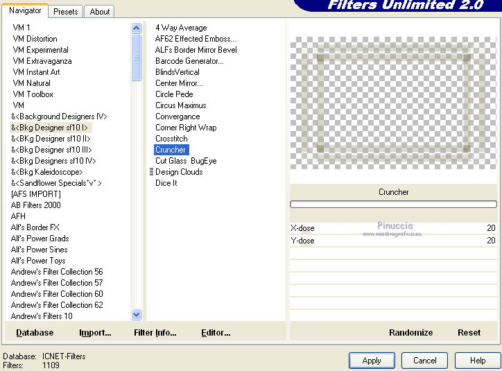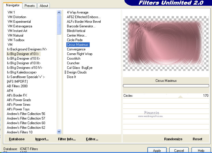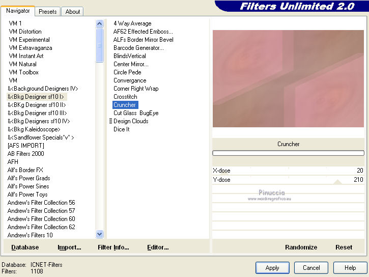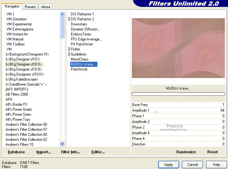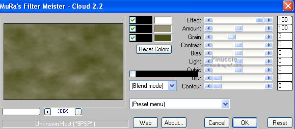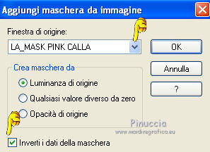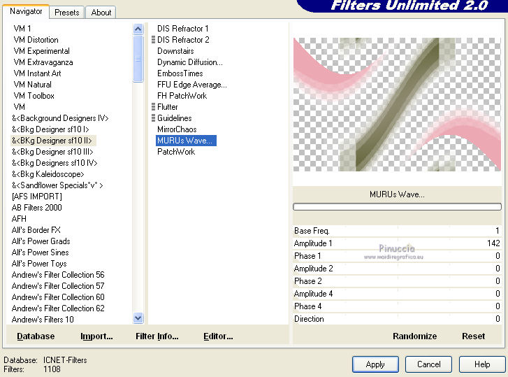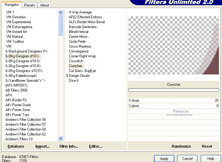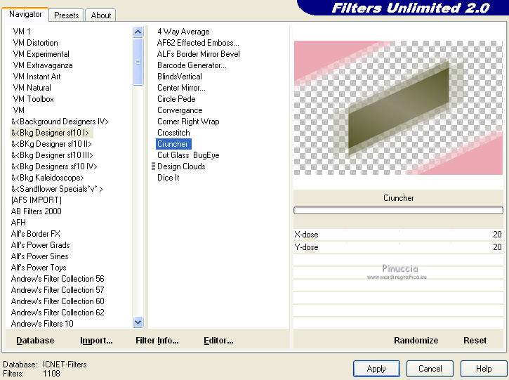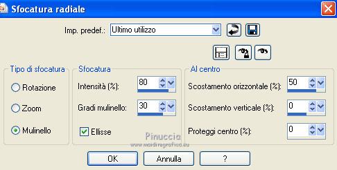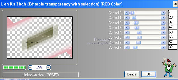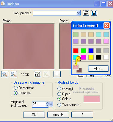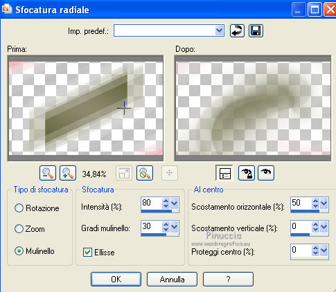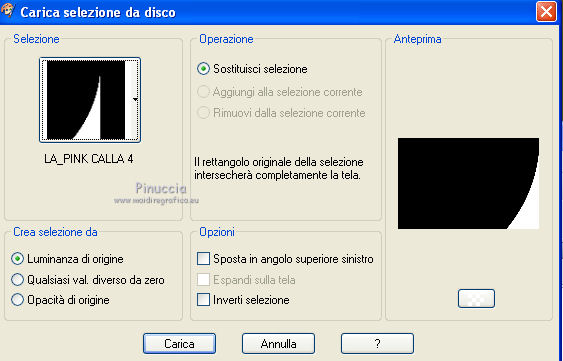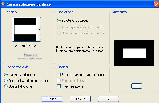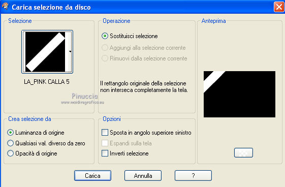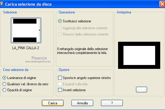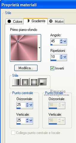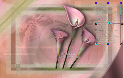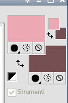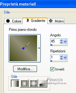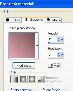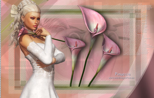 qui puoi trovare qualche risposta ai tuoi dubbi. Se l'argomento che ti interessa non è presente, ti prego di segnalarmelo. Questo tutorial è stato scritto con PSP X2, ma può essere eseguito anche con le altre versioni di PSP. Dalla versione X4, il comando Immagine>Rifletti è stato sostituito con Immagine>Capovolgi in orizzontale, e il comando Immagine>Capovolgi con Immagine>Capovolgi in verticale. Nelle versioni X5 e X6, le funzioni sono state migliorate rendendo disponibile il menu Oggetti. Vedi la scheda sull'argomento qui Per tradurre questo tutorial ho usato PSP X. Il copyright del tutorial e del poser appartiene a Laguna Azul. Il copyright della traduzione è mio. Il copyright dei tubes e delle immagini appartiene ai rispettivi artisti. Per favore, rispetta il lavoro degli autori. Occorrente: Un tube a scelta (il tube usato è stato tolto dal materiale perchè non è più libero per la condivisione). Il resto del materiale qui Filtri: AP [Lines] - Lines SilverLining qui Filters Unlimited 2.0 qui &<Bkg Designer sf10I> (da importare in Unlimited) qui &<Bkg Designer sf10II> (da importare in Unlimited) qui FM Tile Tools - Blend Emboss qui Graphics Plus - Cross shadow, Spot lite qui L&K - L&K Zitah qui Mura's Meister - Cloud qui Simple - 4Way Average qui Toadies - What are you qui I filtri Graphics Plus, Simple e Toadies si possono usare da soli o importati in Filters Unlimited (come fare vedi qui) A volte si possono riscontrare delle differenze nei risultati, ma queste differenze si possono rilevare soltanto "sul campo". Se un filtro fornito appare con questa icona ![]() Metti le selezioni nella cartella Selezioni. 1. Scegli due colori dal tube della donna, e tre colori dal tube dei fiori. Un piccolo espediente è quello di aprire una nuova immagine trasparente, con i settaggi che ti sono più convenienti (potrai poi ritagliare lo spazio eccedente), e riempire cinque livelli con i colori scelti. Nel corso del tuo lavoro, ti basterà attivare lo strumento Contagocce ![]() e cliccare sulla paletta con il tasto sinistro del mouse per impostare il colore di primo piano, e con il tasto destro per impostare il colore di sfondo. Questa la mia paletta. ![]() 2. Per cominciare usa i due colori scelti dal tube della donna. Colore di primo piano #eda9b3, colore di sfondo #764f53. ![]() Passa il colore di primo piano a Gradiente di primo piano/sfondo, stile Lineare, con i seguenti settaggi. ![]() Apri una nuova immagine trasparente 850 x 550 pixels, e riempila con il gradiente.3. Apri il tube della donna e vai a Modifica>Copia. Torna al tuo lavoro e vai a Modifica>Incolla come nuovo livello. Immagine>Ridimensiona, se e quanto necessario, tutti i livelli non selezionato. Sposta il tube a sinistra.![]() Livelli>Duplica. Immagine>Rifletti. Livelli>Unisci>Unisci visibile. Regola>Sfocatura>Sfocatura radiale. ![]() Effetti>Plugins>Simple - 4Way Average. 4. Livelli>Duplica. Effetti>Effetti geometrici>Inclina, con il colore di primo piano. Clicca sulla paletta del colore con il tasto destro del mouse e avrai la tabellina dei colori recenti. In basso a sinistra trovi i colori impostati nella tua paletta dei materiali. Clicca sul colore corrispondente per impostarlo ![]() Effetti>Plugins>Filters Unlimited 2.0 - &<Bkg Designer sf10I> - Cruncher. ![]() Effetti>Plugins>Filters Unlimited 2.0 - &<Bkg Designer sf10II> - MURUs Wave. ![]() Effetti>Plugins>FM Tile Tools - Blend Emboss, con i settaggi standard. ![]() Cambia la modalità di miscelatura di questo livello in Luce netta. 6. Imposta i colori scelti dal tube dei fiori. Colore di primo piano #939077 Colore di sfondo #484c17. ![]() Passa il colore di primo piano a Gradiente, stile Lineare, con i seguenti settaggi. ![]() Livelli>Nuovo livello raster. Selezione>Carica/Salva selezione>Carica selezione da disco. Cerca e carica la selezione "LA_PINK CALLA 1". ![]() Riempi con il gradiente.Selezione>Deseleziona. 7. Effetti>Effetti geometrici>Inclina, con i settaggi precedenti. Effetti>Plugins>Filters Unlimited 2.0 - &<Bkg Designer sf10I> - Cruncher. ![]() Ripeti l'Effetto una seconda volta. 8. Attiva lo strumento Bacchetta magica ![]() ![]() Clicca negli angoli in alto a sinistra e in basso a destra per selezionarli. ![]() Effetti>Plugins>Filters Unlimited 2.0 - &<Bkg Designer sf10II> - MURUs Wave. ![]() 9. Mantieni selezionato. Effetti>Plugins>L&L landksiteofwonders - L & K Zitah ![]() Selezione>Deseleziona. 10. Selezione>Carica/Salva selezione>Carica selezione da disco. Cerca e carica la selezione "LA_PINK CALLA 2". ![]() Regola>Sfocatura>Sfocatura radiale. ![]() 11. Mantieni selezionato. Imposta nuovamente i colori scelti dal tube della donna. primo piano #eda9b3, sfondo #764f53. ![]() Passa il colore di primo piano a Gradiente, stile Radiale, con i seguenti settaggi. ![]() Selezione>Modifica>Sfuma - 40 pixels. Livelli>Nuovo livello raster. Riempi la selezione con il gradiente.Effetti>Plugins>Filters Unlimited 2.0 - &<Bkg Designer sf10I> - Circus Maximus. ![]() Effetti>Plugins>FM Tile Tools - Blend Emboss, con i settaggi standard. Abbassa l'opacità di questo livello al 50%. 12. Mantieni selezionato. Apri il misted dei fiori "LA_PINK CALLA misted". Immagine>Ridimensiona, a 450 pixels di altezza. Regola>Messa a fuoco>Metti a fuoco. Modifica>Copia. Torna al tuo lavoro e vai a Modifica>Incolla come nuovo livello. Selezione>Inverti. Premi due o tre volte sulla tastiera il tasto CANC. Selezione>Deseleziona. Effetti>Effetti di bordo>Aumenta di più. Cambia la modalità di miscelatura di questo livello in Scurisci, e abbassa l'opacità al 35%. 13. Imposta nuovamente i colori dei fiori primo piano #939077 sfondo #484c17. ![]() Livelli>Nuovo livello raster. Selezione>Carica/Salva selezione>Carica selezione da disco. Cerca e carica la selezione "LA_PINK CALLA 3". ![]() Riempi la selezione con il colore di primo piano.Effetti>Plugins>Mura's Meister - Cloud, con i settaggi standard. ![]() Selezione>Deseleziona. Livelli>Duplica. 14. Effetti>Plugins>Filters Unlimited 2.0 