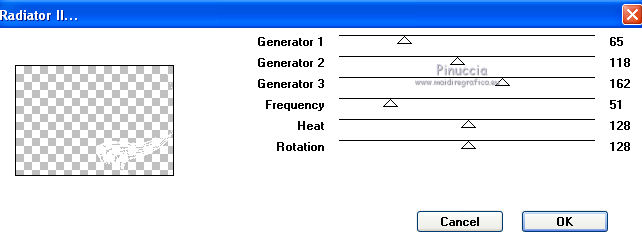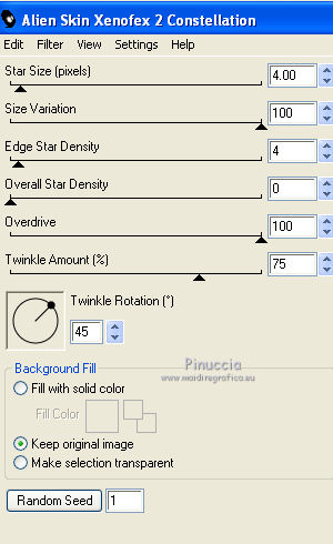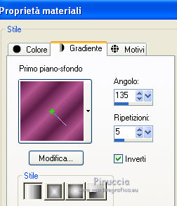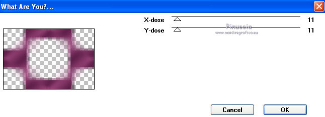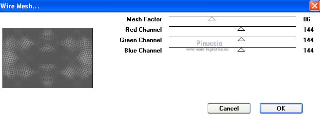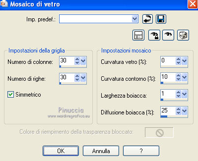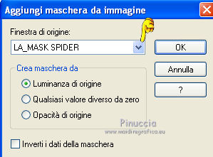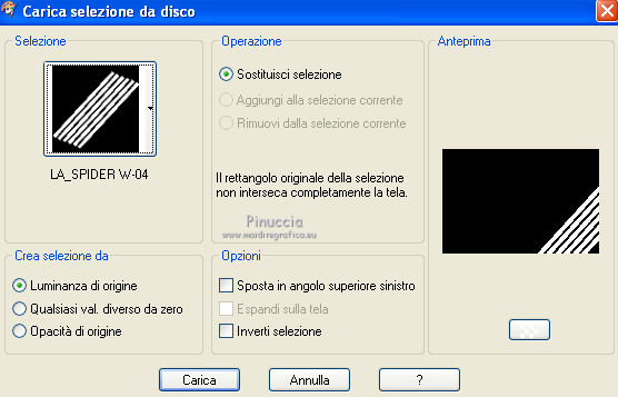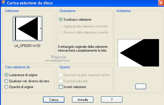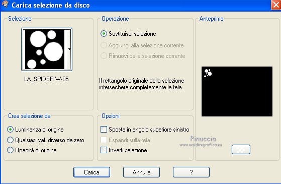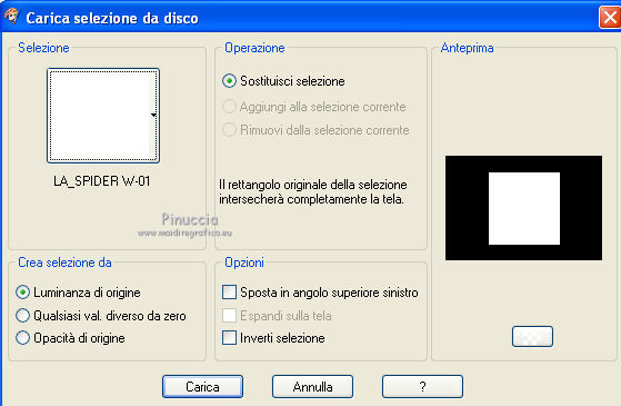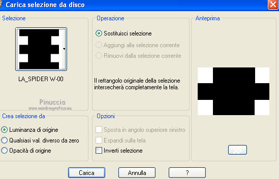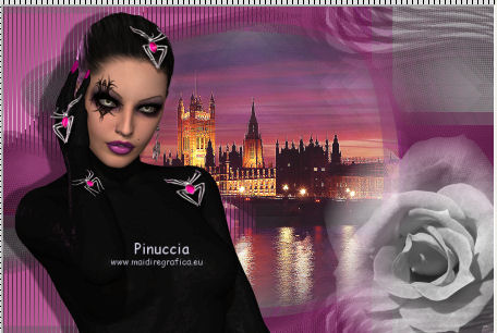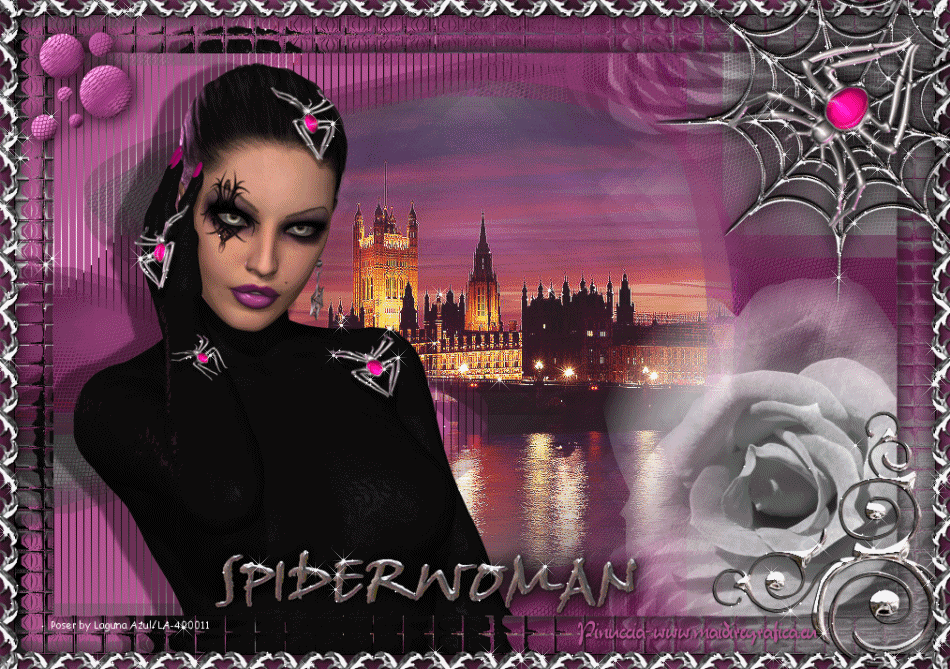 qui puoi trovare qualche risposta ai tuoi dubbi. Se l'argomento che ti interessa non è presente, ti prego di segnalarmelo. Questo tutorial è stato scritto con PSP X2, ma può essere eseguito anche con le altre versioni di PSP. Il copyright del tutorial, del materiale scrap e dei poser appartiene a Laguna Azul. Il copyright della traduzione è mio. Il copyright dei tubes e delle immagini appartiene ai rispettivi artisti. Per favore, rispetta il lavoro degli autori. Occorrente: A scelta un'immagine di sfondo (600-800 pixels circa di altezza). Un tube a scelta (il tube usato è stato tolto dal materiale perchè non è più libero per la condivisione). Il resto del materiale qui Il tube del paesaggio è di Luna. Filtri: Tramages - Tow the line, Wire Mesh qui Toadies - What are you qui VM Distortion - Radiator II qui Alien Skin Xenofex 2.0 - Constellation qui Animation Shop qui ![]() Metti le selezioni nella cartella Selezioni. Apri la maschera in PSP e minimizzala con il resto del materiale. 1. Imposta il colore di primo piano con il colore chiaro #b55591, e il colore di sfondo con il colore scuro #5c7e47. ![]() 2. Apri lo sfondo "LA_SPIDERWOMAN_HG". Questa sarà la base del tuo lavoro. Selezione>Carica/Salva selezione>Carica selezione da disco. Cerca e carica la selezione "LA_SPIDER W-00". ![]() Efffetti>Plugins>Tramages - Wire Mesh, con i settaggi standard. ![]() Selezione>Deseleziona. Livelli>Nuovo livello raster. Riempi con il colore chiaro di primo piano.Livelli>Nuovo livello maschera>Da immagine. Apri il menu sotto la finestra di origine e vedrai la lista dei files aperti. Seleziona la maschera LA_MASK SPIDER. ![]() Livelli>Unisci>Unisci gruppo. Effetti>Effetti di bordo>Aumenta di più. Effetti>Effetti 3D>Sfalsa ombra. ![]() 3. Passa il colore di primo piano a Gradiente. ![]() Livelli>Nuovo livello raster. Riempi con il gradiente.4. Selezione>Carica/Salva selezione>Carica selezione da disco. Cerca e carica la selezione LA_SPIDER W_01. ![]() Premi sulla tastiera il tasto CANC. Selezione>Deseleziona. 5. Effetti>Effetti di immagine>Motivo unico, con i settaggi standard. ![]() 6. Effetti>Plugins>Toadies - What are you. ![]() 7. Effetti>Plugins>Tramages - Wire Mesh, con i settaggi precedenti. 8. Effetti>Effetti geometrici>Sfera. ![]() 9. Apri il tube del paesaggio o della città. Se necessario ridimensiona (Immagine>Ridimensiona) a 600-800 pixels di altezza. Modifica>Copia. Torna al tuo lavoro e vai a Modifica>Incolla come nuovo livello. Regola>Messa a fuoco>Metti a fuoco. 10. Selezione>Carica/Salva selezione>Carica selezione da disco. Cerca e carica la selezione LA_SPIDER_02. ![]() Premi sulla tastiera il tasto CANC. Selezione>Deseleziona. Livelli>Disponi>Sposta giù. Cambia la modalità di miscelatura di questo livello in Filtra. Livelli>Duplica. Cambia la modalità di miscelatura di questo livello in Sovrapponi, e abbassa l'opacità al 60% (settaggi che puoi regolare in base al tuo tube). 11. Attiva il livello superiore. Livelli>Nuovo livello raster. Selezione>Carica/Salva selezione>Carica selezione da disco. Cerca e carica la selezione LA_SPIDER W-03. ![]() Riempi la selezione con il colore di primo piano.Selezione>Deseleziona. Effetti>Effetti di distorsione>Onda. ![]() Effetti>Plugins>Toadies - What are you, con i settaggi precedenti. Effetti>Plugins>Tramages - Tow the line. ![]() 12. Livelli>Nuovo livello raster. Selezione>Carica/Salva selezione>Carica selezione da disco. Cerca e carica la selezione LA_OMEG_04. ![]() Imposta il colore di sfondo con il colore bianco. Riempi la selezione con il colore bianco.Selezione>Deseleziona. Effetti>Plugins>VM Distortion - Radiator II, con i settaggi standard. ![]() Effetti>Plugins>Toadies - What are you, con i settaggi precedenti. Livelli>Duplica. Immagine>Capovolgi. Livelli>Unisci>Unisci giù. Cambia la modalità di miscelatura di questo livello in Luce diffusa. 13. Apri il tube LA_MISTED WHITE ROSE" e vai a Modifica>Copia. Torna al tuo lavoro e vai a Modifica>Incolla come nuovo livello. Spostalo nell'angolo in basso a destra.![]() Livelli>Duplica. Cambia la modalità di miscelatura di questo livello in Filtra, e abbassa l'opacità al 40%. 14. Apri il tuo tube. Se necessario ridimensiona (Immagine>Ridimensiona) a 580-600 pixels di altezza. Modifica>Copia. Torna al tuo lavoro e vai a Modifica>Incolla come nuovo livello. Regola>Messa a fuoco>Metti a fuoco. Spostalo a sinistra.![]() Effetti>Effetti 3D>Sfalsa ombra. ![]() 15. Controlla che tutto sia a posto. Livelli>Unisci>Unisci visibile. Modifica>Copia. Immagine>Aggiungi bordatura, 1 pixel, simmetriche, con il colore nero. Immagine>Aggiungi bordatura, 40 pixels, simmetriche, con il colore bianco. 16. Selezione>Seleziona tutto. Livelli>Nuovo livello raster. Modifica>Incolla nella selezione. Effetti>Effetti di trama>Mosaico di vetro. ![]() Selezione>Modifica>Contrai - 50 pixels. Selezione>Modifica>Sfuma - 20 pixels. Premi sulla tastiera il tasto CANC. Selezione>Deseleziona. 17. Livelli>Nuovo livello raster. Selezione>Seleziona tutto. SElezione>Modifica>Contrai - 40 pixels. Effetti>Effetti 3D>Sfalsa ombra. ![]() Selezione>Deseleziona. 18. Immagine>Aggiungi bordatura, 1 pixel, simmetriche, con il colore nero. Immagine>Aggiungi bordatura, 15 pixels, simmetriche, con il colore di primo piano. Seleziona questo bordo con la bacchetta magica , sfumatura e tolleranza 0.Riporta il colore di sfondo al colore iniziale e riavrai il tuo gradiente. ![]() Riempi la selezione con il gradiente.Selezione>Inverti. Effetti>Effetti 3D>Sfalsa ombra, con i settaggi precedenti. Selezione>Deseleziona. 19. Apri il tube "LA_METAL DECO" e vai a Modifica>Copia. Torna al tuo lavoro e vai a Modifica>Incolla come nuovo livello. Sposta nell'angolo in basso a destra.![]() Apri la cornice "LA_METAL FRAME" e vai a Modifica>Copia. Torna al tuo lavoro e vai a Modifica>Incolla come nuovo livello. 20. Copia e incolla sul tuo lavoro il rimanente materiale metallico. Posizionalo nell'angolo in alto a destra.Effetti>Effetti 3D>Sfalsa ombra