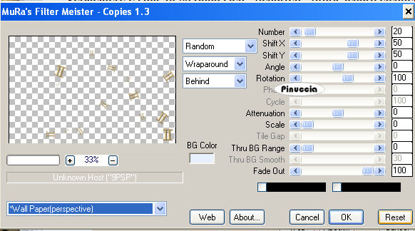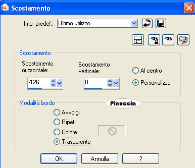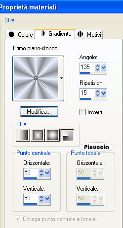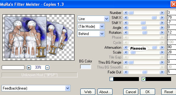 qui puoi trovare qualche risposta ai tuoi dubbi. Se l'argomento che ti interessa non è presente, ti prego di segnalarmelo. Questo tutorial è stato scritto con PSP X2, ma può essere eseguito anche con le altre versioni di PSP. Il copyright del tutorial, come quello dei poser, appartiene a Laguna Azul. Il copyright della traduzione è mio. Il copyright dei tubes e delle immagini appartiene ai rispettivi artisti. Per favore, rispetta il lavoro degli autori. Occorrente: Un tube a scelta. Il resto del materiale qui Per il mio esempio ho usato un poser di Laguna Azul. Per identificare i vostri segni zodiacali, ecco la traduzione dei files forniti con il materiale: Widder, Ariete Stier, Toro Zwillinge, Gemelli Krebs, Cancro Lowe, Leone Jungfrau, Vergine Waage, Bilancia Skorpion, Scorpione Schutze, Sagittario Steinbock, Capricorno Wassermann, Acquario Fische, Pesci Filtri: Mura's Meister qui Screenworks qui VM Extravaganza qui ![]() Questo tutorial è una nuova versione del tutorial pubblicato il 25 marzo 2008. 1. Apri una nuova immagine trasparente 410 x 410 pixels. Scegli due colori e imposta il colore chiaro come colore di primo piano (il mio #e8f1ff), e il colore scuro come colore di sfondo (il mio #878990). Riempi l'immagine trasparente con il colore di primo piano.2. Apri il file di sfondo "cellestiaBack12" e vai a Modifica>Copia. Torna al tuo lavoro e vai a Modifica>Incolla come nuovo livello. Cambia la modalità di miscelatura di questo livello in Luminanza (esistente). 3. Apri il file di sfondo "BG06" e vai a Modifica>Copia. Torna al tuo lavoro e vai a Modifica>Incolla come nuovo livello. Cambia la modalità di miscelatura di questo livello in Filtra. Effetti>Effetti di bordo>Aumenta. 4. Livelli>Nuovo livello raster. Passa il colore di primo piano a Gradiente. ![]() Apri il pennello "@cb-swirl2". File>Esporta>Pennello personalizzato, assegna un nome al pennello e ok. Attiva lo strumento Pennello ,cerca e seleziona il pennello che hai appena esportato, impostando l'opacità all'80%. e applica il pennello a destra cliccando con il tasto sinistro del mouse per usare il gradiente. Cambia la modalità di miscelatura di questo livello in Moltiplica. Livelli>Duplica. Immagine>Rifletti. Immagine>Capovolgi. 5. Apri il tube la_universum oppure la_universum blue (il mio esempio ho scelto la variante blu) e vai a Modifica>Copia. Torna al tuo lavoro e vai a Modifica>Incolla come nuovo livello. Sposta il tube nell'angolo in alto a destra.![]() 6. Apri il tuo tube o uno dei Poser dello zodiaco. Immagine>Ridimensiona, a circa 450 pixels di altezza. Regola>Messa a fuoco>Metti a fuoco. Modifica>Copia. Torna al tuo lavoro e vai a Modifica>Incolla come nuovo livello. Effetti>Effetti 3D>Sfalsa ombra, con il colore nero. ![]() 7. Apri il file del testo relativo al segno zodiacale che hai scelto - per questo esempio - la_03_edel - e vai a Modifica>Copia. Torna al tuo lavoro e vai a Modifica>Incolla come nuovo livello. Immagine>Ridimensiona, al 70%, tutti i livelli non selezionato. Regola>Messa a fuoco>Metti a fuoco. Spostalo nell'angolo in basso a sinistra o a destra (dipende dall'immagine che stai usando).Effetti>Effetti 3D>sfalsa ombra, con il colore nero. ![]() 8. Livelli>Nuovo livello raster. Apri il pennello "Brushed Swirl 7". File>Esporta>Pennello personalizzato, assegna un nome al pennello e ok. Attiva lo strumento Pennello ![]() cerca e seleziona il pennello e applicalo cliccando con il tasto destro del mouse per usare il colore di sfondo. Immagine>Rifletti. Sposta il pennello nell'angolo in alto a sinistra.Cambia la modalità di miscelatura di questo livello in Moltiplica, e abbassa l'opacità al 75%. 9. Immagine>Aggiungi bordatura, 2 pixels, simmetriche, con il colore nero. Minimizza l'immagine che userai dopo. 10. Apri una nuova immagine trasparente 700 x 450 pixels, e riempila con il colore di primo piano.Effetti>Plugins>VM Extravaganza - Ray Transmission. ![]() 11. Livelli>Nuovo livello raster. Selezione>Seleziona tutto. Apri nuovamente l'immagine di sfondo "CellestiaBack12" e vai a Modifica>Copia. Torna al tuo lavoro e vai a Modifica>Incolla nella selezione. Selezione>Deseleziona. Cambia la modalità di miscelatura di questo livello in Luminanza (esistente), e abbassa l'opacità al 50%. Effetti>Effetti di bordo>Aumenta. 12. Livelli>Nuovo livello raster. Attiva nuovamente lo strumento Pennello ![]() cerca e seleziona il pennello "@cb-swirl2" e applicalo con il gradiente nell'angolo in alto a sinistra. 13. Apri il tube la_universum nella variante scelta e vai a Modifica>Copia. Torna al tuo lavoro e vai a Modifica>Incolla come nuovo livello. Lascia il tube al centro. Effetti>Effetti di immagine>Motivo unico. ![]() Abbassa l'opacità di questo livello al 50%. Effetti>Effetti di bordo>Aumenta. 14. Attiva la piccola immagine che hai minimizzato prima e vai a Modifica>Copia. Torna al tuo lavoro e vai a Modifica>Incolla come nuovo livello. Effetti>Effetti di immagine>Scostamento. ![]() 15. Effetti>Plugins>Mura's Meister - Copies: ![]() Effetti>Effetti 3D>Sfalsa ombra, con il colore nero. ![]() 16. Apri il secondo file di testo relativo al segno zodiacale che hai scelto - nel caso dei gemelli "la_3 edel" e vai a Modifica>Copia. Torna al tuo lavoro e vai a Modifica>Incolla come nuovo livello. Immagine>Ridimensiona, al 40%, tutti i livelli non selezionato. Regola>Messa a fuoco>Accentua messa a fuoco. Spostalo nell'angolo in basso a destra.Effetti>Plugins>Mura's Meister - Copies. ![]() Il risultato dell'effetto è "random", ossia casuale, per questo non sarà uguale al mio esempio. Se da questo risultato rimangono tracce sui visi del tube, attiva lo strumento Gomma ed eliminale.17. Apri il tube della placchetta rotonda relativo al segno scelto - nel caso dei gemelli "la_03 zwillinge big" e vai a Modifica>copia. Torna al tuo lavoro e vai a Modifica>Incolla come nuovo livello. Immagine>Ridimensiona, al 60%, tutti i livelli non selezionato. Regola>Messa a fuoco>Metti a fuoco. Spostalo in basso a destra, com