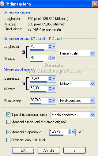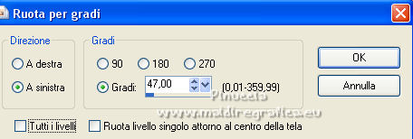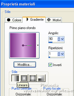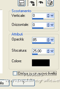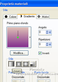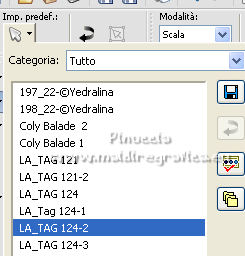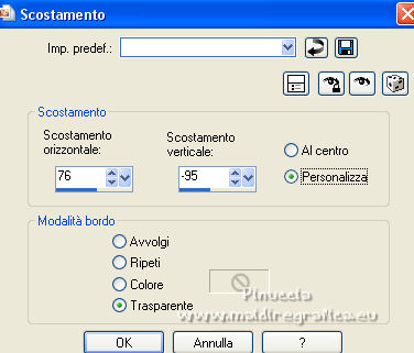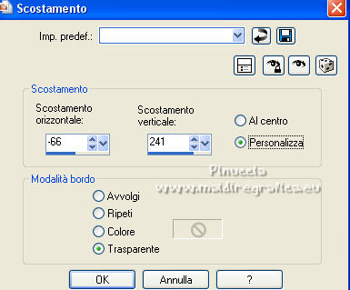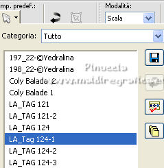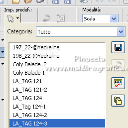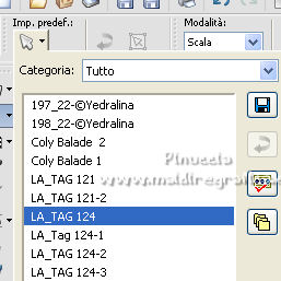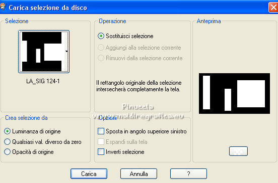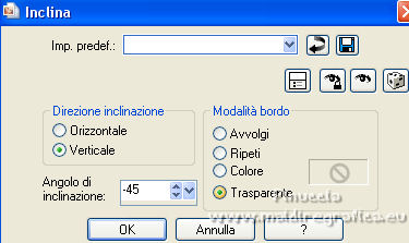 qui puoi trovare qualche risposta ai tuoi dubbi. Se l'argomento che ti interessa non è presente, ti prego di segnalarmelo. Il copyright del tutorial appartiene a Laguna Azul. Questo tutorial è stato creato con PspX9 e tradotto con CorelX e CorelX2, ma può essere realizzato anche con le altre versioni di PSP. Dalla versione X4, il comando Immagine>Rifletti è stato sostituito con Immagine>Capovolgi in orizzontale, e il comando Immagine>Capovolgi con Immagine>Capovolgi in verticale. Nelle versioni X5 e X6, le funzioni sono state migliorate rendendo disponibile il menu Oggetti. Con la nuova versione X7, sono tornati Rifletti>Capovolgi, ma con nuove varianti. Vedi la scheda sull'argomento qui Traduzione francese/traduction en français qui Le vostre versioni quiOccorrente: Un tube a scelta (il tube usato nel tutorial originale è un tube soggetto a licenza) e 3 piccole immagini, paesaggi, fiori o simili (le dimensioni non devono essere inferiori a 180 x 270 pixel). Il resto del materiale qui Per il tube usato nella mia versione e per le maschere grazie Gabry, Narah e Adita. Il resto del materiale è di Laguna Azul (in questa pagina trovi i links ai siti dei creatori di tubes) Filtri: in caso di dubbi, ricorda di consultare la mia sezione filtri qui Filters Unlimited 2.0 - versione software qui Filters Unlimited 2.0 - versione in files formato 8bf qui &<Bkg Designer sf10III> - Whirl (da importare in Unlimited) qui Carolaine and Sensibility - CS-LDots qui Alien Skin Eye Candy 5 Impact - Glass, Perspective Shadow qui DSB Flux - Linear Transmission qui Filter Factory Gallery D - Mirror IT qui It@lian Editors Effect - Effetto Fantasma qui Mehdi - Sorting Tiles qui Mura's Meister - Perspective Tiling qui Simple - Centre Tile qui VM Toolbox - Seamless Tiles qui °v° Kiwi Oelfilter - Videowand qui I filtri Italian Editors, Factory Gallery, Simple, Kiwi e VM Toolbox si possono usare da soli o importati in Filters Unlimited (come fare vedi qui) Se un filtro fornito appare con questa icona ![]() non esitare a cambiare modalità di miscelatura e opacità secondo i colori utilizzati. Nelle ultime versioni di PSP non c'è il gradiente di primo piano/sfondo (Corel_06_029) Puoi usare i gradienti delle versioni precedenti. Trovi qui i gradienti Corel X. Metti i preset Cliccando sul file una o due volte (a seconda delle tue impostazioni), automaticamente il preset si installerà nella cartella corretta. perchè uno o due clic vedi qui ![]() Metti i preset (cartella Voreinstellungen) nella cartella Impostazioni predefinite. Metti le selezioni (cartella Auswahl) nella cartella Selezioni. Apri le maschere (Masken) in PSP e minimizzale con il resto del materiale. 1. Per il tutorial hai bisogno di 5 colori. Se vuoi preparare la tua paletta dei colori, apri una nuova immagine trasparente 250 x 50 pixels Duplica il livello 4 volte per avere 5 livelli. Riempi il primo livello con il colore bianco; questo sarà il tuo colore 1. Ora scegli dal tube un colore chiaro e un colore scuro. Riempi il secondo livello con il colore chiaro, e questo sarà il tuo colore 2 ,e il terzo livello con il colore scuro, che sarà il colore 3 .Scegli poi dalla carnagione del tube un colore chiaro e un colore scuro. Riempi il quarto livello con il colore chiaro, e il quinto livello con il colore scuro, e questi saranno i colori 4 e 5 .Sposta i livelli in modo da avere in ordine e ben visibili i 5 colori. ![]() 2. Imposta il colore di primo piano con il colore 4 e il colore di sfondo con il colore 5. ![]() Passa il colore di sfondo a Gradiente di primo piano/sfondo, stile Lineare. ![]() Apri una nuova immagine trasparente 950 x 550 pixels. Riempi l'immagine trasparente con il gradiente di sfondo.Effetti>Plugins>Filters Unlimited 2.0 - &<Bkg Designer sf10III> - Whirl, con i settaggi standard. ![]() Livelli>Duplica - 2 volte. 3. Immagine>Rifletti. Cambia la modalità di miscelatura di questo livello in Luce diffusa. Livelli>Unisci>Unisci giù. Effetti>Plugins>Mehdi - Sorting Tiles. ![]() Selezione>Carica/Salva selezione>Carica selezione da disco. Cerca e carica la selezione LA_SIG 124-1. ![]() Selezione>Inverti. Premi sulla tastiera il tasto CANC ![]() ![]() Selezione>Deseleziona. Effetti>Plugins>Filters Unlimited 2.0 - Filter Factory Gallery D - Mirror It. ![]() attenzione, questa è la schermata del filtro importato nella versione di Unlimited che non si installa, perchè composta da files in formato 8bf. Se stai usando la versione software di Unlimited, avrai questo ![]() In questo caso, tuttavia, se non vuoi sostituire la versione nei Percorsi Files, puoi ottenere il risultato del filtro se imposti il colore di sfondo con il colore bianco, prima di applicare il filtro. 4. Effetti>Plugins>DSB Flux - Linear Transmission. ![]() Effetti>Effetti geometrici>Inclina. ![]() Effetti>Effetti 3D>Sfalsa ombra, colore di sfondo (colore 5). ![]() Cambia la modalità di miscelatura di questo livello in Luce diffusa. 5. Imposta il colore di primo piano con il colore 2 ![]() e il colore di sfondo con il colore 3 ![]() e mantieni il Gradiente di sfondo con i settaggi precedenti. ![]() Attiva il livello inferiore. Livelli>Nuovo livello raster. Riempi il livello con il gradiente,(non dimenticare di cliccare con il tasto destro del mouse) Effetti>Plugins>Filters Unlimited 2.0 - &<Bkg Designer sf10III> - Whirl ![]() Livelli>Duplica. Immagine>Rifletti. Cambia la modalità di miscelatura di questo livello in Luce diffusa. Livelli>Unisci>Unisci giù. 6. Rimani su questo livello. Effetti>Plugins>Filters Unlimited 2.0 - °v° Kiwi´s Oelfilter - Videowand ![]() Effetti>Plugins>Mehdi - Sorting Tiles, con i settaggi precedenti. ![]() Effetti>Plugins>Simple - Centre Tile. Effetti>Plugins>Filters Unlimited 2.0 - VM Toolbox - Seamless Tiles, con i settaggi standard. ![]() Effetti>Plugins>Filters Unlimited 2.0 - It@lian Editors Effect - Effetto Fantasma. ![]() 7. Effetti>Effetti geometrici>Inclina. ![]() Effetti>Effetti di bordo>Aumenta di più. Effetti>Effetti di bo