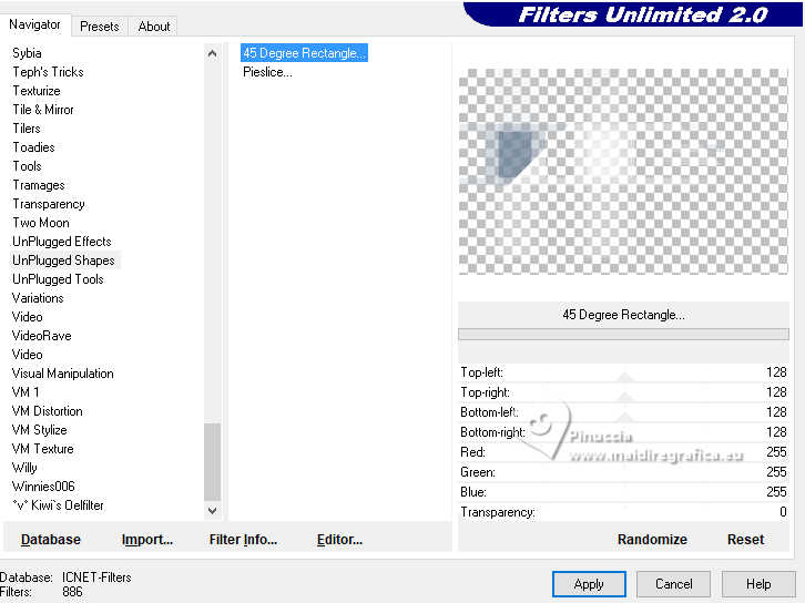 Effetti>Plugins>Filters Unlimited 2.0 - Unplugged Shapes - 45 Degree Rectangle, con i settaggi standard.