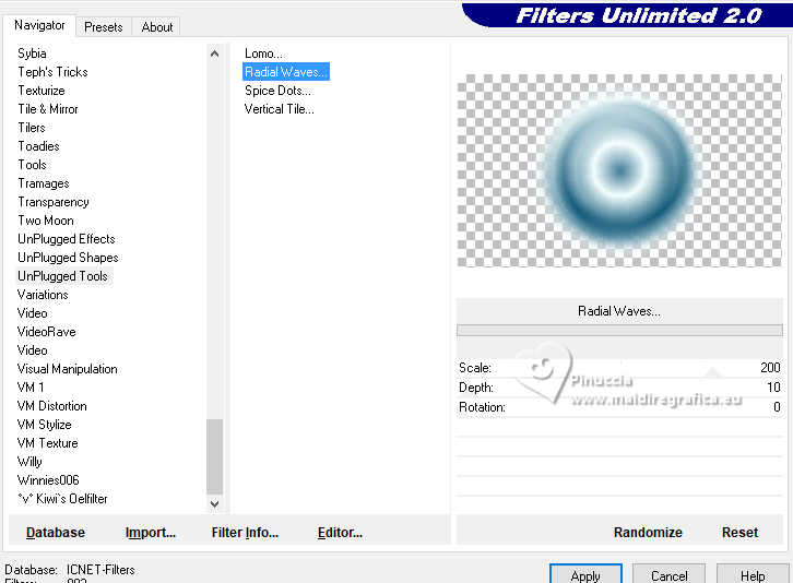 Effetti>Plugins>Filters Unlimited 2.0 - Unplugged Tools - Radial Waves, con i settaggi standard.