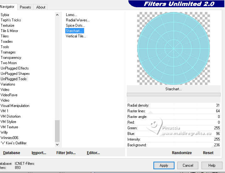 Effetti>Plugins>Filters Unlimited 2.0 - Unplugged Tools - Starchart, con i settaggi standard.