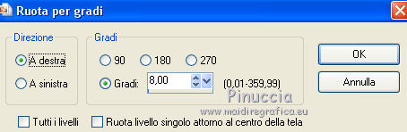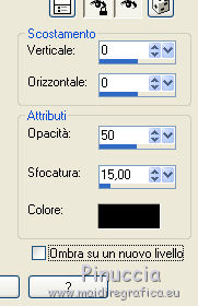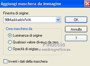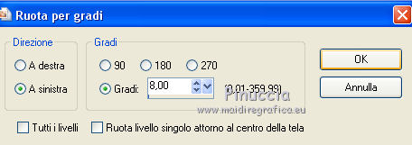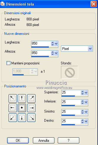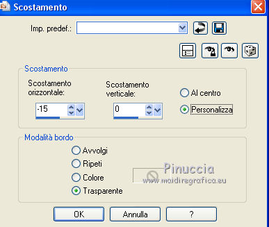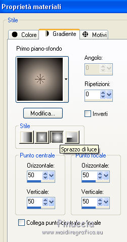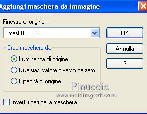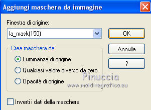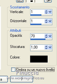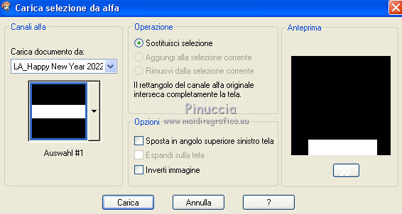 qui puoi trovare qualche risposta ai tuoi dubbi. Se l'argomento che ti interessa non è presente, ti prego di segnalarmelo. Il copyright del tutorial appartiene a Laguna Azul. Questo tutorial è stato creato con PspX9 e tradotto con CorelX e CorelX2, ma può essere realizzato anche con le altre versioni di PSP. Dalla versione X4, il comando Immagine>Rifletti è stato sostituito con Immagine>Capovolgi in orizzontale, e il comando Immagine>Capovolgi con Immagine>Capovolgi in verticale. Nelle versioni X5 e X6, le funzioni sono state migliorate rendendo disponibile il menu Oggetti. Con la nuova versione X7, sono tornati Rifletti>Capovolgi, ma con nuove varianti. Vedi la scheda sull'argomento qui Traduzione francese/traduction en français qui Le vostre versioni qui![]() Occorrente: Un tube a scelta (il tube usato nel tutorial originale è un tube soggetto a licenza). Il resto del materiale qui Per il tube usato nella mia versione grazie Mina Puoi colorare tutti gli elementi in grigio come preferisci. Non ne parlerò nel tutorial; tuttavia, che tu lo faccia o no dipende da te. (in questa pagina trovi i links ai siti dei creatori di tubes) ![]() non esitare a cambiare modalità di miscelatura e opacità secondo i colori utilizzati. Come ho scritto nell'anteprima, Puoi colorare tutti gli elementi in grigio come preferisci. Apri le maschere in PSP e minimizzale con il resto del materiale. 1. Scegli una tonalità media del tuo tube per il tuo colore di primo piano, o scegli un colore dorato dal materiale. Imposta il colore di sfondo con il colore nero. ![]() Apri l'immagine la_Happy New Year 2022. Questa immagine, che sarà la base del tuo lavoro, non è vuota, ma contiene una selezione salvata sul canale alfa. Riempi l'immagine trasparente con il colore nero.Livelli>Nuovo livello maschera>Da immagine. Apri il menu sotto la finestra di origine e vedrai la lista dei files aperti. Seleziona la maschera la_mask(150). ![]() Livelli>Unisci>Unisci gruppo. 2. Livelli>Nuovo livello raster. Riempi il livello con il colore di primo piano.Livelli>Nuovo livello maschera>Da immagine. Apri il menu sotto la finestra di origine e seleziona la maschera 0mask008_LT ![]() Livelli>Unisci>Unisci gruppo. Effetti>Effetti 3D>Sfalsa ombra. ![]() 3. Passa il colore di primo piano a Gradiente di primo piano/sfondo, stile Sprazzo di luce. ![]() Livelli>Nuovo livello raster. Riempi il livello con il gradiente.Livelli>Nuovo livello maschera>Da immagine. Apri il menu sotto la finestra di origine e seleziona la maschera 98MaskkelsWWA. ![]() Livelli>Unisci>Unisci gruppo. Effetti>Effetti 3D>Sfalsa ombra, con i settaggi precedenti. ![]() 4. Scegli e apri una cornice la_frame back ..., io ho scelto la cornice oro. Modifica>Copia. Torna al tuo lavoro e vai a Modifica>Incolla come nuovo livello. Effetti>Effetti di immagine>Scostamento. ![]() Effetti>Effetti 3D>Sfalsa ombra. ![]() 5. Scegli e apri una delle immagini di sfondo la_paper... e vai a Modifica>Copia. Torna al tuo lavoro e vai a Modifica>Incolla come nuovo livello. Immagine>Ruota per gradi - 8 gradi a destra. ![]() Effetti>Effetti di immagine>Scostamento. ![]() Effetti>Effetti 3D>Sfalsa ombra. ![]() 6. Scegli e apri una seconda immagine di sfondo la_paper... e vai a Modifica>Copia. Torna al tuo lavoro e vai a Modifica>Incolla come nuovo livello. Immagine>Ruota per gradi - 8 gradi a sinistra. ![]() Effetti>Effetti di immagine>Scostamento. Effetti>Effetti 3D>Sfalsa ombra, con i settaggi precedenti. 7. Scegli e apri uno dei tube la_star deco... e vai a Modifica>Copia. Torna al tuo lavoro e vai a Modifica>Incolla come nuovo livello. Effetti>Effetti di bordo>Aumenta. Scegli e apri una delle cornici la_frame inside..., e vai a Modifica>Copia. Torna al tuo lavoro e vai a Modifica>Incolla come nuovo livello. Effetti>Effetti di bordo>Aumenta. Scegli e apri una delle cornici la_frame... e vai a Modifica>Copia. Torna al tuo lavoro e vai a Modifica>Incolla come nuovo livello. Scegli e apri uno dei tube la_confetti... e vai a Modifica>Copia. Torna al tuo lavoro e vai a Modifica>Incolla come nuovo livello. Effetti>Effetti di bordo>Aumenta. prima di continuare, un consiglio, per evitare gli antiestetici tagli delle ombre, che inevitabilmente si vedono sullo sfondo trasparente dei lavori in png, ![]() Immagine>Dimensioni tela - 850 x 850 pixels ![]() 8. Apri il tuo tube e vai a Modifica>Copia. Torna al tuo lavoro e vai a Modifica>Incolla come nuovo livello. Immagine>Ridimensiona, se e quanto necessario, tutti i livelli non selezionato. Posiziona il tube nella cornice, a tuo piacimento.Dovrebbe adattarsi alla cornice, ma non importa se il tube supera il bordo. Regola>Messa a fuoco>Metti a fuoco. Effetti>Effetti 3D>Sfalsa ombra. ![]() Selezione>Carica/Salva selezione>Carica selezione da canale alfa. La selezione #1 è subito disponibile. Devi soltanto cliccare Carica. ![]() Premi sulla tastiera il tasto CANC ![]() Selezione>Deseleziona. 9. Adesso puoi aggiungere gli elementi dello scrap che preferisci. Il ridimensionamento e l'ombra dipendono da te. Non dimenticare di mettere a fuoco. Aggiungi, se vuoi, il watermark dell'autore e del traduttore. Firma il tuo lavoro su un nuovo livello. Livelli>Unisci>Unisci visibile. Salva in formato png per conservare la trasparenza dello sfondo: File>Esporta>Ottimizzazione PNG ![]() ![]() Per il tube di questo esempio grazie Maryse ![]() ![]() Se hai problemi o dubbi, o trovi un link non funzionante, o anche soltanto per un saluto, scrivimi. |