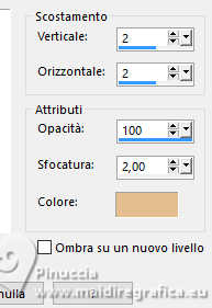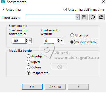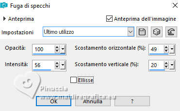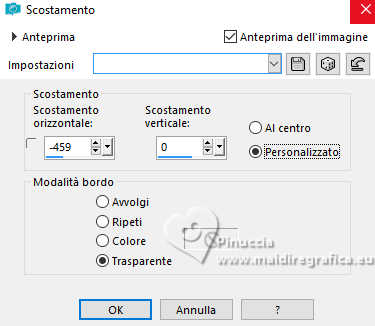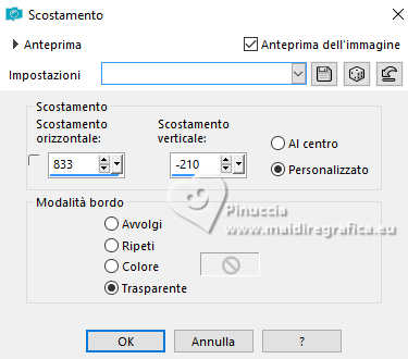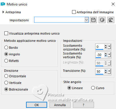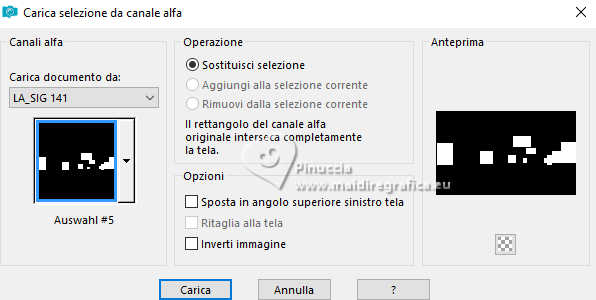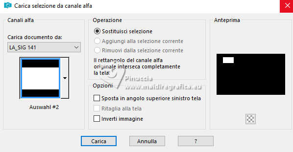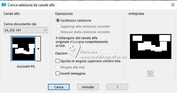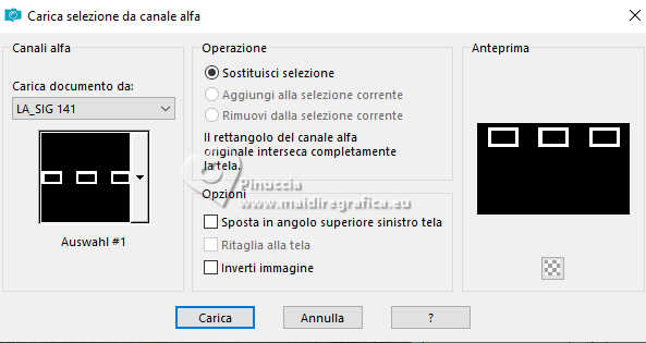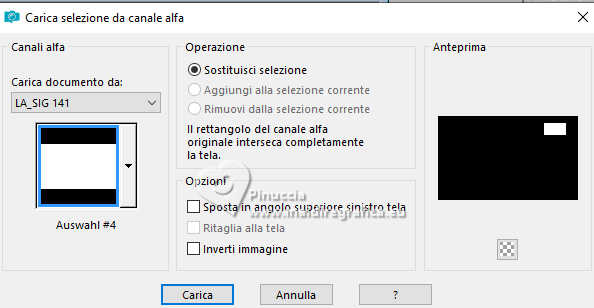 qui puoi trovare qualche risposta ai tuoi dubbi. Se l'argomento che ti interessa non è presente, ti prego di segnalarmelo. Il copyright del tutorial appartiene a Laguna Azul. Questo tutorial è stato creato con PspX9 e tradotto con PSPX9 e PSPX2020, ma può essere realizzato anche con le altre versioni di PSP. Dalla versione X4, il comando Immagine>Rifletti è stato sostituito con Immagine>Capovolgi in orizzontale, e il comando Immagine>Capovolgi con Immagine>Capovolgi in verticale. Nelle versioni X5 e X6, le funzioni sono state migliorate rendendo disponibile il menu Oggetti. Con la nuova versione X7, sono tornati Rifletti>Capovolgi, ma con nuove varianti. Vedi la scheda sull'argomento qui Traduzione francese/traduction en français qui Le vostre versioni qui![]() Occorrente: Un tube a scelta (il tube usato da Laguna Azul è sotto licenza) Il resto del materiale ![]() Grazie per il tube usato per la mia versione Béas e per le maschere Narah. (in questa pagina trovi i links ai siti dei creatori di tubes) ![]() in caso di dubbi, ricorda di consultare la mia sezione filtri qui Filters Unlimited 2.0 - versione software qui AFS [IMPORT] - AFHbev2a, EVANESCE, sqborder2 qui Mura's Meister - Copies qui Alien Skin Eye Candy 5 Impact - Glass, Extrude qui VM Toolbox - Zoom Blur qui Alien Skin Xenofex 2 - Constellation qui I filtri AFS IMPORT, e VM Toolbox si possono usare da soli o importati in Filters Unlimited (come fare vedi qui) Se un filtro fornito appare con questa icona ![]() ![]() ![]() non esitare a cambiare modalità di miscelatura e opacità secondo i colori utilizzati. Metti i presets Cliccando sul file una o due volte (a seconda delle tue impostazioni), automaticamente il preset si installerà nella cartella corretta. perché uno o due clic vedi qui ![]() Apri le maschere in PSP e minimizzale con il resto del materiale. 1. Imposta il colore di primo piano con il colore bianco e il colore di sfondo con il colore nero. ![]() Apri LA_SIG 141 Questa immagine, che sarà la base del tuo lavoro, non è vuota, ma contiene le selezioni salvate sul canale alfa. Apri il tuo tube e continua sul tube. Immagine>Ridimensiona, 600 x 600 pixels mantieni proporzioni non selezionato La funzione Messa a fuoco si attiva soltanto in modalità Bicubico ![]() Modifica>Copia. annulla il ridimensionamento: Modifica>Annulla Ridimensiona, e minimizza il tube Torna al tuo lavoro e vai a Modifica>Incolla come nuovo livello. Effetti>Plugins>VM Toolbox - Zoom Blur ![]() se importi l'effetto in Unlimited, questo si posiziona sotto la voce VM Stylize ![]() Con un altro tube, ovviamente, il risultato sarà differente ![]() 2. Effetti>Plugins>Filters Unlimited 2.0 - AFS [IMPORT] - sqborder2 ![]() risultato con il tube della mia seconda versione ![]() Effetti>Plugins>Filters Unlimited 2.0 - AFS [IMPORT] - AFSbev2a, con i settaggi standard. ![]() 3. Effetti>Effetti di immagine>Motivo unico. ![]() Apri LA_HG ![]() Modifica>Copia. Torna al tuo lavoro e vai a Modifica>Incolla come nuovo livello. 4. Livelli>Nuovo livello raster. Riempi il livello con il colore bianco.Livelli>Nuovo livello maschera>Da immagine. Apri il menu sotto la finestra d'origine e vedrai la lista dei files aperti, e seleziona la maschera Narah_Mask_0933 ![]() Livelli>Unisci>Unisci gruppo. Effetti>Effetti di bordo>Aumenta. Cambia la modalità di miscelatura di questo livello in Luce diffusa. 5. Apri uno dei 4 LA_Clock... ![]() Modifica>Copia. Torna al tuo lavoro e vai a Modifica>Incolla come nuovo livello. Spostalo a destra, come nell'esempio.![]() Cambia la modalità di miscelatura di questo livello in Rafforza, o secondo i tuoi colori. 6. Apri LA_Fireworks ![]() Modifica>Copia. Torna al tuo lavoro e vai a Modifica>Incolla come nuovo livello. Regola>Tonalità e saturazione>Viraggio. ![]() Sposta il tube nell'angolo in alto a sinistra.![]() Cambia la modalità di miscelatura di questo livello in Indebolisci, e abbassa l'opacità al 30%, o secondo i tuoi colori. Modifica>Incolla come nuovo livello - il tube LA_Fireworks è ancora in memoria. Regola>Tonalità e saturazione>Viraggio. ![]() Spostalo nell'angolo in basso a sinistra.![]() Cambia la modalità di miscelatura di questo livello in Indebolisci, e abbassa l'opacità al 30%, o secondo i tuoi colori. Di nuovo Modifica>Incolla come nuovo livello - il tube LA_Fireworks è sempre in memoria. Colora il tube nuovamente o lascialo in grigio, come ho fatto io. Spostalo un po' più a sinistra.Cambia la modalità di miscelatura di questo livello in Indebolisci, e abbassa l'opacità al 30%, o secondo i tuoi colori. 7. Apri LA_Stars ![]() Modifica>Copia. Torna al tuo lavoro e vai a Modifica>Incolla come nuovo livello. Livelli>Nuovo livello raster. Riempi il livello con il colore nero.Livelli>Nuovo livello maschera>Da immagine. Apri il menu sotto la finestra d'origine e seleziona la maschera Narah_Mask_1158 ![]() Livelli>Unisci>Unisci gruppo. Livelli>Nuovo livello raster. Riempi il livello con il colore bianco.Livelli>Nuovo livello maschera>Da immagine. Apri il menu sotto la finestra d'origine e seleziona la maschera Narah_Mask_1166 ![]() Livelli>Unisci>Unisci gruppo. Effetti>Effetti 3D>Sfalsa ombra. ![]() 8. Modifica>Copia Speciale/Copia Unione. Modifica>Incolla come nuova immagine, e mininizza questa immagine, che ti servirà più volte. Ora scegli due colori dall'immagine. Imposta il colore di primo piano con un colore medio, per me #e6bd8f, e il colore di sfondo con un colore più scuro, per me #4a4a4a. ![]() 9. Torna al tuo lavoro. Livelli>Nuovo livello raster. Selezione>Carica/Salva selezione>Carica selezione da canale alfa. La selezione Auswahl#1 è subito disponibile. Devi soltanto cliccare Carica. ![]() Riempi la selezione con il colore di primo piano.Selezione>Carica/Salva selezione>Carica selezione da canale alfa. Apri il menu delle selezioni e carica la selezione Auswahl #2. ![]() Modifica>Incolla nella selezione (l'immagine del punto 8). Regola>Messa a fuoco>Metti a fuoco. Effetti>Plugins>Alien Skin