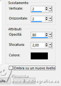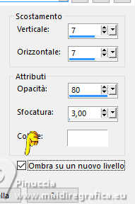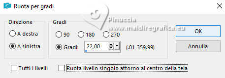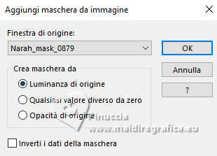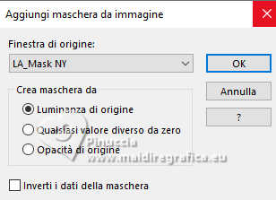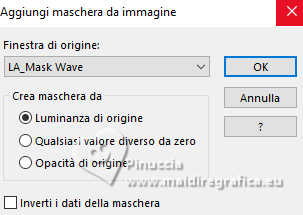 qui puoi trovare qualche risposta ai tuoi dubbi. Se l'argomento che ti interessa non è presente, ti prego di segnalarmelo. Il copyright del tutorial appartiene a Laguna Azul. Questo tutorial è stato creato con PspX9 e tradotto con CorelX e CorelX2, ma può essere realizzato anche con le altre versioni di PSP. Dalla versione X4, il comando Immagine>Rifletti è stato sostituito con Immagine>Capovolgi in orizzontale, e il comando Immagine>Capovolgi con Immagine>Capovolgi in verticale. Nelle versioni X5 e X6, le funzioni sono state migliorate rendendo disponibile il menu Oggetti. Con la nuova versione X7, sono tornati Rifletti>Capovolgi, ma con nuove varianti. Vedi la scheda sull'argomento qui Traduzione francese/traduction en français qui Le vostre versioni quiOccorrente: 1 tube a scelta. Il resto del materiale ![]() Per una maschera grazie Narah. Il resto del material è di Laguna Azul. (in questa pagina trovi i links ai siti dei creatori di tubes) Filtri in caso di dubbi, ricorda di consultare la mia sezione filtri qui Filters Unlimited 2.0 qui &<Bkg Designer sf10II> - Facet Offset, Hinzeberg's mirror 01 (da importare in Unlimited) qui AP 01 [Innovations] qui Simple - Quick Tile qui I filtri Simple si possono usare da soli o importati in Filters Unlimited (come fare vedi qui) Se un filtro fornito appare con questa icona Animation Shop qui ![]() ![]() non esitare a cambiare modalità di miscelatura e opacità secondo i colori utilizzati. ![]() Metti la selezione nella cartella Selezioni. Apri le maschere in PSP e minimizzale con il resto del materiale. Imposta il colore di primo piano con il colore nero e il colore di sfondo con il colore bianco ![]() 1. Scegli una delle 4 immagini di sfondo LA_golden HG... per me ![]() Questa immagine sarà la base del tuo lavoro. Effetti>Plugins>Filters Unlimited 2.0 - &<Bkg Designer sf10II> - Facet Offset ![]() Effetti>Plugins>Simple - Quick Tile. ![]() 2. Effetti>Plugins>Filters Unlimited 2.0 - &<Bkg Designer sf10II> - Hinzeberg's mirror 01. ![]() Livelli>Duplica. Immagine>Rifletti>Rifletti verticalmente. Abbassa l'opacità di questo livello al 50%. Tasto K per attivare lo strumento Puntatore ![]() Posizione X: -370,00. ![]() Livelli>Unisci>Unisci giù. Tasto M per deselezionare lo strumento. Effetti>Effetti di bordo>Aumenta. Effetti>Plugins>Simple - Quick Tile ![]() 3. Selezione>Carica/Salva selezione>Carica selezione da disco. Cerca e carica la selezione LA_Auswahl #1 ![]() Selezione>Innalza selezione a livello. Selezione>Deseleziona. Tasto K per attivare lo strumento Puntatore ![]() Posizione Y: 275,00. ![]() Tasto M per deselezionare lo strumento. Immagine>Rifletti>Rifletti orizzontalmente. Effetti>Plugins>AP 01 [Innovations] - Lines SilverLining. ![]() Effetti>Effetti 3D>Sfalsa ombra, colore nero. ![]() 4. Livelli>Nuovo livello raster. Riempi il livello con il colore nero.Livelli>Nuovo livello maschera>Da immagine. Apri il menu sotto la finestra di origine e vedrai la lista dei files aperti. Seleziona la maschera LA_Mask Wave ![]() Livelli>Unisci>Unisci gruppo. Effetti>Effetti 3D>Sfalsa ombra, colore bianco, ombra su nuovo livello selezionato. ![]() Sul livello dell'ombra: cambia la modalità di miscelatura in Filtra, e abbassa l'opacità al 30%. ![]() Attiva il livello superiore. Cambia la modalità di miscelatura di questo livello in Sovrapponi, e abbassa l'opacità al 40%. ![]() 5. Livelli>Nuovo livello raster. Riempi il livello con il colore bianco.Livelli>Nuovo livello maschera>Da immagine. Apri il menu sotto la finestra di origine e seleziona la maschera LA_Mask NY ![]() Livelli>Unisci>Unisci gruppo. 6. Apri uno dei 6 tubes LA_misted Clock, per me ![]() Modifica>Copia. Torna al tuo lavoro e vai a Modifica>Incolla come nuovo livello. Tasto K per attivare lo strumento Puntatore ![]() Posizione X: 494,00 - Posizione Y: 62,00. ![]() Cambia la modalità di miscelatura di questo livello in Luce diffusa. Apri uno dei tubes LA_misted Firework, per me ![]() Modifica>Copia. Torna al tuo lavoro e vai a Modifica>Incolla come nuovo livello. Posizione X: 147,00 - Posizione Y: -88,00. ![]() Apri uno dei tubes LA_misted Champagner set, per me ![]() Modifica>Copia. Torna al tuo lavoro e vai a Modifica>Incolla come nuovo livello. Posizione X: 205,00 - Posizione Y: 244,00. ![]() 7. Apri LA_Deco gold ![]() Modifica>Copia. Torna al tuo lavoro e vai a Modifica>Incolla come nuovo livello. Posizione X: 31,00 - Posizione Y: -5,00. ![]() Cambia la modalità di miscelatura di questo livello in Luce diffusa. Apri il tube LA_Deco ![]() Modifica>Copia. Torna al tuo lavoro e vai a Modifica>Incolla come nuovo livello. Posizione X: 11,00 - Posizione Y: 10,00. ![]() Apri il tube LA_Confetti ![]() Modifica>Copia. Torna al tuo lavoro e vai a Modifica>Incolla come nuovo livello. Posizione X: 395,00 - Posizione Y: 0,00. ![]() Tasto M per deselezionare lo strumento. 8. Livelli>Nuovo livello raster. Riempi il livello con il colore bianco.Livelli>Nuovo livello maschera>Da immagine. Apri il menu sotto la finestra di origine e seleziona la maschera Narah_mask_0879 ![]() Livelli>Unisci>Unisci gruppo. Cambia la modalità di miscelatura di questo livello in Sovrapponi, e abbassa l'opacità all'85%. 9. Apri il tube LA_2025 ![]() Modifica>Copia. Torna al tuo lavoro e vai a Modifica>Incolla come nuovo livello. ***** (INFO: Con i file LA_Numbers bright gray e LA_Numbers gold and glass puoi mettere insieme i numeri per ogni anno a venire Basta usare il tubo LA_2025 come modello) ***** Sposta il tube sopra i fuochi, a tuo piacimento.Ora Copia/Incolla come nuovo livello 4 palline dell'albero di Natale, e posiziona una pallina a sinistra, una a destra,e le altre due nell'angolo in alto a sinistra, a tuo piacimento. Quando sei soddisfatto della posizione delle palline, attiva il livello superiore delle palline e vai a Livelli>Unisci>Unisci giù - 3 volte. ![]() Effetti>Effetti 3D>Sfalsa ombra, colore nero, ombra su nuovo livello non selezionato. ![]() 10. Imposta il colore di primo piano con 