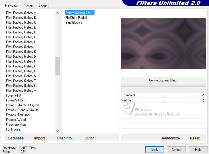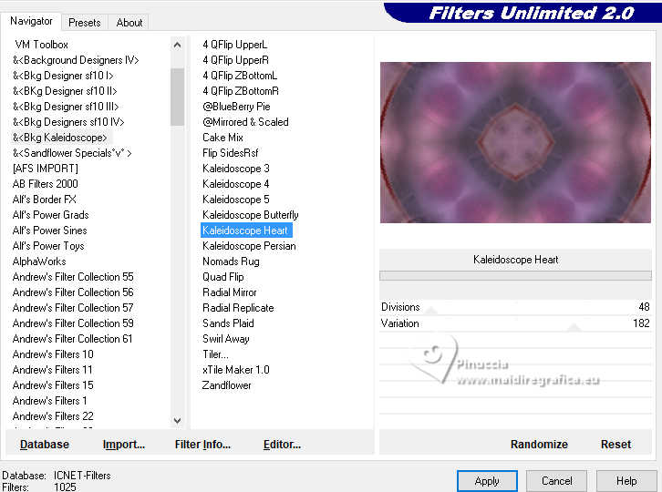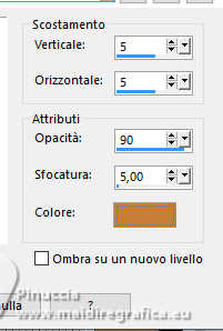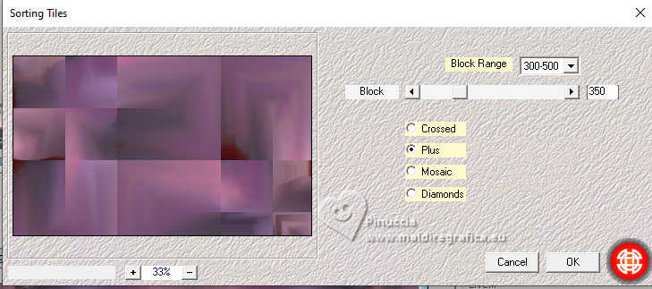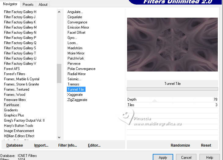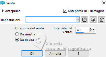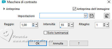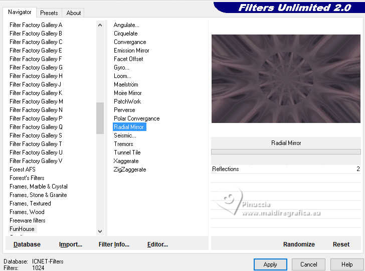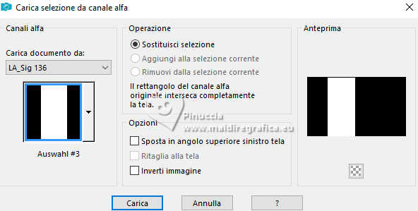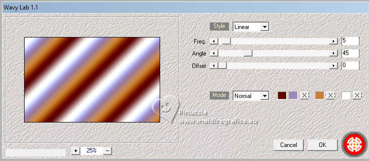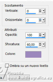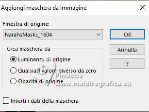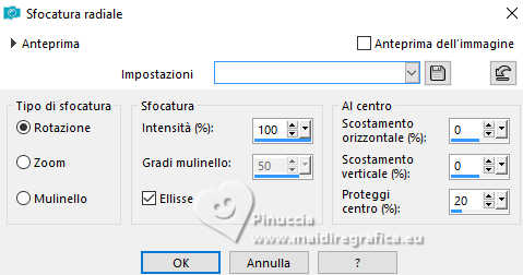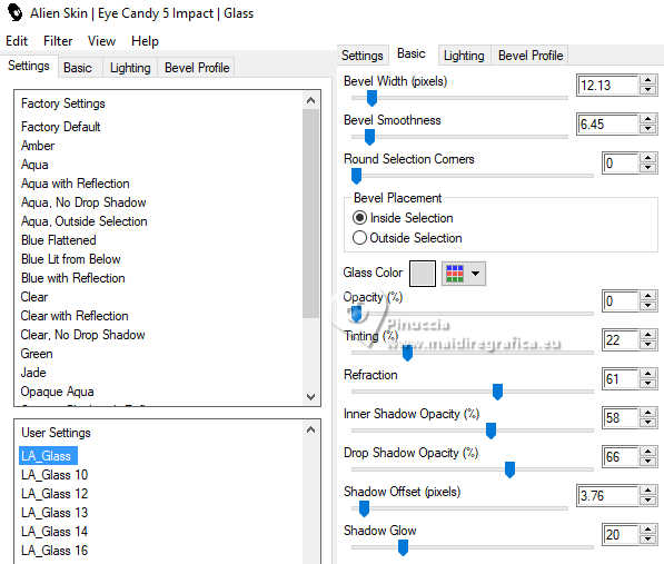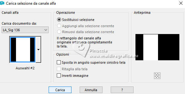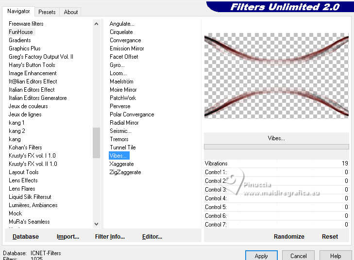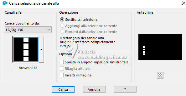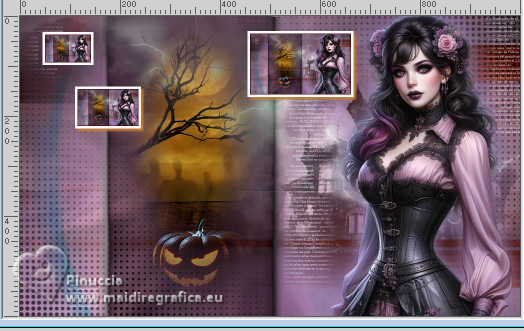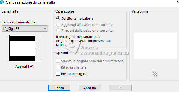 qui puoi trovare qualche risposta ai tuoi dubbi. Se l'argomento che ti interessa non è presente, ti prego di segnalarmelo. Il copyright del tutorial appartiene a Laguna Azul. Questo tutorial è stato creato con PspX9 e tradotto con CorelX e CorelX2, ma può essere realizzato anche con le altre versioni di PSP. Dalla versione X4, il comando Immagine>Rifletti è stato sostituito con Immagine>Capovolgi in orizzontale, e il comando Immagine>Capovolgi con Immagine>Capovolgi in verticale. Nelle versioni X5 e X6, le funzioni sono state migliorate rendendo disponibile il menu Oggetti. Con la nuova versione X7, sono tornati Rifletti>Capovolgi, ma con nuove varianti. Vedi la scheda sull'argomento qui Traduzione francese/traduction en français qui Le vostre versioni quiOccorrente: Un tube a scelta Il resto del materiale ![]() Per 3 maschere grazie Narah. Per i tubes dei miei esempi grazie Virginia e Blaque Heart Designz Il resto del materiale è di Laguna Azul (in questa pagina trovi i links ai siti dei creatori di tubes) Filtri in caso di dubbi, ricorda di consultare la mia sezione filtri qui Filters Unlimited 2.0 qui Filter Factory Gallery U - Centre Square Tiler qui &<Bkg Kaleidoscope> - Kaleidoscope Heart (da importare in Unlimited) qui Funhouse - Tunnel Tile, Radial Mirror, Vibes qui i tre effetti nel materiale Mehdi - Sorting Tiles qui Mehdi - Wavy Lab 1.1. qui Alien Skin Eye Candy 5 Impact - Glass qui I filtri Funhouse e Factory Gallery si possono usare da soli o importati in Filters Unlimited (come fare vedi qui) Se un filtro fornito appare con questa icona ![]() non esitare a cambiare modalità di miscelatura e opacità secondo i colori utilizzati. Metti il preset Cliccando sul file una o due volte (a seconda delle tue impostazioni), automaticamente il preset si installerà nella cartella corretta. perchè uno o due clic vedi qui ![]() Apri le maschere in PSP e minimizzale con il resto del materiale. 1. Apri LA_Farbtabelle e spostalo nell'angolo destro della tua area di lavoro. ![]() Rimani sul livello di sfondo, e riempi il campo 1 con il colore bianco.In questo caso, puoi lasciare lo strumento Riempimento in modalità Nessuno ![]() Ora scegli un colore chiaro dal tuo tube, potrebbe essere anche una tonalità leggeremente più forte, e riempi con questo colore il campo 2, per l'esempio #9c88bd. Scegli un colore scuro per il campo 3, per l'esempio #5f0602. Scegli un colore medio forte per il campo 4, per l'esempio #c87e35. Infine scegli il nero per il campo 5. ![]() 1. Imposta il colore di primo piano con il colore nero. Apri LA_SIG 136 Questa immagine, che sarà la base del tuo lavoro, non è vuota, ma contiene le selezioni salvate sul canale alfa. Riempi l'immagine trasparente con il colore nero.Apri il tuo tube e vai a Modifica>Copia. Torna al tuo lavoro e vai a Modifica>Incolla come nuovo livello. Spostalo sulla destra,in modo che sia visibile solo la parte superiore del corpo. Livelli>Duplica. Immagine>Rifletti>Rifletti orizzontalmente. Sposta il tube in modo che sia visibile solo la testa.![]() Livelli>Unisci>Unisci giù. 3. Regola>Sfocatura>Sfocatura radiale. ![]() Livelli>Unisci>Unisci giù. Selezione>Carica/Salva selezione>Carica selezione da canale alfa. La selezione Auswahl #1 è subito disponibile. Devi soltanto cliccare Carica. ![]() Immagine>Ritaglia la selezione. Selezione>Deseleziona. Livelli>Duplica. 4. Effetti>Plugins>Filters Unlimited 2.0 - Filter Factory Gallery U - Centre Square Tiler, con i settaggi standard. ![]() Cambia la modalità di miscelatura di questo livello in Indebolisci, e abbassa l'opacità al 75%. Attiva il livello inferiore. Regola>Sfocatura>Sfocatura guassiana - raggio 30. ![]() Attiva nuovamente il livello superiore. Livelli>Duplica. 5. Effetti>Plugins>Filters Unlimited 2.0 - Funhouse - Tunnel Tile, con i settaggi standard. ![]() Effetti>Plugins>Filters Unlimited 2.0 - Funhouse - Radial Mirror, con i settaggi standard. ![]() Puoi lasciare la modalità di miscelatura in Indebolisci, o cambiare in Luce diffusa, come preferisci. Apri uno dei 6 tube LA_haunted house per me ![]() (o puoi anche prendere una delle strette case infestate) Modifica>Copia. Torna al tuo lavoro e vai a Modifica>Incolla come nuovo livello. Cambia la modalità di miscelatura in Indebolisci, Sovrapponi o Schiarisci, come ti sembra meglio. Sposta il tube pressappoco come nell'esempio,vale anche per i tubes stretti. ![]() Ecco un esempio con una delle case strette. ![]() Anche qui, come sopra, cambia la modalità di miscelatura in Sovrapponi. 6. Imposta il colore di primo piano con il colore 3 ![]() Livelli>Nuovo livello raster. Riempi il livello con il colore di primo piano.Livelli>Nuovo livello maschera>Da immagine. Apri il menu sotto la finestra di origine e vedrai la lista dei files aperti. Seleziona la maschera LA_Mask(150) ![]() Livelli>Unisci>Unisci gruppo. Livelli>Duplica. Effetti>Plugins>Filters Unlimited 2.0 - Funhouse - Vibes, con i settaggi standard. ![]() 7. Modifica>Copia Speciale>Copia Unione. Elimina il livello superiore. Ora il livello superiore è il livello della maschera. Immagine>Ruota per gradi - 90 gradi a destra. ![]() Effetti>Effetti di immagine>Scostamento. ![]() Cambia la modalità di miscelatura di questo livello in Differenza o come preferisci, perchè il risultato appare diverso a seconda del colore. 8. Modifica>Incolla come nuovo livello Effetti>Plugins>Filters Unlimited 2.0 - &<Bkg Kaleidoscope> - Kaleidoscope Heart (il risultato sarà diverso a seconda del colore) ![]() Effetti>Plugins>Mehdi - Sorting Tiles ![]() Effetti>Effetti di bordo>Aumenta. Cambia la modalità di miscelatura di questo livello in Filtra, e abbassa l'opacità tra 20-48%. 9. Imposta il colore di primo piano con il colore bianco. Livelli>Nuovo livello raster. Riempi il livello con il colore di primo piano.Livelli>Nuovo livello maschera>Da immagine. Apri il menu sotto la finestra di origine e seleziona la maschera NarahsMasks_1597 ![]() Livelli>Unisci>Unisci gruppo. Imposta il color