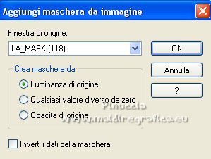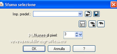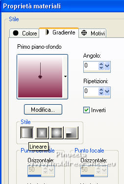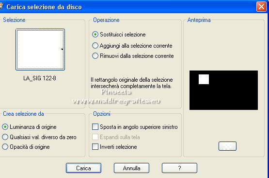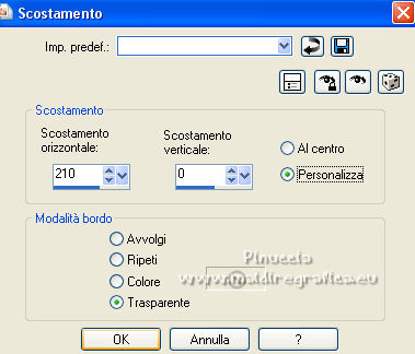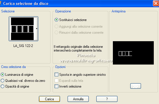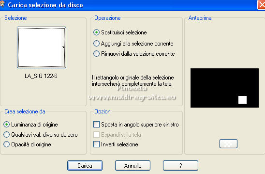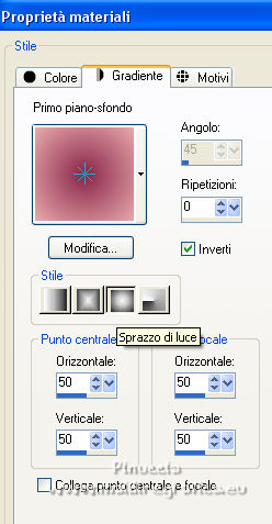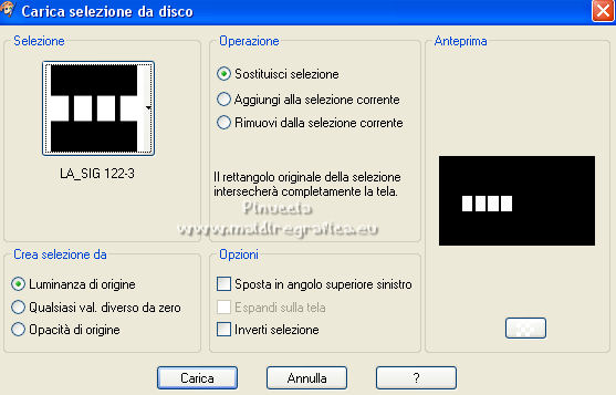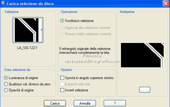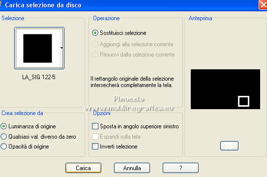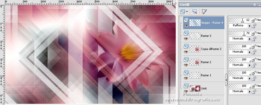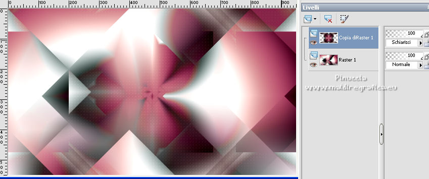 qui puoi trovare qualche risposta ai tuoi dubbi. Se l'argomento che ti interessa non è presente, ti prego di segnalarmelo. Il copyright del tutorial appartiene a Laguna Azul. Questo tutorial è stato creato con PspX9 e tradotto con CorelX e CorelX2, ma può essere realizzato anche con le altre versioni di PSP. Dalla versione X4, il comando Immagine>Rifletti è stato sostituito con Immagine>Capovolgi in orizzontale, e il comando Immagine>Capovolgi con Immagine>Capovolgi in verticale. Nelle versioni X5 e X6, le funzioni sono state migliorate rendendo disponibile il menu Oggetti. Con la nuova versione X7, sono tornati Rifletti>Capovolgi, ma con nuove varianti. Vedi la scheda sull'argomento qui Traduzione francese/traduction en français qui Le vostre versioni quiOccorrente: Un tube a scelta (il tube usato nel tutorial originale è un tube soggetto a licenza). Il resto del materiale qui Per il tube usato nella mia versione e una maschera grazie Lana e Narah Il resto del materiale è di Laguna Azul (in questa pagina trovi i links ai siti dei creatori di tubes) Filtri: in caso di dubbi, ricorda di consultare la mia sezione filtri qui Filters Unlimited 2.0 qui &<Bkg Designer sf10> - Cruncher (à importer dans Unlimited) qui Alien Skin Eye Candy 5 Impact - Glass qui Mehdi - Wavy Lab 1.1 qui Mehdi - Sorting Tiles qui Simple - Quick Tile, Pizza Slice Mirror, Blintz qui VM Toolbox - MirrororriM qui L&K's - L&K's Zitah qui Penta.com - Color Dot qui Mura's Meister - Copies qui I filtri Penta, Simple e VM Toolbox si possono usare da soli o importati in Filters Unlimited (come fare vedi qui) Se un filtro fornito appare con questa icona ![]() non esitare a cambiare modalità di miscelatura e opacità secondo i colori utilizzati. Nelle ultime versioni di PSP non c'è il gradiente di primo piano/sfondo (Corel_06_029) Puoi usare i gradienti delle versioni precedenti. Trovi qui i gradienti Corel X. Metti il preset Cliccando sul file una o due volte (a seconda delle tue impostazioni), automaticamente il preset si installerà nella cartella corretta. perchè uno o due clic vedi qui Metti le selezioni nella cartella Selezioni. Apri le maschere in PSP e minimizzale con il resto del materiale. 1. Per il tutorial hai bisogno di 5 colori. Se vuoi preparare la tua paletta dei colori, apri una nuova immagine trasparente 250 x 50 pixels Duplica il livello 4 volte per avere cinque livelli. Riempi il primo livello con il colore bianco. Riempi il secondo livello con un colore chiaro del tuo tube; per me #e8aaab, e il terzo livello con un colore scuro del tuo tube, per me #892549. Riempi il quarto livello con un colore completamente diverso, o un colore che corrisponda al colore. Un tono piuttosto chiaro; per me #7db0db. Riempi infine il quinto livello con il colore nero. Sposta i livelli in modo da avere in ordine e ben visibili i cinque colori. ![]() ![]() 2. Imposta il colore di primo piano con il colore 2, e il colore di sfondo con il colore 5. ![]() Apri una nuova immagine trasparente 950 x 550 pixels. Effetti>Plugins>Mehdi - Wavy Lab 1.1. questo filtro lavora con i colori della paletta: il primo è il colore di sfondo, il secondo quello di primo piano; cambia gli ultimi due colori creati dal filtro: il terzo con il colore 3 #892549 e il quarto con il colore bianco. ![]() Effetti>Plugins>Mehdi - Sorting Tiles ![]() 3. Effetti>Plugins>VM Toolbox - MirrororriM, con i settaggi standard. ![]() Livelli>Duplica. Immagine>Ruota per gradi - 90 gradi a destra. ![]() Effetti>Plugins>Simple - Quick Tiles. ![]() Effetti>Plugins>Simple - Pizza Slice Mirror Effetti>Plugins>Simple - Blintz Questi effetti del filtro Simple lavorano senza finestra; risultato ![]() Effetti>Plugins>Penta.com - Color Dot. ![]() Cambia la modalità di miscelatura di questo livello in Schiarisci. ![]() Effetti>Effetti di bordo>Aumenta. Livelli>Unisci>Unisci visibile. 4. Effetti>Plugins>Filter Unlimited 2.0 - &<Bkg Designer sf10> - Cruncher, con i settaggi standard. ![]() Apri il tube LA_Deco e vai a Modifica>Copia. Torna al tuo lavoro e vai a Modifica>Incolla come nuovo livello. Imposta il colore di sfondo con il terzo colore #892549 ![]() ![]() Passa il colore di primo piano a Gradiente di primo piano/sfondo, stile Sprazzo di luce. ![]() Apri il tube LA_Flower. Il tube è selezionato ed è attivo il livello "farbe" (colore). ![]() Riempi la selezione con il gradiente.Cambia la modalità di miscelatura di questo livello in Colore. Mantieni selezionato. Livelli>Unisci>Unisci visibile. Selezione>Modifica>Sfuma - 3 pixels. ![]() Selezione>Inverti. Premi 4 volte CANC sulla tastiera ![]() Selezione>Deseleziona. Modifica>Copia, e minimizza il tube che ti servirà ancora. Torna al tuo lavoro e vai a Modifica>Incolla come nuovo livello. Effetti>Effetti di immagine>Scostamento. ![]() 5. Livelli>Duplica. Regola>Sfocatura>Sfocatura radiale. ![]() Imposta il colore di primo piano con il colore bianco #ffffff. Livelli>Nuovo livello raster. Selezione>Carica/Salva selezione>Carica selezione da disco. Cerca e carica la selezione LA_SIG 122-1. ![]() Riempi la selezione con il colore bianco.Selezione>Deseleziona. Effetti>Plugins>VM Toolbox - MirrororriM, ![]() Effetti>Plugins>L&K's - L&K's Zitah. ![]() 6. Livelli>Duplica. Immagine>Rifletti. Immagine>Capovolgi. Livelli>Unisci>Unisci giù. Abbassa l'opacità di questo livello al 70%. 7. Imposta il colore di primo piano con il colore 4 #7db0db ![]() Livelli>Nuovo livello raster. Riempi il livello con il colore di primo piano.Livelli>Nuovo livello maschera>Da immagine. Apri il menu sotto la finestra di origine e vedrai la lista dei files aperti. Seleziona la maschera LA_MASK (118). ![]() Livelli>Unisci>Unisci gruppo. Effetti>Plugins>L&K's - L&K's Zitah. ![]() Effetti>Effetti geometrici>Inclina. ![]() Cambia la modalità di miscelatura di questo livello in Rafforza, e abbassa l'opacità al 62%, o secondo i tuoi colori. ![]() 7. Modifica>Incolla come nuovo livello (il fiore dovrebbe essere ancora in memoria). Spostalo nell'ang