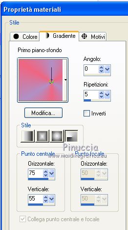 qui puoi trovare qualche risposta ai tuoi dubbi. Se l'argomento che ti interessa non è presente, ti prego di segnalarmelo. Il copyright del tutorial appartiene a Laguna Azul. Questo tutorial è stato creato con PspX9 e tradotto con CorelX e CorelX2, ma può essere realizzato anche con le altre versioni di PSP. Dalla versione X4, il comando Immagine>Rifletti è stato sostituito con Immagine>Capovolgi in orizzontale, e il comando Immagine>Capovolgi con Immagine>Capovolgi in verticale. Nelle versioni X5 e X6, le funzioni sono state migliorate rendendo disponibile il menu Oggetti. Con la nuova versione X7, sono tornati Rifletti>Capovolgi, ma con nuove varianti. Vedi la scheda sull'argomento qui Traduzione francese/traduction en français qui Le vostre versioni quiOccorrente: L'immagine di uno o più fiori e un tube a scelta (il tube usato nel tutorial originale è un tube soggetto a licenza). Il resto del materiale qui Per il tube usato nella mia versione grazie Luz Cristina Per le maschere grazie Narah. Il resto del materiale è di Laguna Azul (in questa pagina trovi i links ai siti dei creatori di tubes) Filtri: in caso di dubbi, ricorda di consultare la mia sezione filtri qui Filters Unlimited 2.0 qui Andrew's Filter Collection 56 - A Bit Left Over Gradient qui Filter Factory Gallery D - Vertigo qui Alien Skin Eye Candy 5 Impact - Glass qui I filtri Factory Gallery e Andrew's si possono usare da soli o importati in Filters Unlimited (come fare vedi qui) Se un filtro fornito appare con questa icona ![]() non esitare a cambiare modalità di miscelatura e opacità secondo i colori utilizzati. Nelle ultime versioni di PSP non c'è il gradiente di primo piano/sfondo (Corel_06_029) Puoi usare i gradienti delle versioni precedenti. Trovi qui i gradienti Corel X. Metti il preset Cliccando sul file una o due volte (a seconda delle tue impostazioni), automaticamente il preset si installerà nella cartella corretta. perchè uno o due clic vedi qui Metti le selezioni nella cartella Selezioni. Apri le maschere in PSP e minimizzale con il resto del materiale. 1. Apri una nuova immagine trasparente 900 x 550 Pixels. Scegli due colori dal tuo tube, e imposta il colore di primo piano con un colore chiaro, non troppo luminoso: il mio #b190c4, e il colore di sfondo con un colore completamente diverso, di tono medio: il mio #ef6581. ![]() Passa il colore di primo piano a Gradiente di primo piano/sfondo, stile Radiale. ![]() Riempi l'immagine trasparente con il gradiente.2. Effetti>Plugins>Filters Unlimited 2.0 - Andrew's Filter Collection 56 - A Bit Left Over Gradient, con i settaggi standard ![]() Effetti>Effetti di immagine>Motivo unico. ![]() Livelli>Duplica. Effetti>Plugins>Filters Unlimited 2.0 - Filter Factory Gallery D - Vertigo, con i settaggi standard. ![]() Livelli>Nuovo livello maschera>Da immagine. Apri il menu sotto la finestra di origine e vedrai la lista dei files aperti. Seleziona la maschera Narah_Mask_0879 ![]() Livelli>Unisci>Unisci gruppo. Cambia la modalità di miscelatura di questo livello in Indebolisci. 3. Attiva il livello inferiore. Regola>Sfocatura>Sfocatura radiale. ![]() Rimani su questo livello. Livelli>Nuovo livello raster. Imposta il colore di primo piano con il colore bianco. Riempi il livello con il colore bianco.Livelli>Nuovo livello maschera>Da immagine. Apri il menu sotto la finestra di origine e vedrai la lista dei files aperti. Seleziona la maschera Narah_mask_0913 ![]() Livelli>Unisci>Unisci gruppo. Cambia la modalità di miscelatura di questo livello in Luce diffusa. 4. Attiva il livello superiore. Apri il tube LA_Deco 01 e vai a Modifica>Copia. Torna al tuo lavoro e vai a Modifica>Incolla come nuovo livello. Effetti>Effetti di immagine>Scostamento. ![]() Apri il tube LA_Deco 02 e vai a Modifica>Copia. Torna al tuo lavoro e vai a Modifica>Incolla come nuovo livello. Apri il tube LA_Deco 03 e vai a Modifica>Copia. Torna al tuo lavoro e vai a Modifica>Incolla come nuovo livello. 4. Selezione>Carica/Salva selezione>Carica selezione da disco. Cerca e carica la selezione LA_SIG 119-1. ![]() Apri la tua immagine dei fiori, e vai a Modifica>Copia. Torna al tuo lavoro e vai a Modifica>Incolla come nuovo livello. Posiziona l'immagine sulla selezione.Selezione>Inverti. Premi sulla tastiera il tasto CANC ![]() Selezione>Deseleziona. Effetti>Plugins>Alien Skin Eye Candy 5 Impact - Glass. Seleziona il preset LA_Glass e ok. ![]() Questi i settaggi, in caso di problemi con il preset. ![]() 6. Apri LA_Deco 04, e vai a Modifica>Copia. Torna al tuo lavoro e vai a Modifica>Incolla come nuovo livello. Sposta il tube nell'angolo in alto a sinistra, un po' fuori dal bordo.![]() Cambia la modalità di miscelatura di questo livello in Luce diffusa. 7. Livelli>Nuovo livello raster. Selezione>Carica/Salva selezione>Carica selezione da disco. Cerca e carica la selezione LA_SIG 119-2. ![]() Apri LA_Deco 05 e vai a Modifica>Copia. Torna al tuo lavoro e vai a Modifica>Incolla nella selezione. Selezione>Deseleziona. 8. Attiva il livello inferiore. Selezione>Carica/Salva selezione>Carica selezione da disco. Cerca e carica la selezione LA_SIG 119-3. ![]() Selezione>Innalza selezione a livello. Livelli>Disponi>Porta in alto. Effetti>Plugins>Alien Skin Eye Candy 5 Impact - Glass, con i settaggi precedenti. Selezione>Deseleziona. 9. Livelli>Nuovo livello raster. Selezione>Carica/Salva selezione>Carica selezione da disco. Cerca e carica la selezione LA_SIG 119-4. ![]() Apri la cornice LA_White Frame e vai a Modifica>Copia. Torna al tuo lavoro e vai a Modifica>Incolla nella selezione. Selezione>Deseleziona. Cambia la modalità di miscelatura di questo livello in Luce diffusa. Livelli>Duplica. Effetti>Effetti di immagine>Scostamento. ![]() Cambia la modalità di miscelatura di questo livello in Dissolvi. Di nuovo Livelli>Duplica e riporta la modalità di miscelatura di questo livello a Normale. Effetti>Effetti di bordo>Aumenta. 10. Livelli>Nuovo livello raster. Imposta il colore di primo piano con un colo