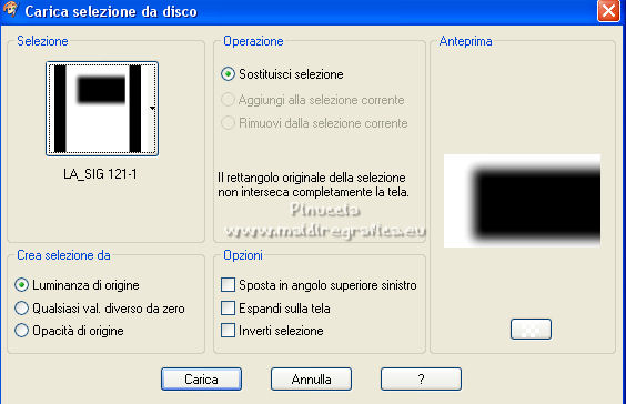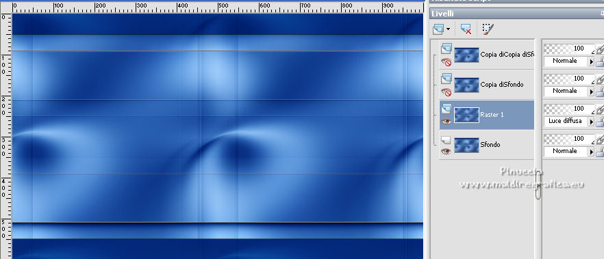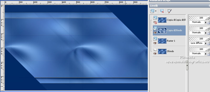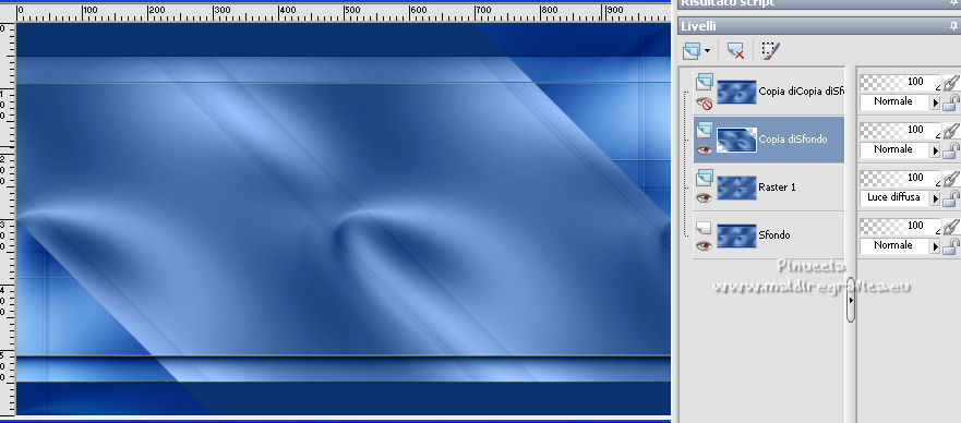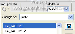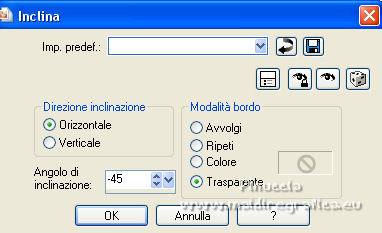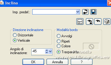 qui puoi trovare qualche risposta ai tuoi dubbi. Se l'argomento che ti interessa non è presente, ti prego di segnalarmelo. Il copyright del tutorial appartiene a Laguna Azul. Questo tutorial è stato creato con PspX9 e tradotto con CorelX e CorelX2, ma può essere realizzato anche con le altre versioni di PSP. Dalla versione X4, il comando Immagine>Rifletti è stato sostituito con Immagine>Capovolgi in orizzontale, e il comando Immagine>Capovolgi con Immagine>Capovolgi in verticale. Nelle versioni X5 e X6, le funzioni sono state migliorate rendendo disponibile il menu Oggetti. Con la nuova versione X7, sono tornati Rifletti>Capovolgi, ma con nuove varianti. Vedi la scheda sull'argomento qui Traduzione francese/traduction en français qui Le vostre versioni quiOccorrente: Un tube a scelta (il tube usato nel tutorial originale è un tube soggetto a licenza). Il resto del materiale qui Per il tube usato nella mia versione e una maschera grazie Lana e Narah Il resto del materiale è di Laguna Azul (in questa pagina trovi i links ai siti dei creatori di tubes) Filtri: in caso di dubbi, ricorda di consultare la mia sezione filtri qui Filters Unlimited 2.0 qui Alien Skin Eye Candy 5 Impact - Glass qui DC Layer - Dark Glass qui L&K's - L&K's Mayra qui L&K's - L&K's Zitah qui Mehdi - Sorting Tiles qui Transparency - Eliminate White qui °v° Kiwi Oelfilter - Setzboard qui Mura's Meister - Perspective Tiling qui I filtri DC Layer, Transparency e Kiwi si possono usare da soli o importati in Filters Unlimited (come fare vedi qui) Se un filtro fornito appare con questa icona ![]() non esitare a cambiare modalità di miscelatura e opacità secondo i colori utilizzati. Nelle ultime versioni di PSP non c'è il gradiente di primo piano/sfondo (Corel_06_029) Puoi usare i gradienti delle versioni precedenti. Trovi qui i gradienti Corel X. Metti il preset Cliccando sul file una o due volte (a seconda delle tue impostazioni), automaticamente il preset si installerà nella cartella corretta. perchè uno o due clic vedi qui Metti i preset Pick_LA_TAG 121-1 & 2 nella cartella Impostazioni predefinite. Metti le selezioni nella cartella Selezioni. Apri le maschere in PSP e minimizzale con il resto del materiale. Per il tutorial hai bisogno di 4 colori. Se vuoi preparare la tua paletta dei colori, apri una nuova immagine trasparente 200 x 50 pixels Duplica il livello 3 volte per avere quattro livelli. Riempi il primo livello con il colore bianco. Riempi il secondo livello con un colore chiaro del tuo tube; per me #aecce8, e il terzo livello con un colore scuro del tuo tube, per me #022a65. Infine riempi il quarto livello con un colore completamente diverso, o un colore complementare come ho fatto io Scegli una bella tonalità media ma leggermente più audace che si abbini al tuo tube; per me #ed6018. Colore complementare significa sempre prendere il colore opposto al tuo colore. Per esempio: un verde chiaro è il colore complementare a un rosa, un giallo è complementare a un viola ecc. ![]() Sposta i livelli in modo da avere in ordine e ben visibili i quattro colori. ![]() ![]() se vuoi usare altri colori e vuoi risparmiare tempo, imposta la modalità di corrispondenza dello strumento Riempimento in Valore RGB, e riempi i quadri della mia paletta con i tuoi colori ![]() ![]() 2. Imposta il colore di primo piano con il colore 3 .Apri l'immagine di sfondo LA_HG 1, che sarà la base del tuo lavoro. Livelli>Nuovo livello raster. Riempi il livello con il colore di primo piano.Cambia la modalità di miscelatura di questo livello in Colore (esistente). Livelli>Unisci>Unisci giù. Livelli>Duplica - 2 volte. Adesso hai tre livelli uguali. Chiudi i livelli delle copie e attiva il livello inferiore. Apri l'immagine di sfondo LA_HG 2 e vai a Modifica>Copia. Torna al tuo lavoro e vai a Modifica>Incolla come nuovo livello. Livelli>Nuovo livello raster. Riempi il livello con il colore di primo piano.Cambia la modalità di miscelatura di questo livello in Colore (esistente). Livelli>Unisci>Unisci giù. Cambia la modalità di miscelatura di questo livello in Luce diffusa. ![]() 3. Apri e attiva il livello soprastante della prima copia. Effetti>Effetti geometrici>Inclina. ![]() Risultato: ![]() Effetti>Plugins>Transparency - Eliminate White. Questo effetto lavora senza finestra, ma attenzione, elimina il colore bianco del livello, e riempie gli spazi trasparente con il colore impostato come colore di sfondo. Per questo, confrontando le schermate con quelle del tutorial originale, prima di applicare il filtro ho impostato il colore di sfondo con il colore 4 ![]() ![]() Se vuoi vedere il livello prima e dopo l'applicazione del filtro. ![]() Tasto K sulla tastiera per attivare lo strumento Puntatore ![]() apri il menu delle impostazioni e seleziona il preset LA_TAG 121 ![]() ![]() Tasto M per deselezionare lo strumento. 4. Rimani su questo livello. Mantieni il colore di sfondo con il tuo colore 4 ![]() Effetti>Plugins>L&K's - L&K's Mayra. ![]() Effetti>Effetti di immagine>Motivo unico. ![]() Immagine>Ruota per gradi - 90 gradi a destra. ![]() Effetti>Effetti di immagine>Scostamento. ![]() Cambia la modalità di miscelatura di questo livello in Luce diffusa. 5. Livelli>Duplica. Immagine>Rifletti. Effetti>Plugins>Filters Unlimited 2.0 - °v° Kiwi Oelfilter - Setzboard. ![]() Effetti>Effetti geometrici>Inclina, verticale selezionato. ![]() Cambia la modalità di miscelatura di questo livello in Filtra. Effetti>Plugins>L&K's - L&K's - Zitah. ![]() 6. Riapri e attiva il livello superiore. Effetti>Plugins>MuRa´s Meister - Perspective Tiling. ![]() 7. Livelli>Nuovo livello raster. Riempi con il colore 4 ![]() Livelli>Nuovo livello maschera>Da immagine. Apri il menu sotto la finestra di origine e vedrai la lista dei files aperti. Seleziona la maschera Narah_Mask_0493. ![]() Livelli>Unisci>Unisci gruppo. 8. Modifica>Copia Speciale>Copia Unione. Modifica>Incolla come nuovo livello. Effetti>Plugins>Mehdi - Sorting Tiles. ![]() Effetti>Plugin
