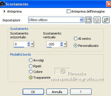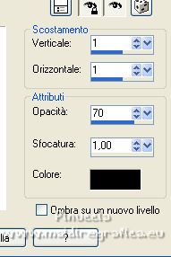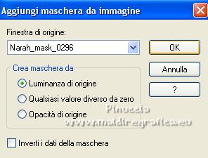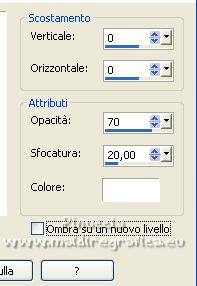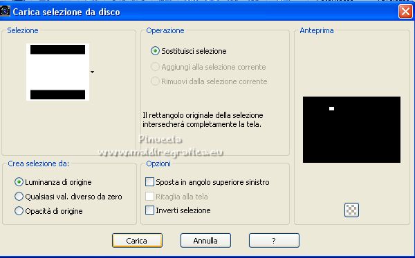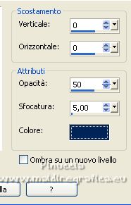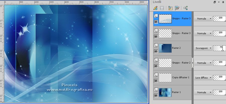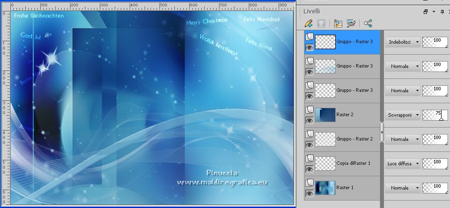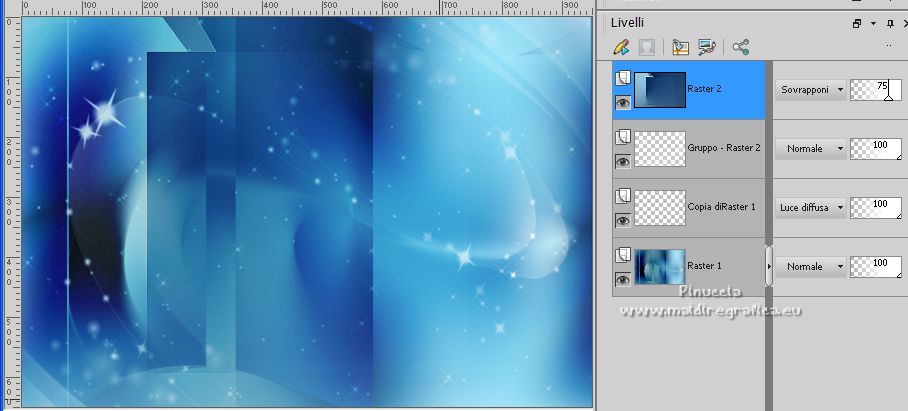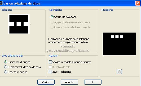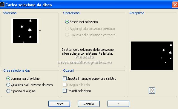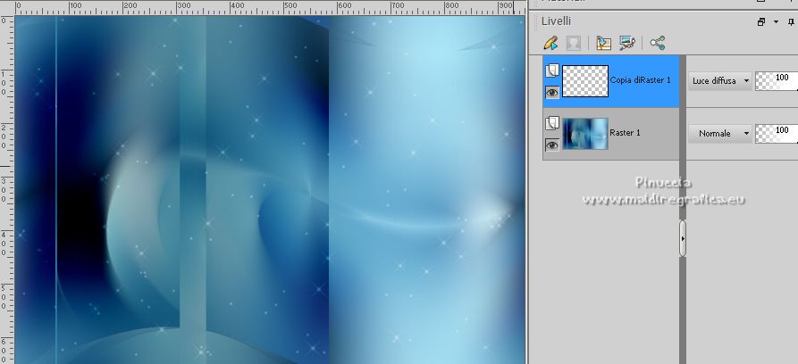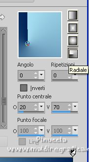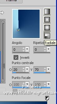 qui puoi trovare qualche risposta ai tuoi dubbi. Se l'argomento che ti interessa non è presente, ti prego di segnalarmelo. Il copyright del tutorial appartiene a Laguna Azul. Questo tutorial è stato creato con PspX9 e tradotto con CorelX e CorelX2, ma può essere realizzato anche con le altre versioni di PSP. Dalla versione X4, il comando Immagine>Rifletti è stato sostituito con Immagine>Capovolgi in orizzontale, e il comando Immagine>Capovolgi con Immagine>Capovolgi in verticale. Nelle versioni X5 e X6, le funzioni sono state migliorate rendendo disponibile il menu Oggetti. Con la nuova versione X7, sono tornati Rifletti>Capovolgi, ma con nuove varianti. Vedi la scheda sull'argomento qui Traduzione francese/traduction en français qui Le vostre versioni quiOccorrente: ![]() Per due maschere grazie Narah. Il resto del materiale è di Laguna Azul (in questa pagina trovi i links ai siti dei creatori di tubes) ![]() in caso di dubbi, ricorda di consultare la mia sezione filtri qui Filters Unlimited 2.0 - versione software qui Filters Unlimited 2.0 - versione in files formato 8bf qui &<Bkg Kaleidoscope> - Cake Mix (da importare in Unlimited) qui AP 01 [Innovations] - Distort-WavyCity qui Alien Skin Eye Candy 5 Impact - Glass, Perspective Shadow qui Alien Skin Eye Candy5 Nature qui Filter Factory Gallery B - Fluttering Flag qui Simple - Quick Tile qui Alien Skin Xenofex 2 - Constellation qui I filtri Factory Gallery e Simple si possono usare da soli o importati in Filters Unlimited (come fare vedi qui) Se un filtro fornito appare con questa icona qui![]() ![]() non esitare a cambiare modalità di miscelatura e opacità secondo i colori utilizzati. Nelle ultime versioni di PSP non c'è il gradiente di primo piano/sfondo (Corel_06_029) Puoi usare i gradienti delle versioni precedenti. Trovi qui i gradienti Corel X. Metti i presets Cliccando sul file una o due volte (a seconda delle tue impostazioni), automaticamente il preset si installerà nella cartella corretta. perché uno o due clic vedi qui Se preferisci, puoi importare direttamente il preset nel corso del tutorial Come fare vedi la scheda del filtro Eye Candy qui ![]() Metti il pennello nella cartella Pennelli. Attenzione, il pennello é composto da due files che non devono essere separati. Vedi gli appunti sui pennelli qui Se hai problemi con il pennello, nel materiale trovi il pennello in jpg, da esportare come Pennello personalizzato (File>Esporta>Pennello personalizzato...) Metti le selezioni (cartella Auswahl) nella cartella Selezioni. Apri le maschere (cartella Masken) in PSP e minimizzale con il resto del materiale. 1. Imposta il colore di primo piano con #a7e0f3, e il colore di sfondo con #002458. ![]() Passa il colore di primo piano a Gradiente di primo piano/sfondo, stile Radiale. ![]() Apri una nuova immagine trasparente 950 x 650 pixels, e riempila con il gradiente.Effetti>Plugins>Filters Unlimited 2.0 - &<Bkg Kaleidoscope> - Cake Mix. ![]() Effetti>Plugins>Simple - Quick Tile. ![]() Effetti>Effetti di bordo>Aumenta. Livelli>Duplica. Immagine>Rifletti. Cambia la modalità di miscelatura di questo livello in Luce diffusa. Livelli>Unisci>Unisci giù. 2. Regola>Sfocatura>Sfocatura radiale. ![]() Effetti>Plugins>AP 01 [Innovations] - Distort-WavyCity. ![]() Effetti>Plugins>Filters Unlimited 2.0 - Filter Factory Gallery B - Fluttering Flag. ![]() Livelli>Duplica. Effetti>Plugins>Alien Skin Xenofex 2 - Constellation. ![]() Cambia la modalità di miscelatura di questo livello in Luce diffusa. ![]() 3. Imposta il colore di primo piano con il colore bianco. Livelli>Nuovo livello raster. Riempi il livello con il colore bianco.Livelli>Nuovo livello maschera>Da immagine. Apri il menu sotto la finestra di origine e vedrai la lista dei files aperti. Seleziona la maschera Narah_Mask_0821. ![]() Livelli>Unisci>Unisci gruppo. Imposta nuovamente il colore di primo piano con il colore #a7e0f3 e il gradiente Radiale con gli stessi settaggi, ma Inverti selezionato .Livelli>Nuovo livello raster. Riempi il livello con il gradiente.Effetti>Plugins>Filters Unlimited 2.0 - Filter Factory Gallery B - Button Deluxe, con i settaggi standard. ![]() Effetti>Effetti di bordo>Aumenta. Cambia la modalità di miscelatura di questo livello in Sovrapponi, e abbassa l'opacità al 75%. ![]() 4. Imposta il colore di primo piano con il colore bianco. Livelli>Nuovo livello raster. Riempi il livello con il colore bianco.Livelli>Nuovo livello maschera>Da immagine. Apri il menu sotto la finestra di origine e seleziona la maschera LA_Mask(155). ![]() Livelli>Unisci>Unisci gruppo. Imposta nuovamente il colore di primo piano con il colore #a7e0f3. ![]() Livelli>Nuovo livello raster. Riempi il livello con il colore di primo piano.Livelli>Nuovo livello maschera>Da immagine. Apri il menu sotto la finestra di origine e seleziona la maschera Narah_Mask_0296. ![]() Livelli>Unisci>Unisci gruppo. Immagine>Rifletti. Immagine>Capovolgi. Effetti>Effetti di immagine>Scostamento. ![]() Effetti>Effetti 3D>Sfalsa ombra, colore di sfondo. ![]() Dovresti avere questo: ![]() 5. Imposta nuovamente il colore di primo piano con il colore bianco. Livelli>Nuovo livello raster. Riempi il livello con il colore bianco.Livelli>Nuovo livello maschera>Da immagine. Apri il menu sotto la finestra di origine e seleziona la maschera LA_Mask(157). ![]() Livelli>Unisci>Unisci gruppo. Effetti>Effetti 3D>Sfalsa ombra, colore nero. ![]() Cambia la modalità di miscelatura di questo livello in Indebolisci, o secondo i tuoi colori. ![]() 6. Apri il tube LA_white fir trees 1 e vai a Modifica>Copia.Torna al tuo lavoro e vai a Modifica>Incolla come nuovo livello. Spostalo nell'angolo in basso a sinistra.![]() Effetti>Effetti 3D>Sfalsa ombra, colore bianco. ![]() Apri il tube LA_Deco 1 ![]() e vai a Modifica>Copia. Torna al tuo lavoro e vai a Modifica>Incolla come nuovo livello. Effetti>Effetti di immagine>Scostamento. ![]() 7. Apri il tube LA_sled e vai a Modifica>Copia.Torna al tuo lavoro e vai a Modifica>Incol
